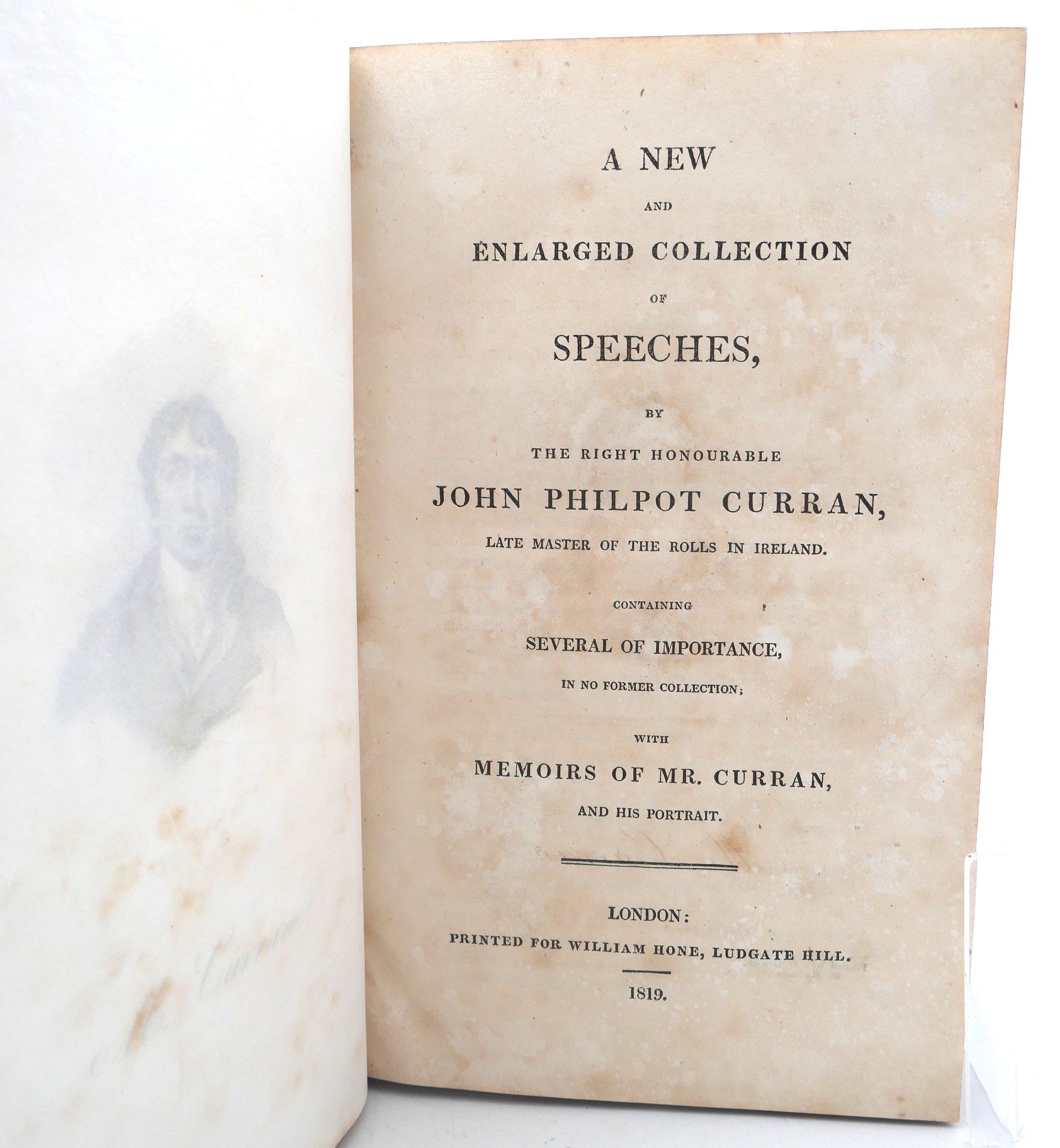 A New and Enlarged Collection of Speeches. By the Right Honourable John Philpot Curran, late Master of the rolls in Ireland. Containing several of importance, in no former collection with memoirs of Mr. Curran and his Portrait. London: William Hone, 1819. First Edition. Pp xxiv, 344. Early half morocco over marbled boards, marbled endpapers & fore-edges; spine lettered & embellished in gilt. A nice bright copy.