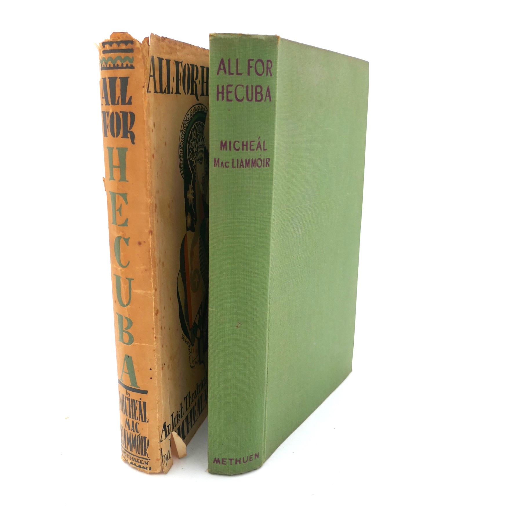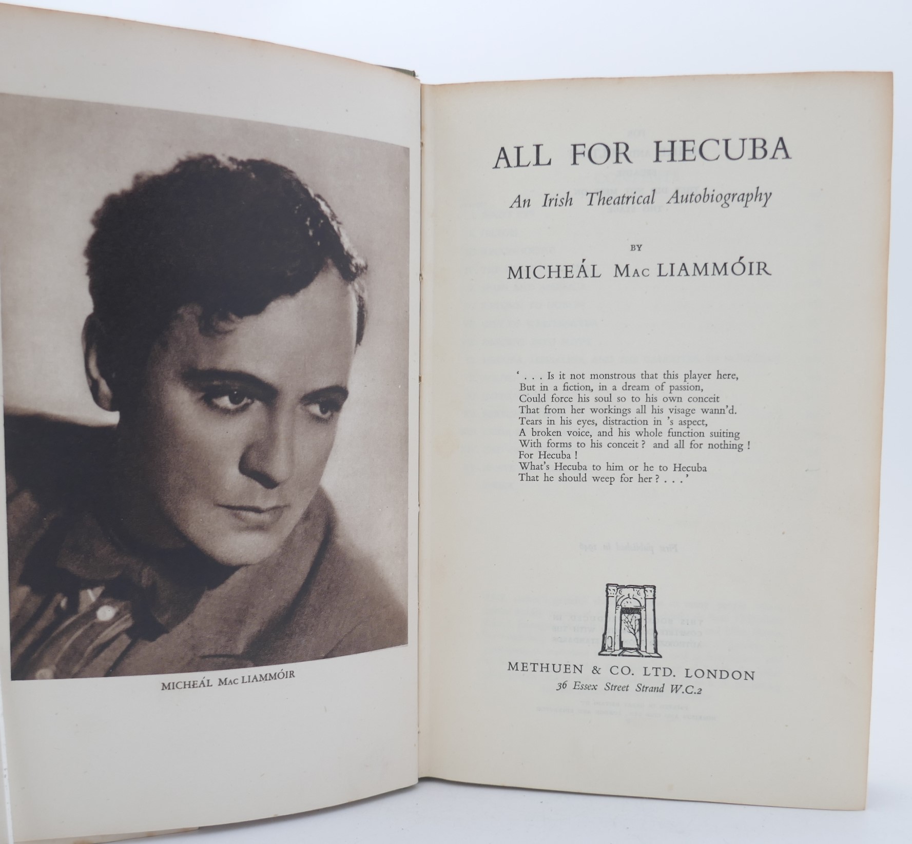 All For Hecuba. An Irish Theatrical Autobiography. London: Methuen, 1946. First Edition. Pp vi, 390. Green cloth boards, in pictorial dust jacket. Jacket browned & chipped, otherwise a nice copy.