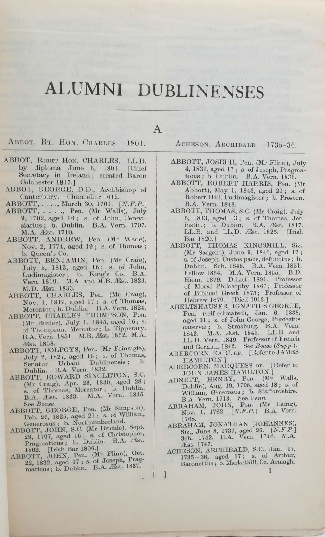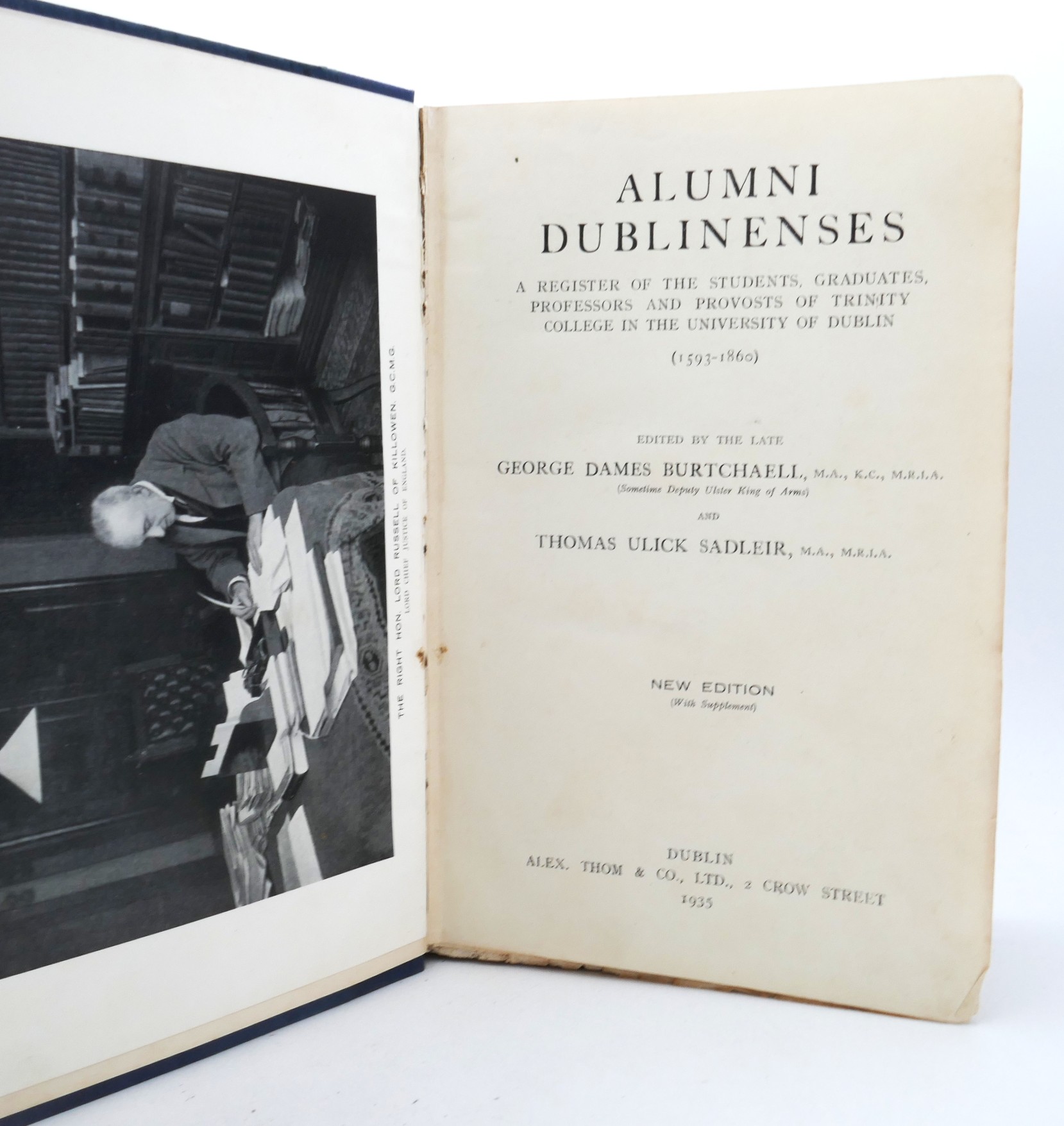 Alumni Dublinenses. A Register of the Students, Graduates, Professors, and Provosts of Trinity College, in the University of Dublin (1593-1860). New Edition (with Supplement). London: Williams, 1935. Second Edition. Pp xiii, 905, [148]. Quarter cloth boards, title in gilt to spine. Covers lightly worn, contents in very good condition.