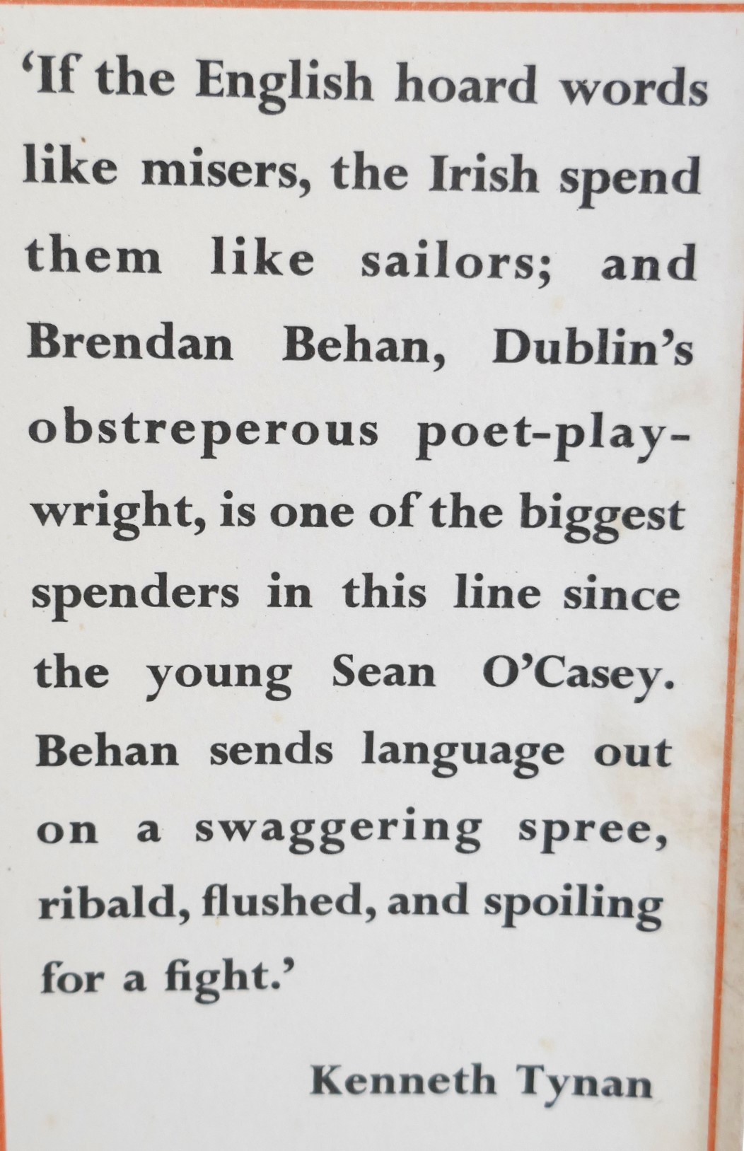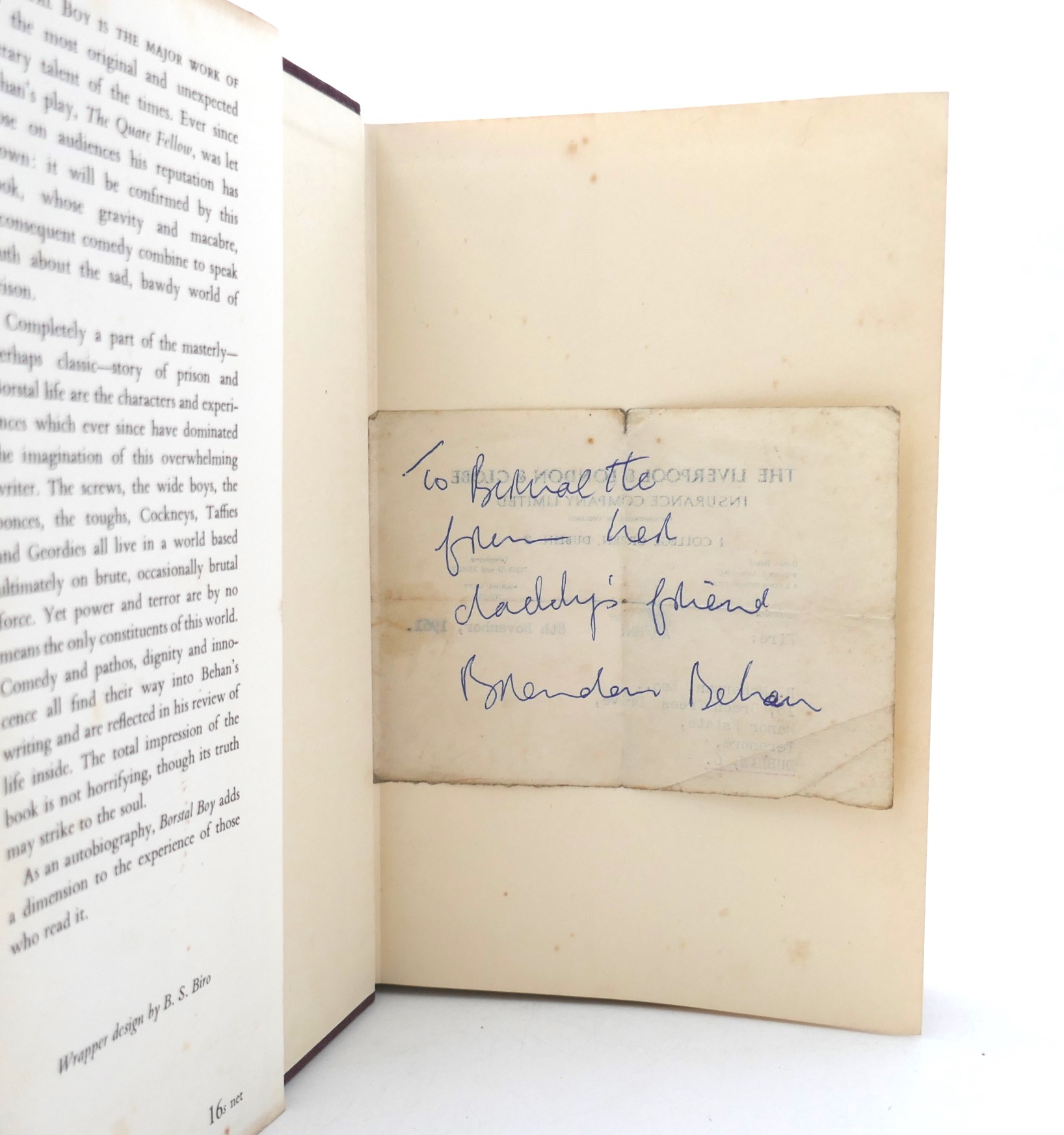 Inscribed by Behan on note pasted to front free endpaper: “To Bernadette, from her daddy’s friend, Brendan Behan.”