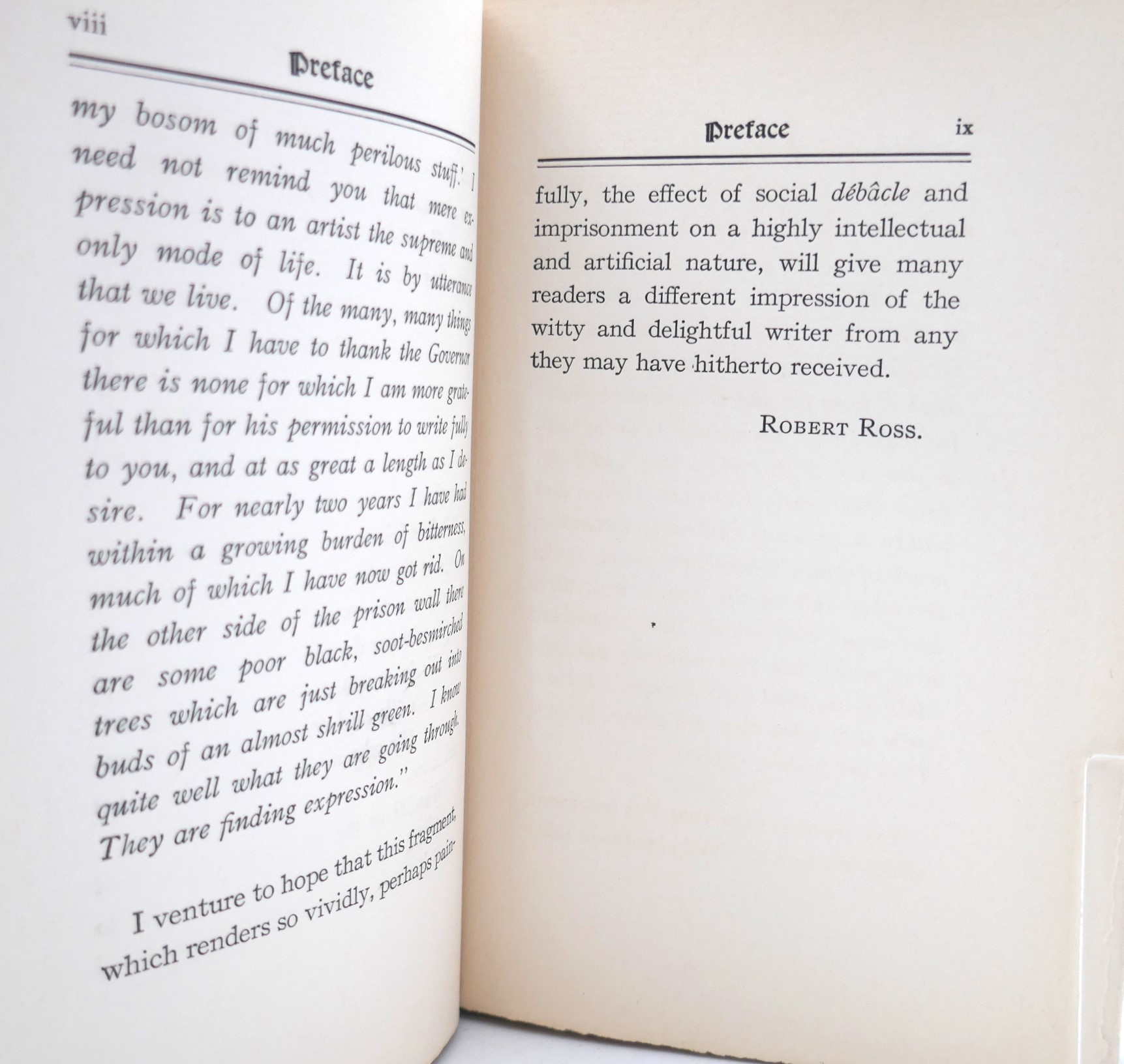 De Profundis. New York: Putnam’s Sons, 1905. First American Edition. Pp vii, 123, uncut. Quarter blue buckram with light blue-grey paper on the boards and spine edge. A nice bright copy.