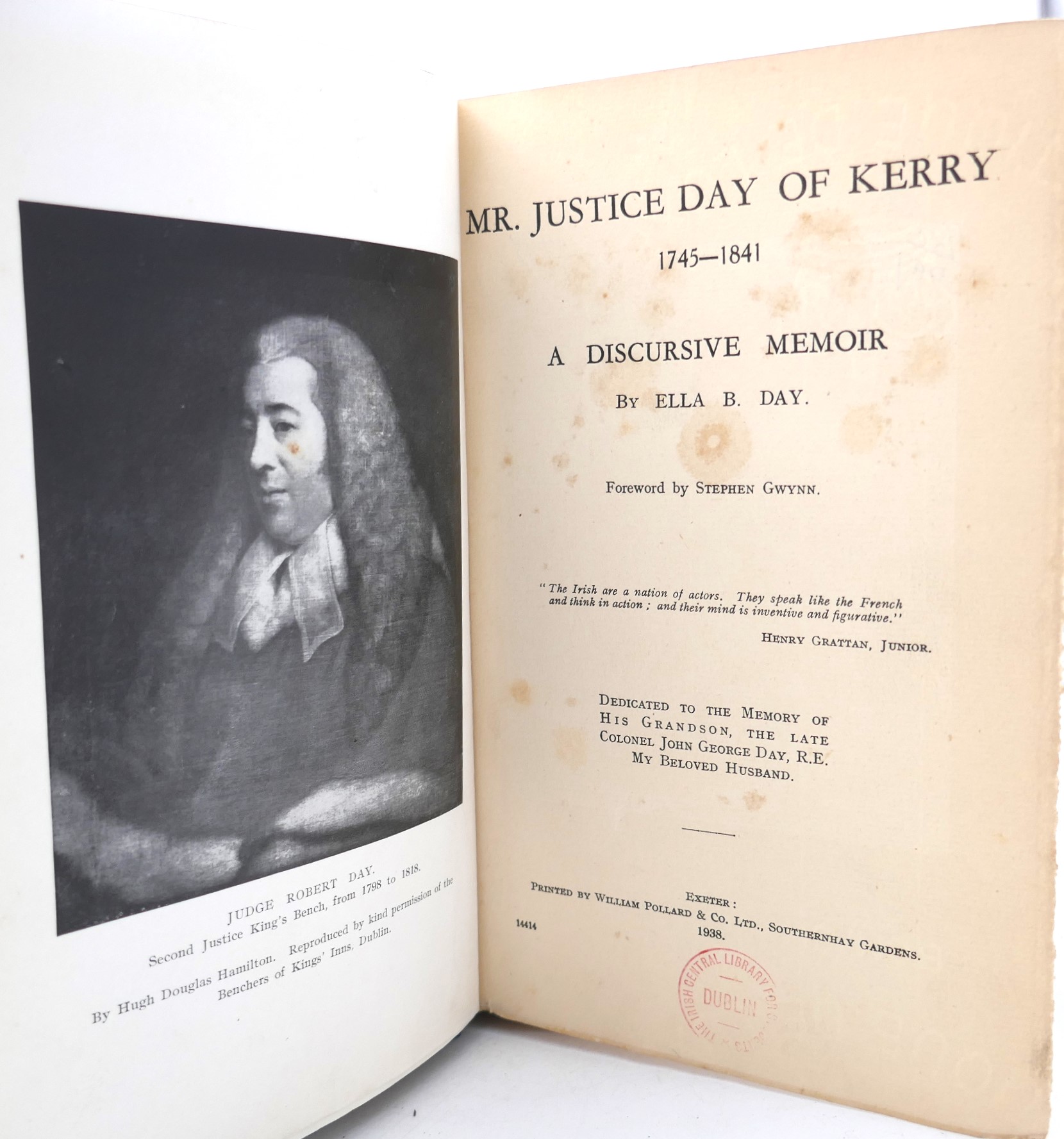 Mr. Justice Day of Kerry 1745 – 1841. Foreword by Stephen Gwynn. Exeter: W. Pollard, 1938. First Edition. Pp xix, 311, uncut. Ex library copy, with ink stamps & with occasional label residue to endpapers. Rebound in blue cloth boards, title in gilt to spine. A very good copy.