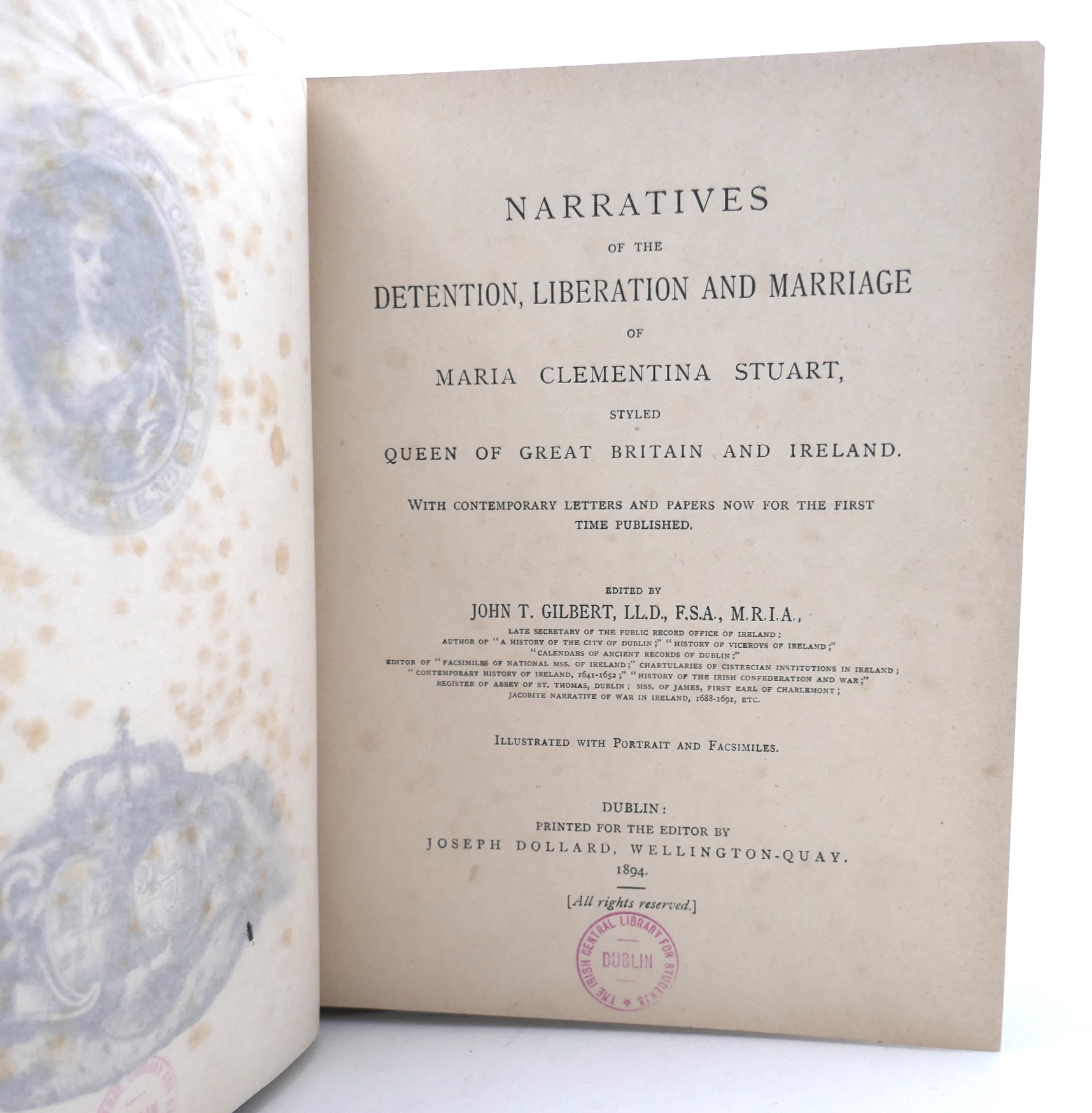 Narratives of the Detention, Liberation and Marriage of Maria Clementina Stuart, styled Queen of Great Britain and Ireland. With contemporary letters and papers and papers now for the first time published. Dublin: Printed by Joseph Dollard, 1894. First Edition. Pp xii, 207. Ex library copy, with stamps. Rebound in quarter cloth boards. A very good copy.