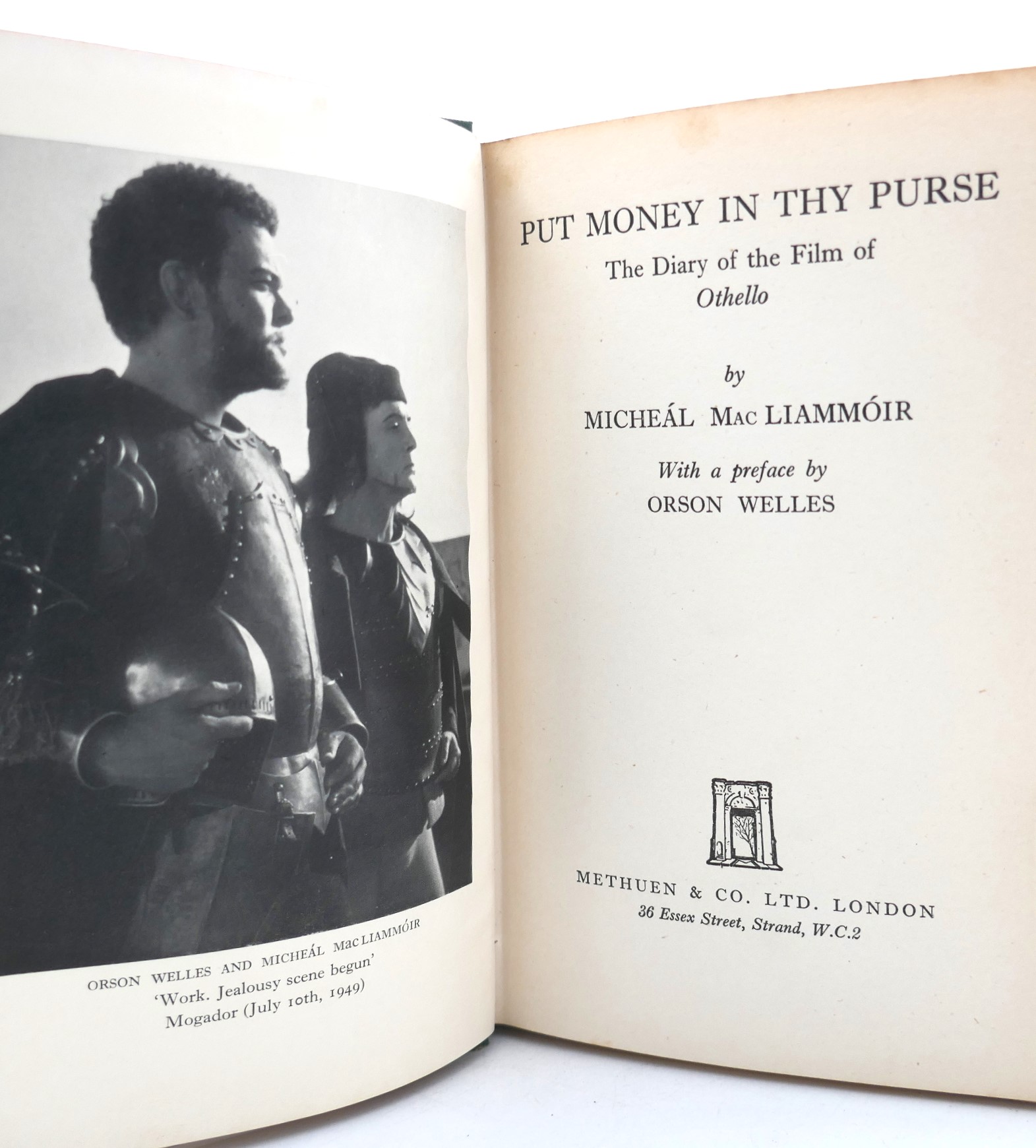 Put Money in Thy Purse. The Diary of the Film of Othello. With a Preface by Orson Welles. London: Methuen, 1952. First Edition. Po xii, 258. Illustrated with plates. Green buckram, with scarce original dust jacket, which is frayed along edges.