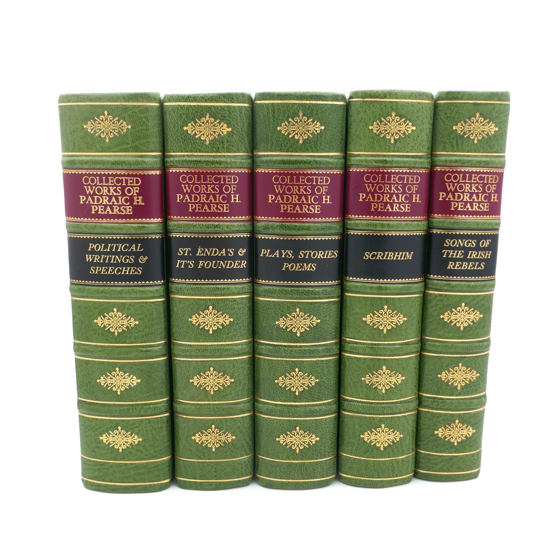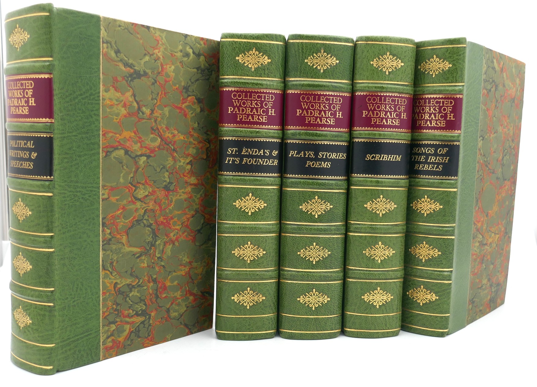 The Collected Works of P.H. Pearse. Five Volumes: Plays Poems and Stories; St. Enda and Its Founders; Songs of the Irish Rebels; Scribhini (Gaelic writings); Political Writings and Speeches. Dublin: Phoenix Publishing Co., [1925]. Uniformly bound in quarter green morocco, over marbled paper boards, spine with ruled bands, compartments ruled & embellished in gilt; title labels to second & third. A fine bright set, handsomely bound