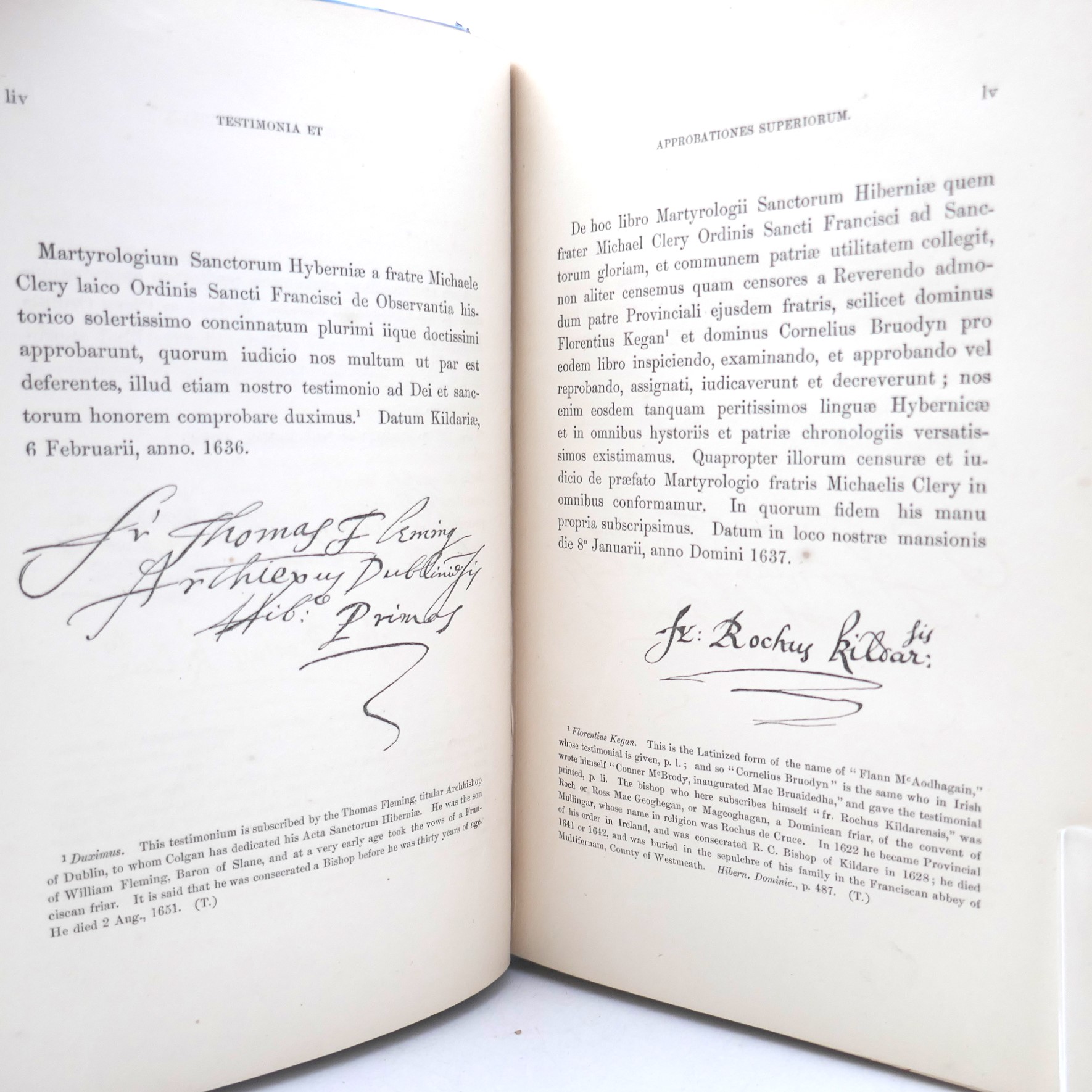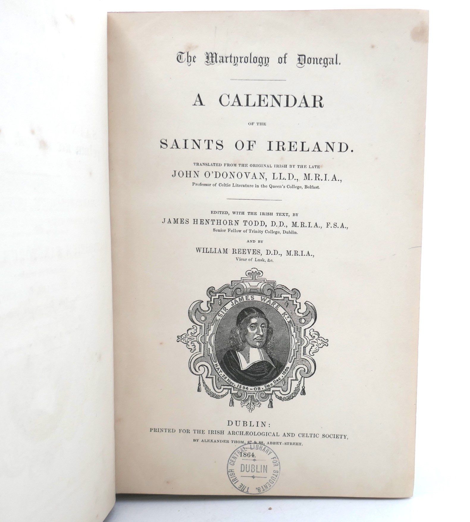 The Martyrology of Donegal. A Calendar of the Saints of Ireland. Translated from the Original Irish by the Late John O’Donovan. Edited, with the Irish Text by James Henthorn Todd and by William Reeves. Dublin: Irish Archaeological & Celtic Society, 1864. Pp [lv], 566, [vii], 12. Large 8vo. Ex library copy with stamps, in library binding of quarter blue leather over cloth boards, title and library number lettered in gilt to spine. A very good copy.