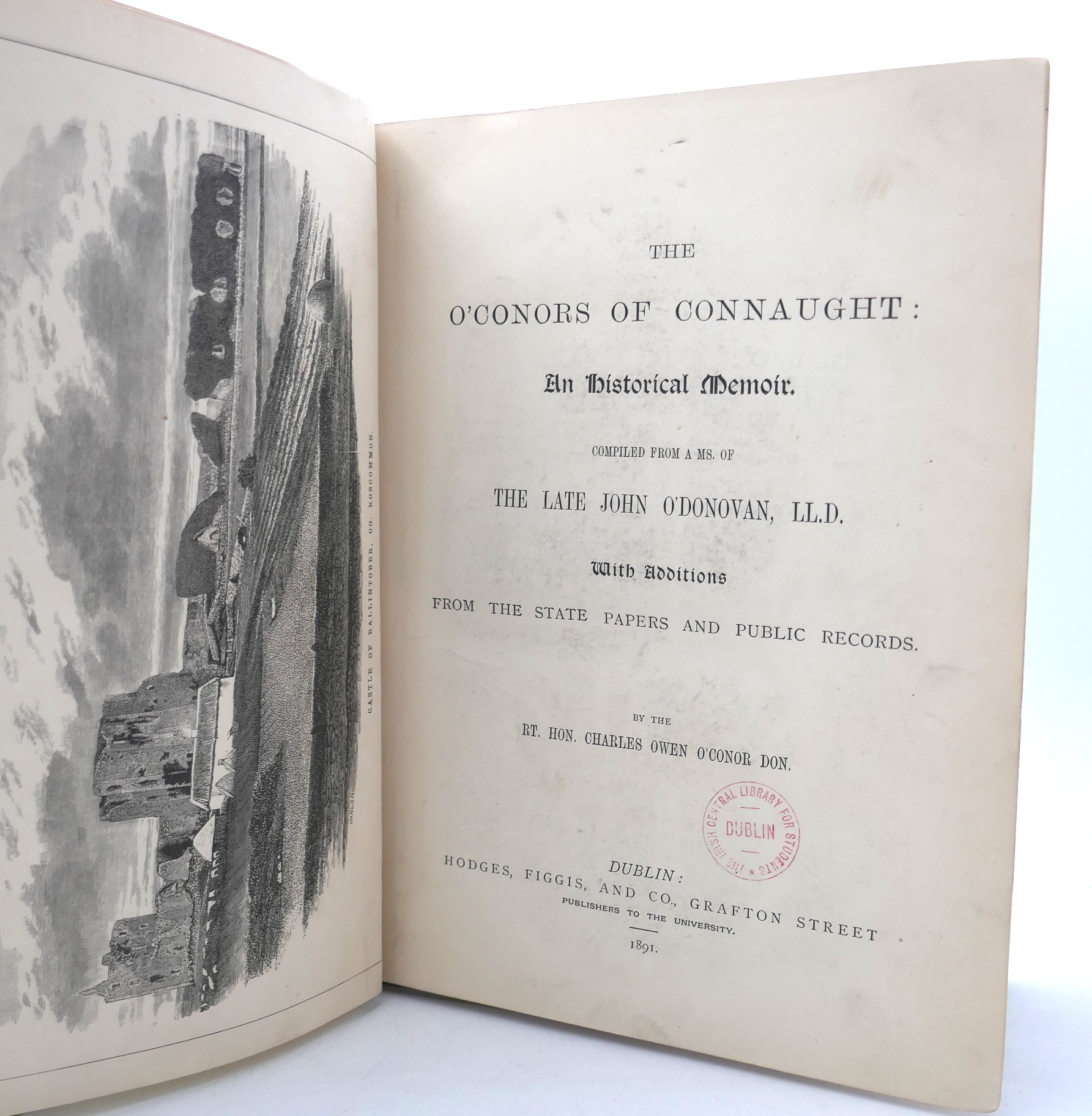 The O’Connors of Connaught. An Historical Memoir. Compiled from as Ms. Of the late John O’Donovan, LLD. With Notes from the State Papers and Public Records. Dublin: Figgis, 1891. First Edition. Pp [24], 395. Ex library copy, with stamps. Rebound in green cloth boards, title in gilt to spine. A nice bright copy.