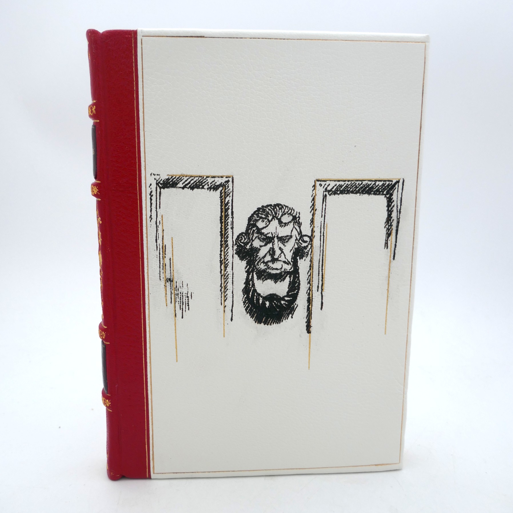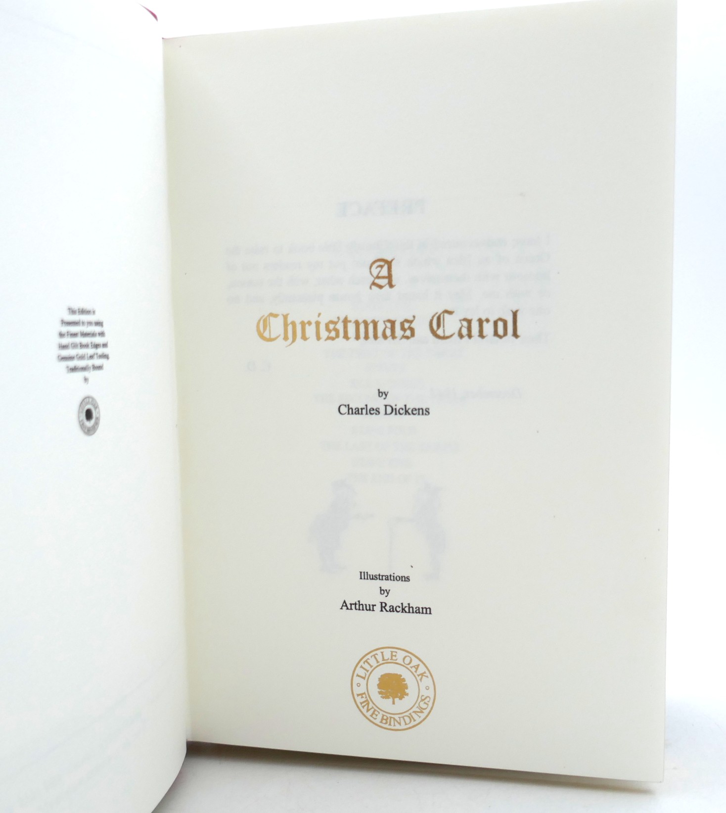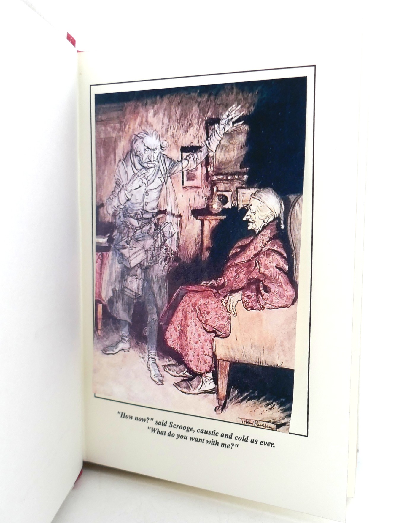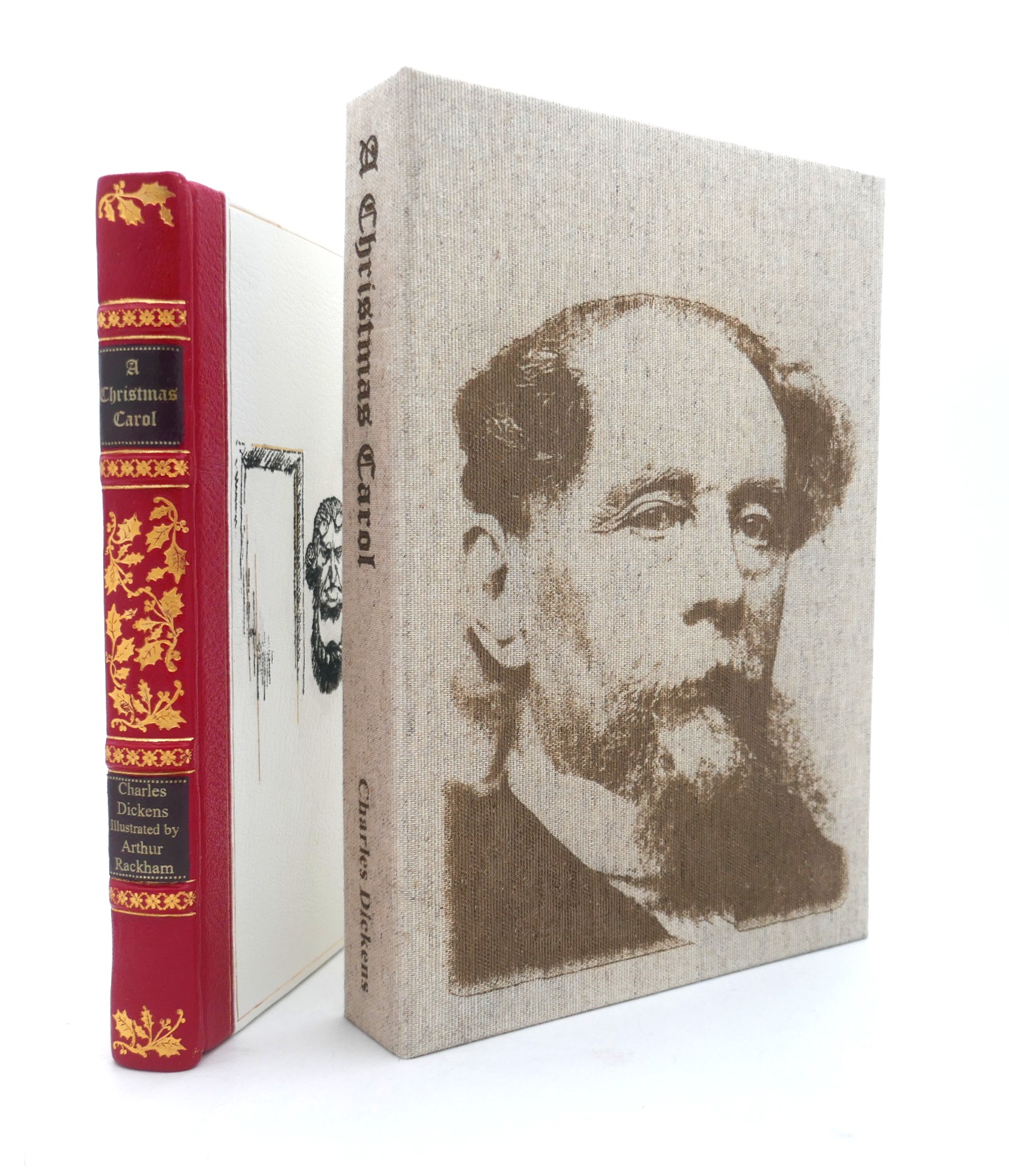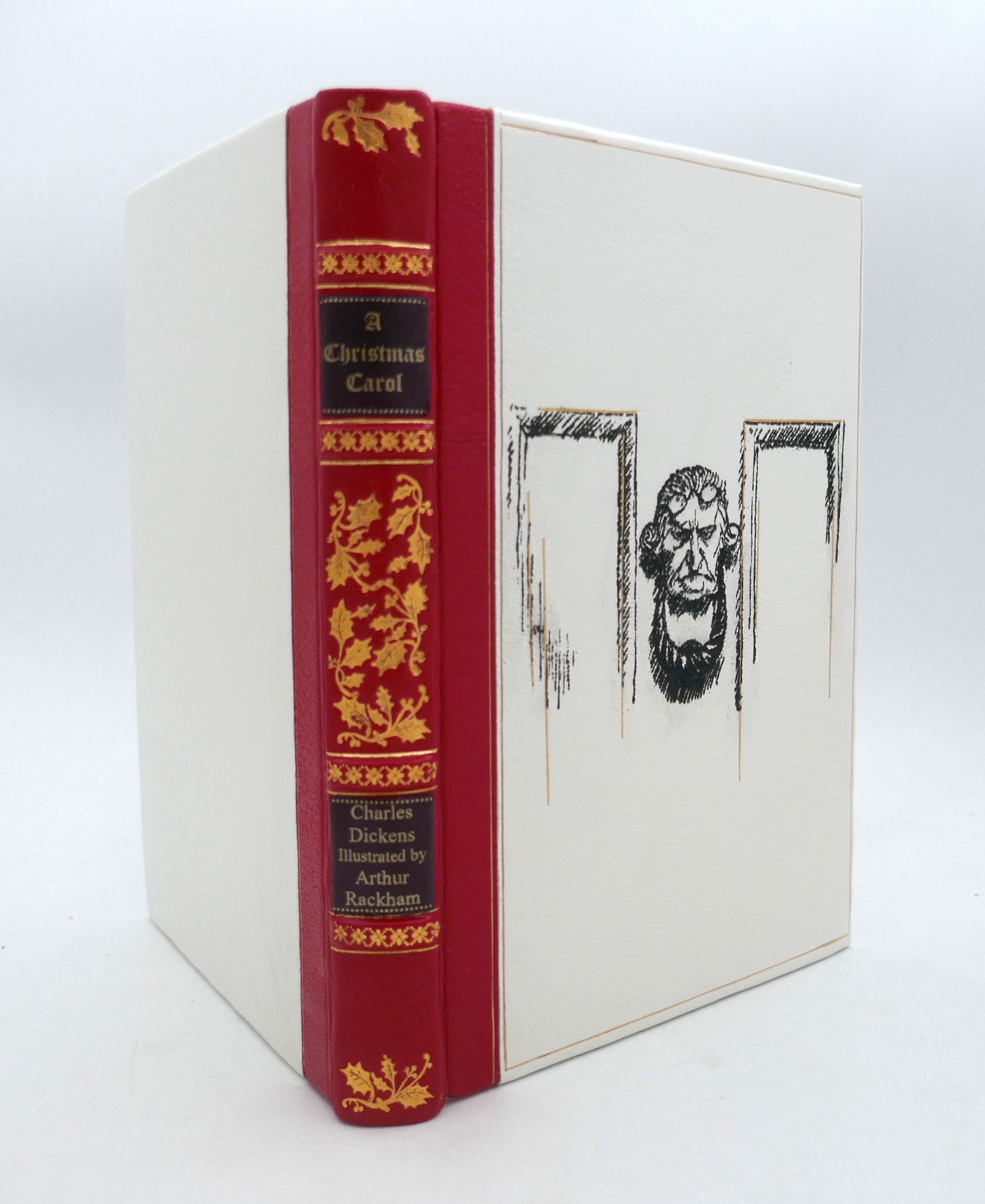 A Christmas Carol. Illustrated by Arthur Rackham. Dublin: Little Oak Fine Bindings, 2021. Facsimile Edition Privately Printed. A beautiful hand crafted gift edition, bound in quarter red leather over pictorial white leather boards. Spine with raised bands, compartments with title labels & holly motif stamped in gilt. Housed in a cloth solander box.