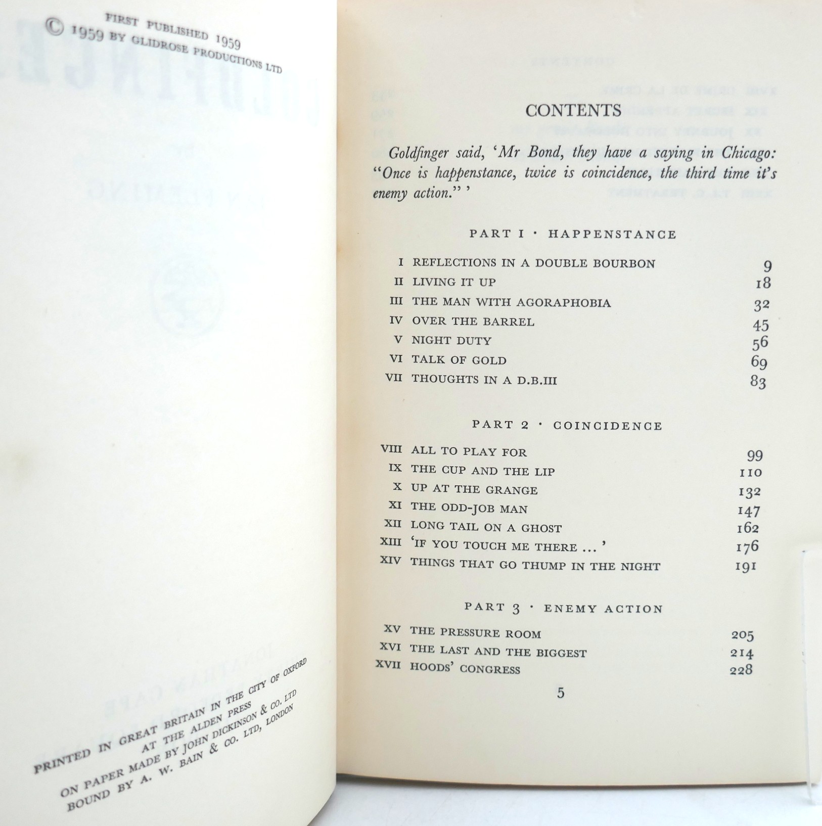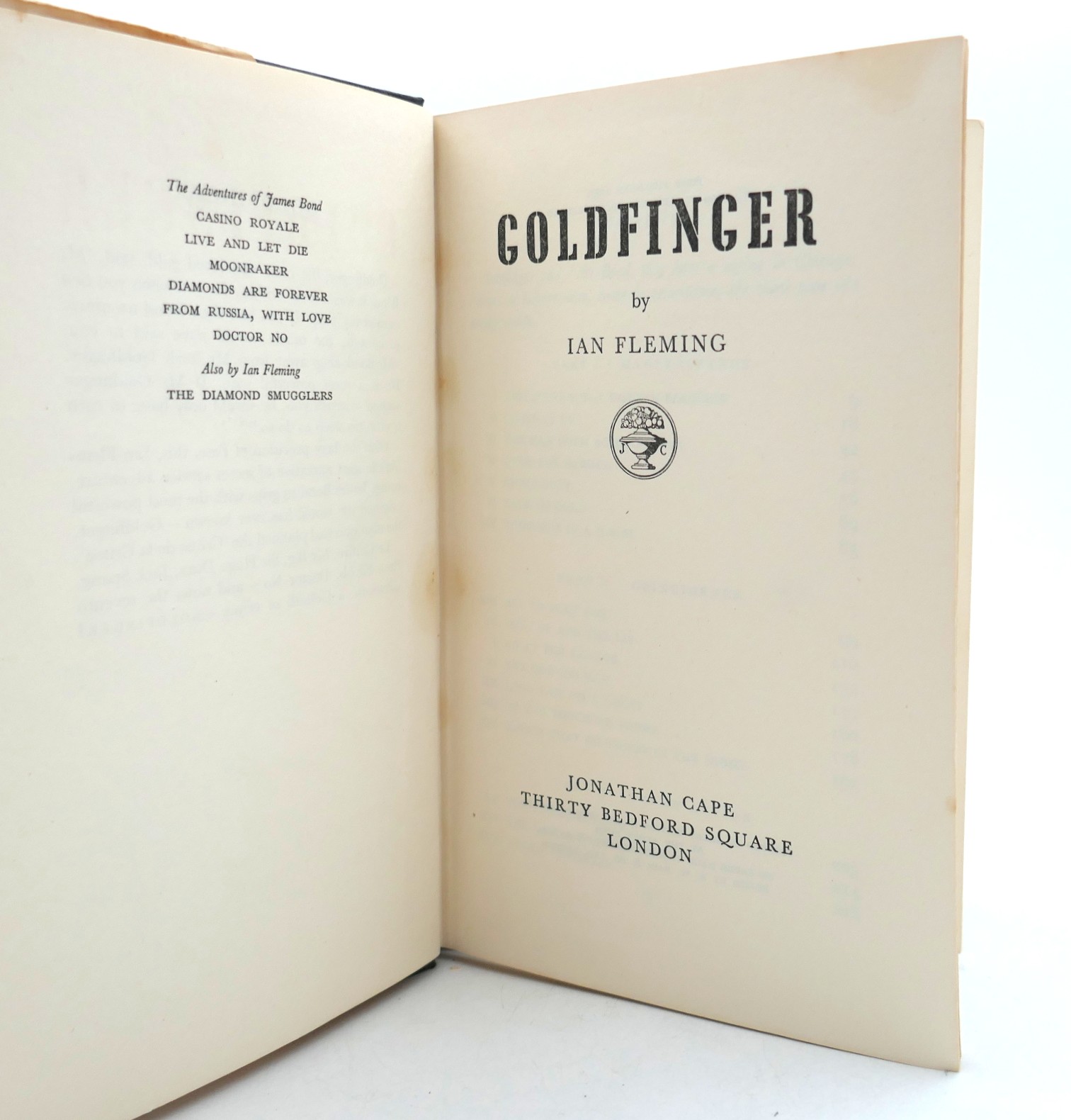The binding of Goldfinger is unusual within the first edition Bond series. Jonathan Cape produced it with a striking design feature: a skull blind-stamped into the front board, with two metallic gold paper “coins” affixed to the eye sockets. This design was a direct reference to the novel’s central plot device—the gold-hoarding Auric Goldfinger and his obsession with the corporeal weight of precious metal.