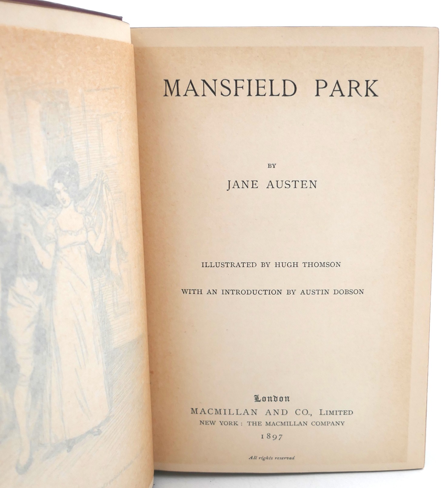 Mansfield Park. Illustrated by Hugh Thomson and with an Introduction by Austin Dobson. London: Macmillan, 1897. First Edition Thus. Pp, 429. Maroon cloth boards, richly decorated in floral motif, with title lettered on upper cover & spine. Peacock pictorial endpapers. All edges in gilt. A fine bright copy.
