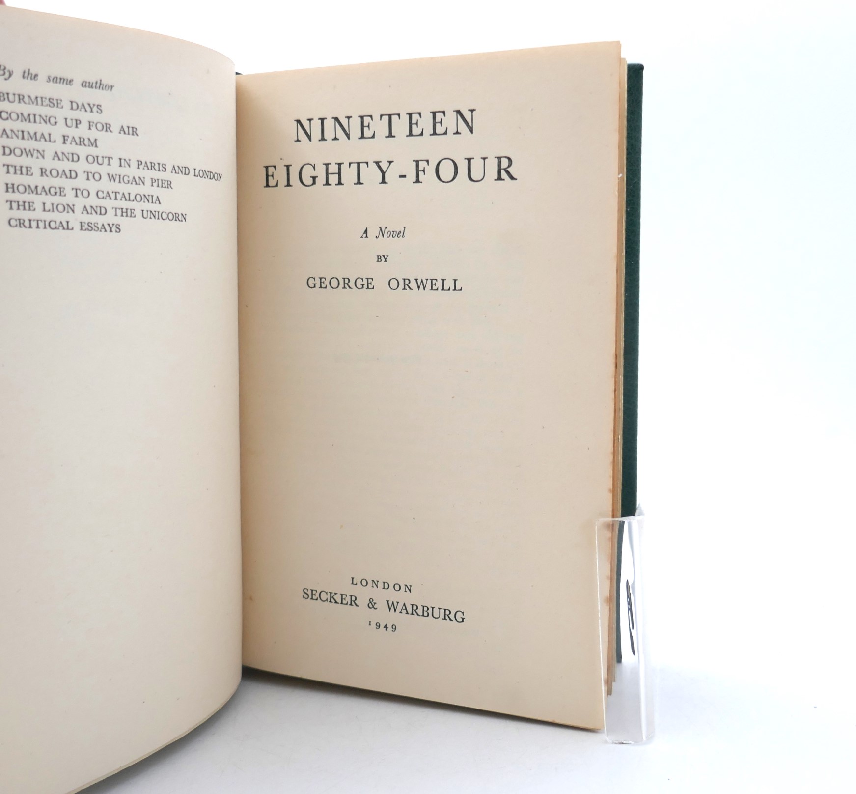 Nineteen Eighty-Four. London: Secker and Warburg, 1949. First Edition. 8vo. Bound in recent leather binding of full dark green morocco. Spine with raised bands, compartments ruled, decorated and lettered in gilt. Gilt ruled border on boards, top edge gilt. A fine bright copy, handsomely bound.