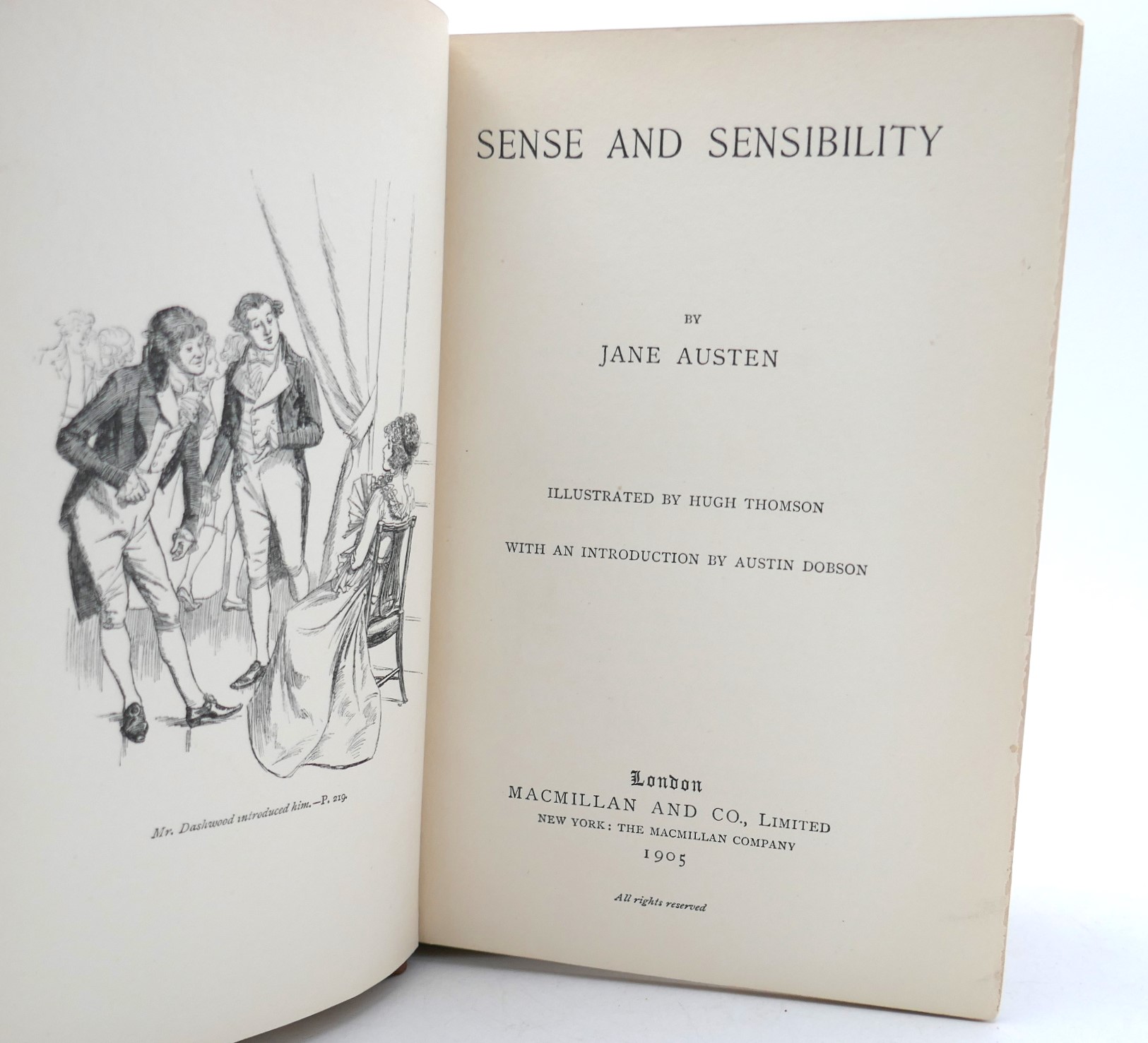 Sense and Sensibility. Illustrated by Hugh Thomson, with an Introduction by Austin Dobson. London: Macmillan, 1905. Sixth Edition. Pp xvi, 341. Handsomely bound in half calf, over marbled boards, spine with raised bands, gilt decoration & title to spine, top edge in gilt. Housed in cloth slipcase.