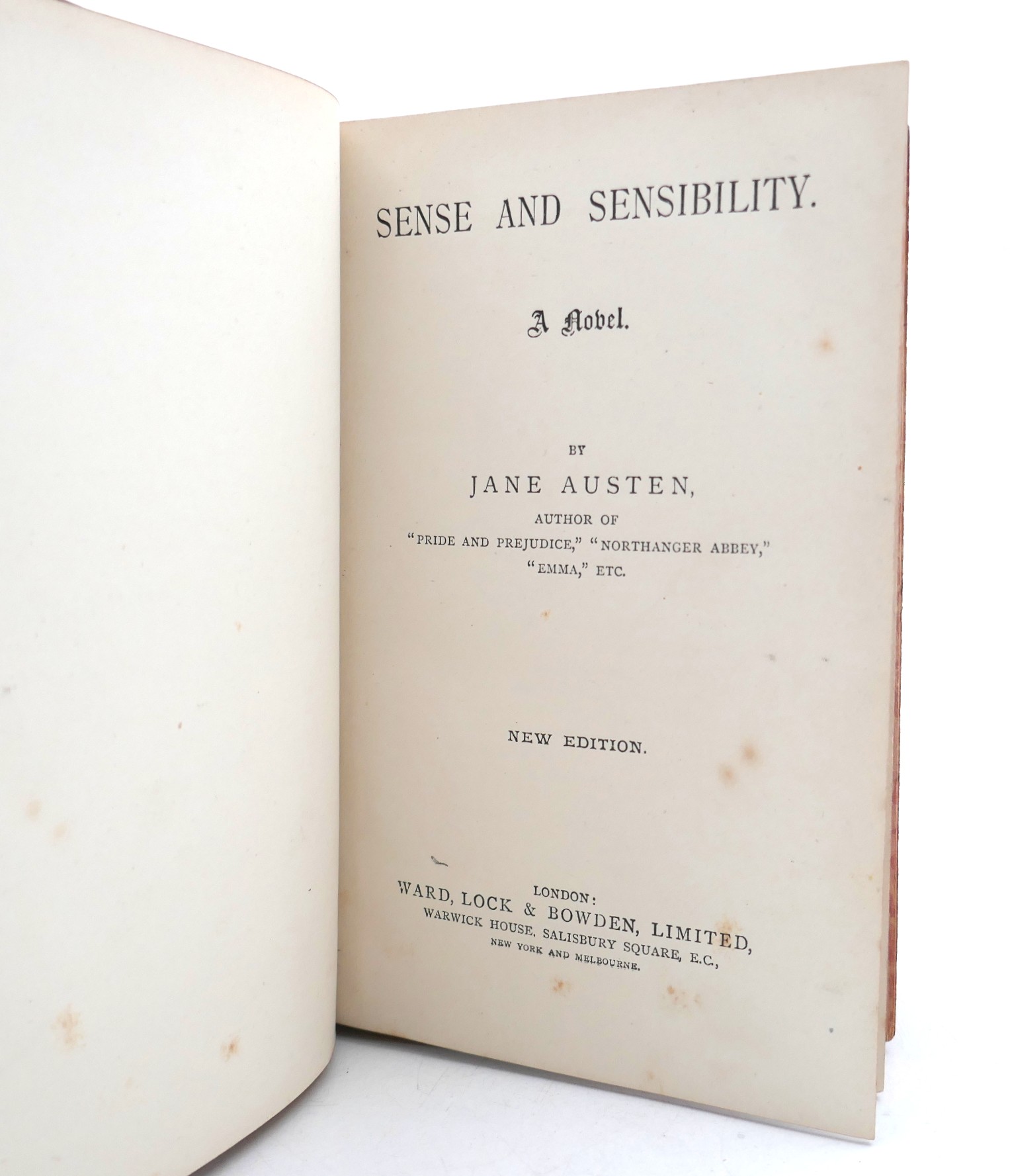 Sense and Sensibility. A Novel. New Edition. London: Ward, Lock & Co., (1885). 440. Publisher’s half calf and cloth boards with gilt lettering & decoration to spine. A nice bright copy.