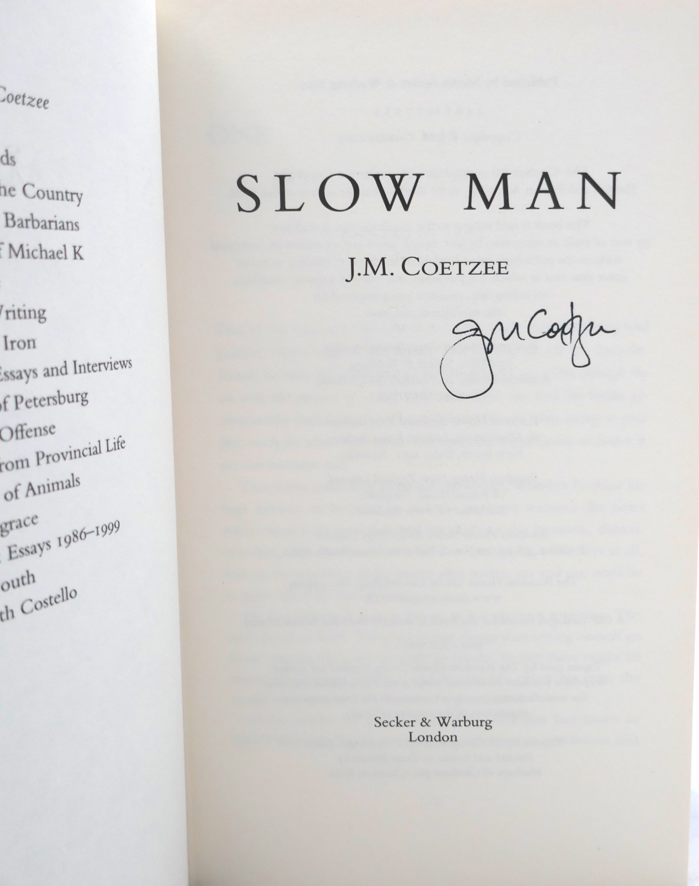 Slow Man. London: Secker & Warburg, 2005. First Edition. A fine bright copy in pictorial dust jacket.