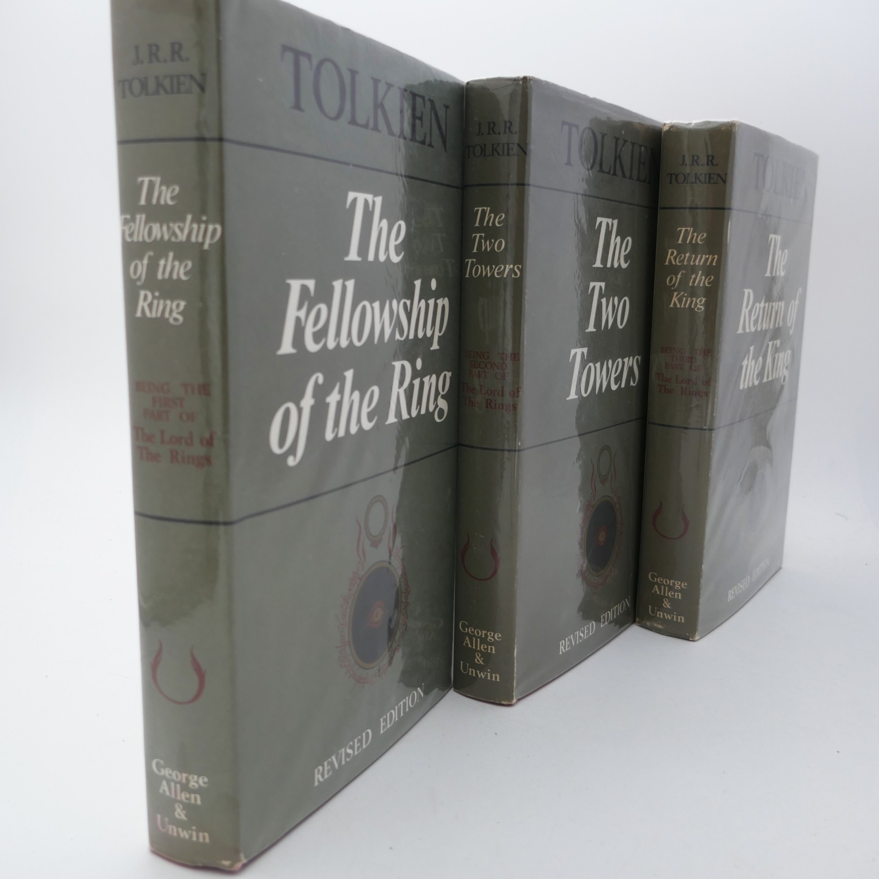 The Lord of The Rings Trilogy. The Fellowship of the Ring; The Two Towers; The Return of The King. London: G. Allen, 1969, 1969. Second Edition, Third & Fourth Impression Set. Red cloth covers, title in gilt to spines, in distinctive illustrated dust jackets. Dust jacket to first price-clipped with tape residue marks to flaps; otherwise a nice bright set.