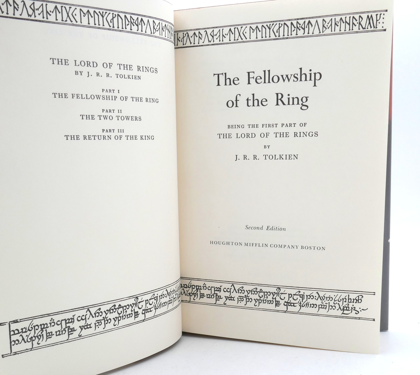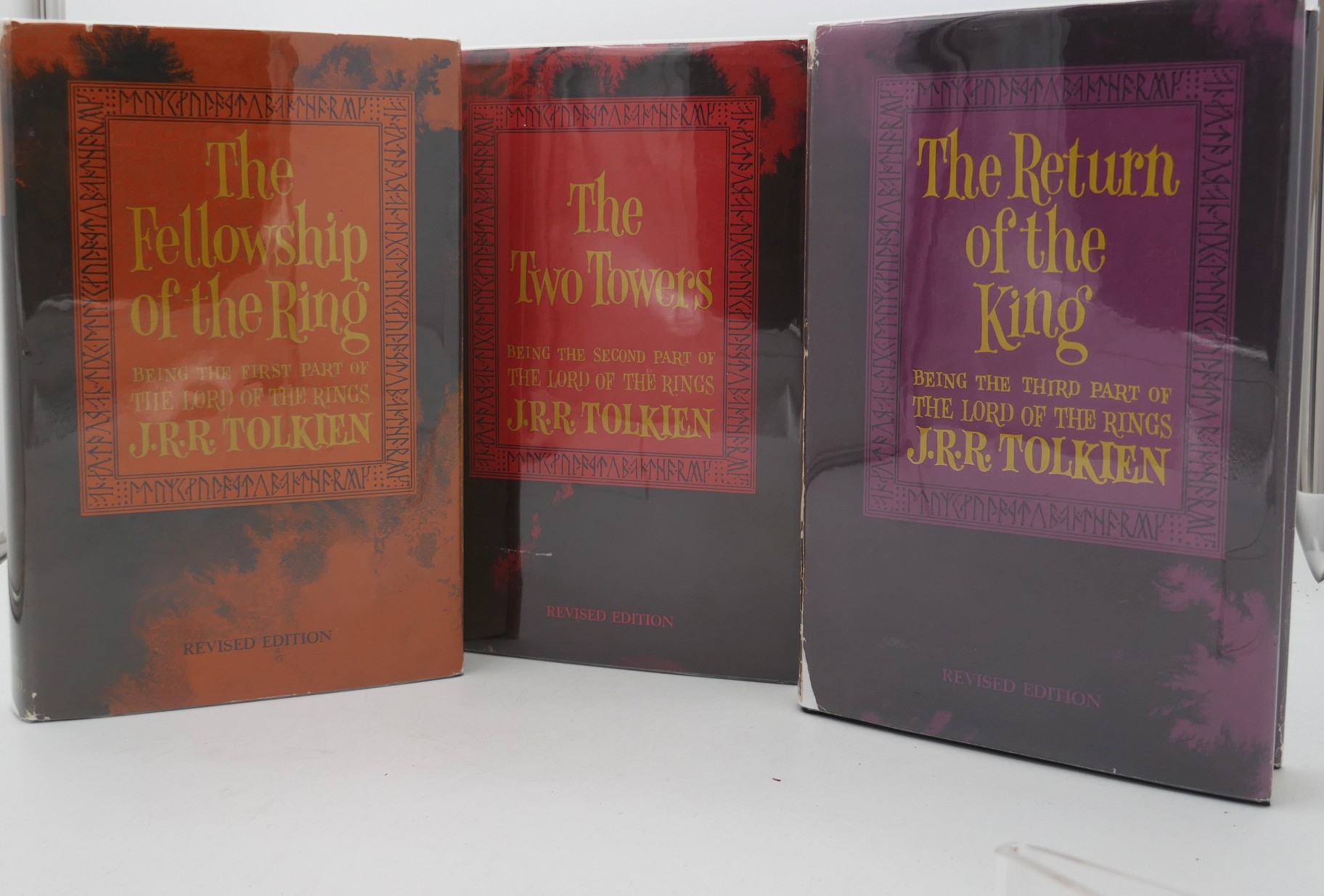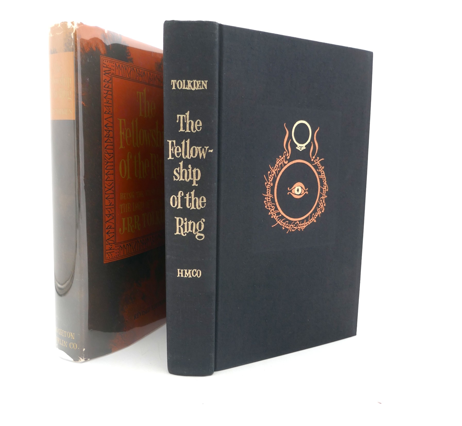 The Lord of the Rings Trilogy. New York: Houghton Mifflin Company, 1965. Second Edition; Mixed Impressions. Black cloth boards, in pictorial dust jackets. A little loss to head of jackets, otherwise a fine bright set. Housed in publisher’s slipcase.