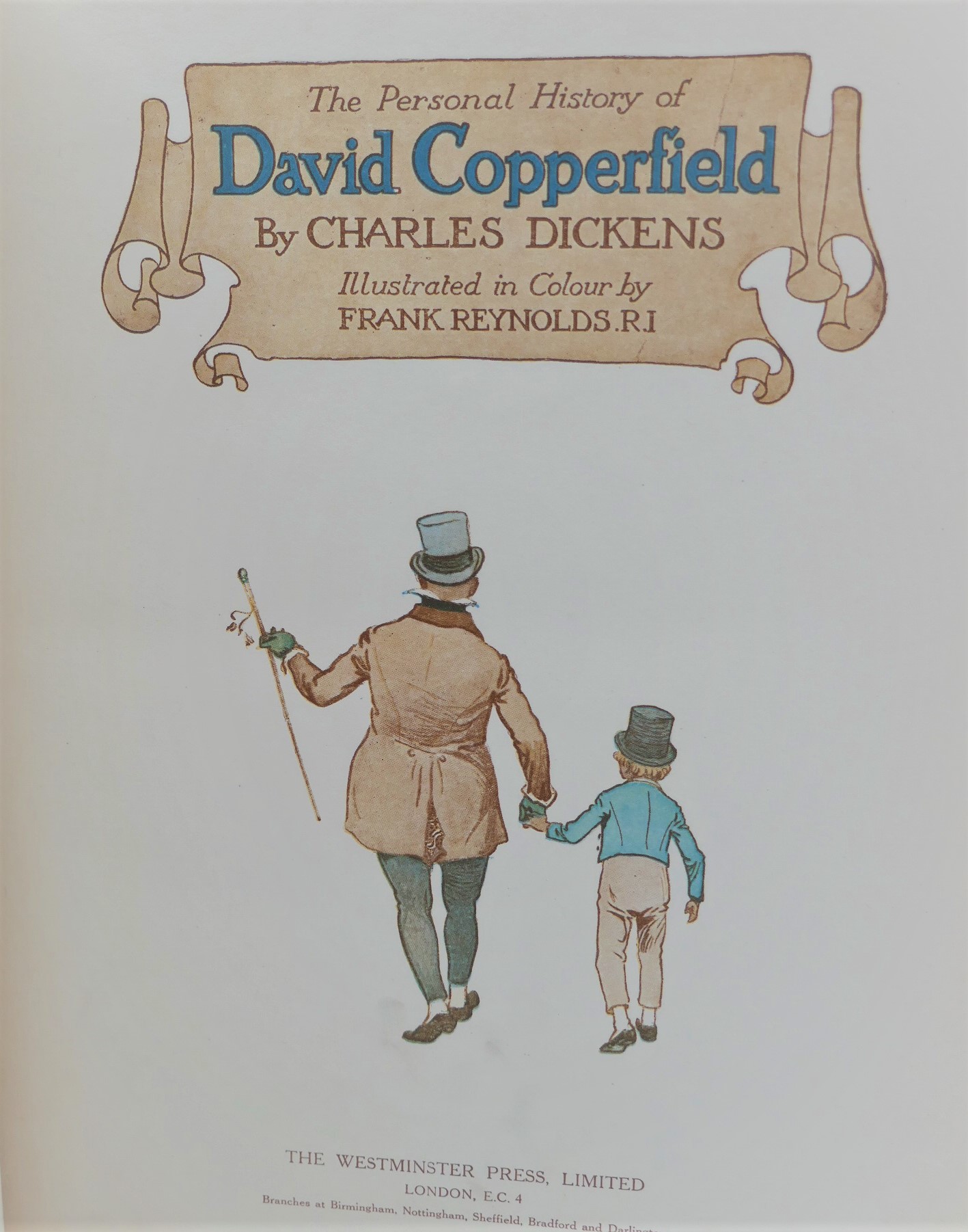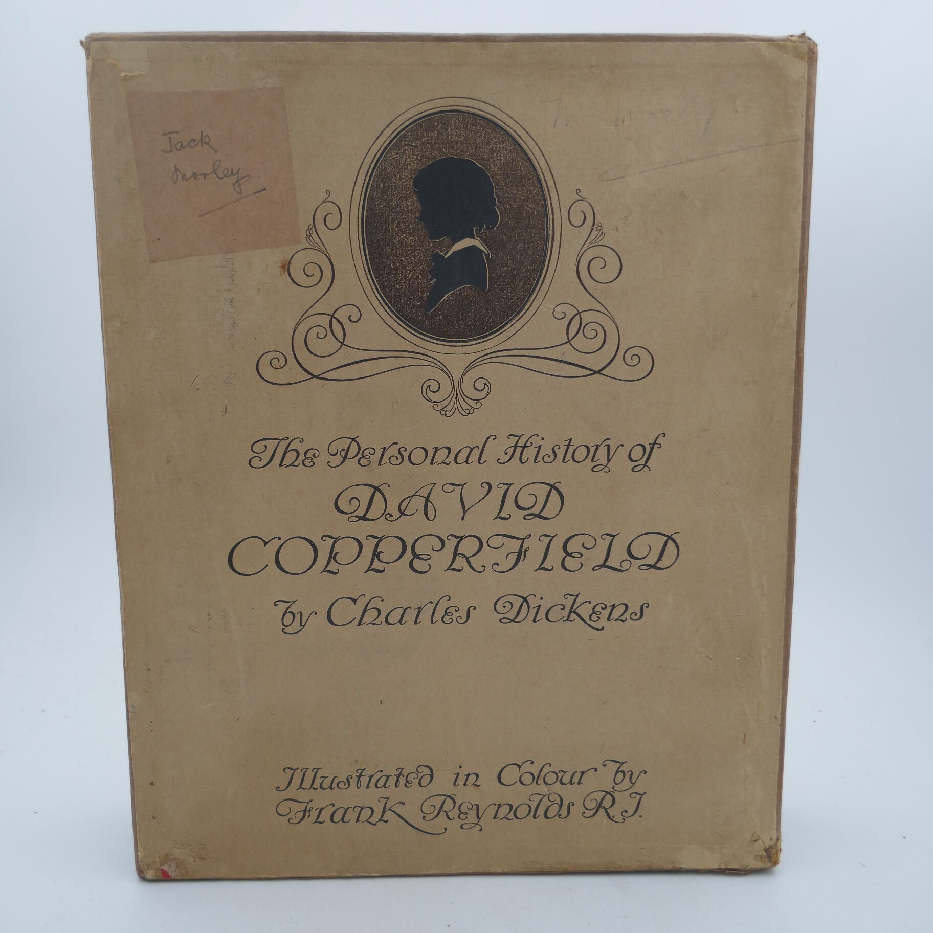 The Personal History of David Copperfield. Illustrated in Colour by Frank Reynolds. London: Hodder & Stoughton, (1910). First Edition Thus. Publisher’s original red cloth, upper board elaborately blocked and lettered in gilt and black, section of front free endpaper cut out, otherwise a fine bright copy. Housed in original publisher’s presentation box. with school prize bookplate to front free endpaper.
