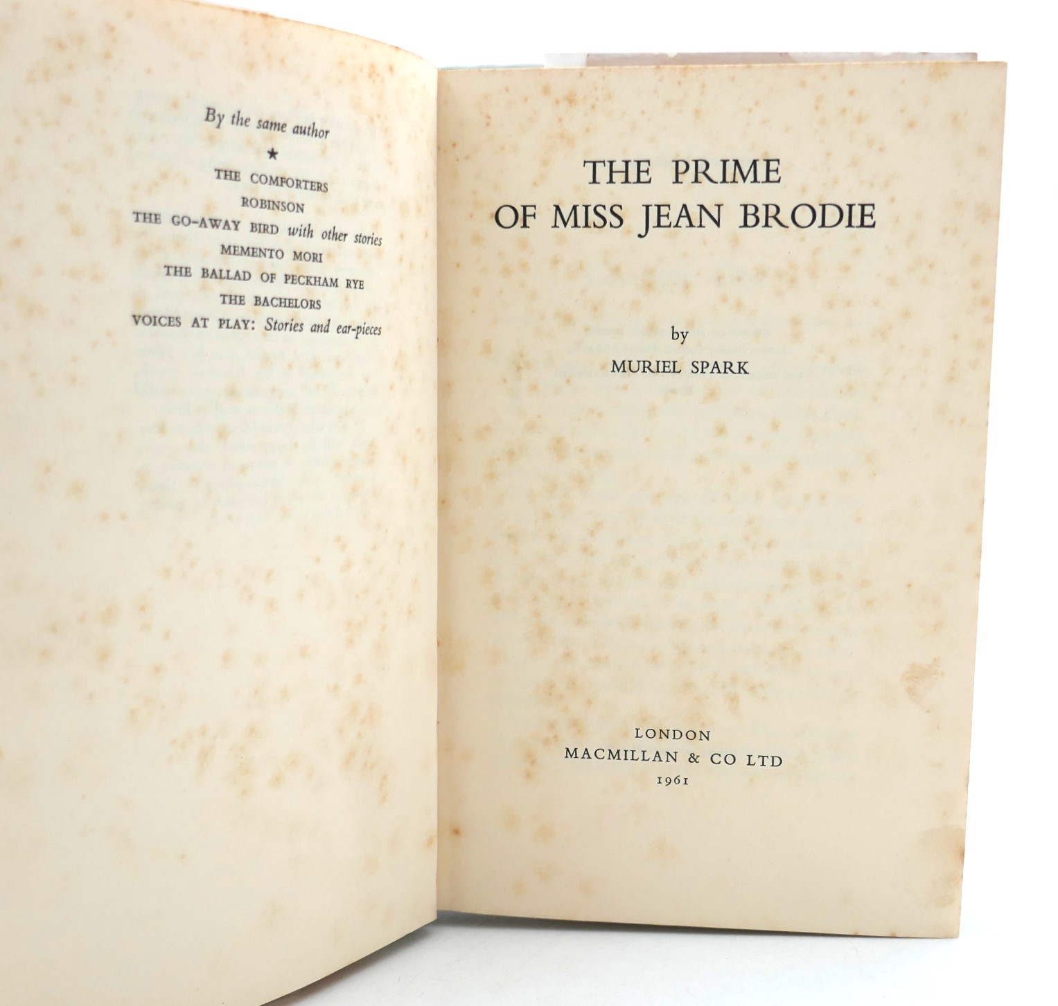 The Prime of Miss Jean Brodie. London: Macmillan, 1961. First Edition. Pp,170. Green cloth boards, in publisher’s pictorial dust jacket. Jacket lightly toned along margins, with a small red mark to the rear of the dust jacket, foxing (browning) to preliminary leaves & fore-edge; otherwise a nice bright copy.