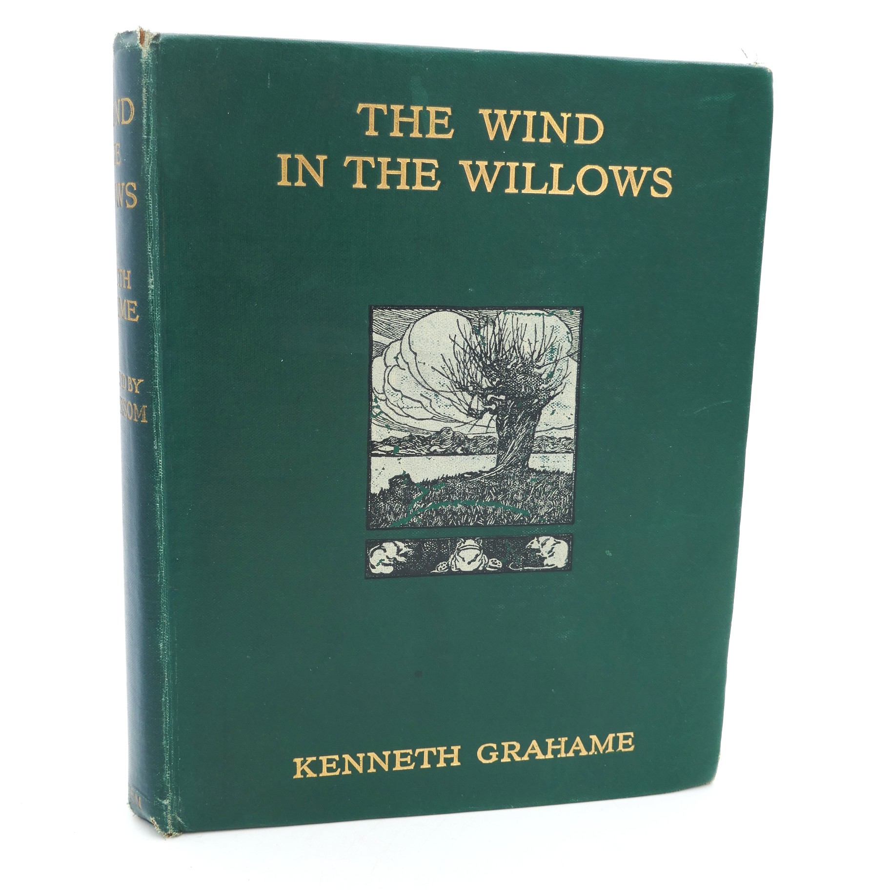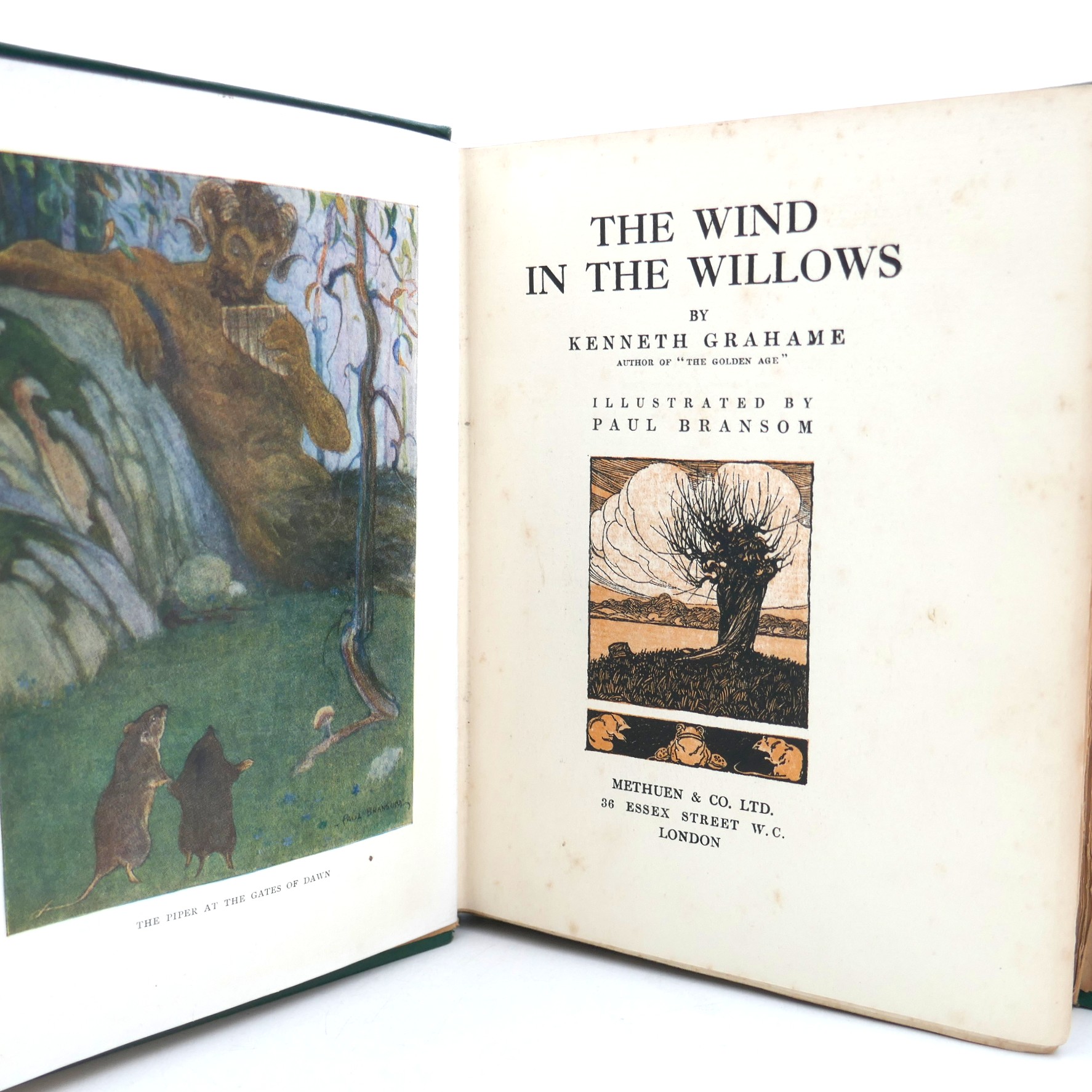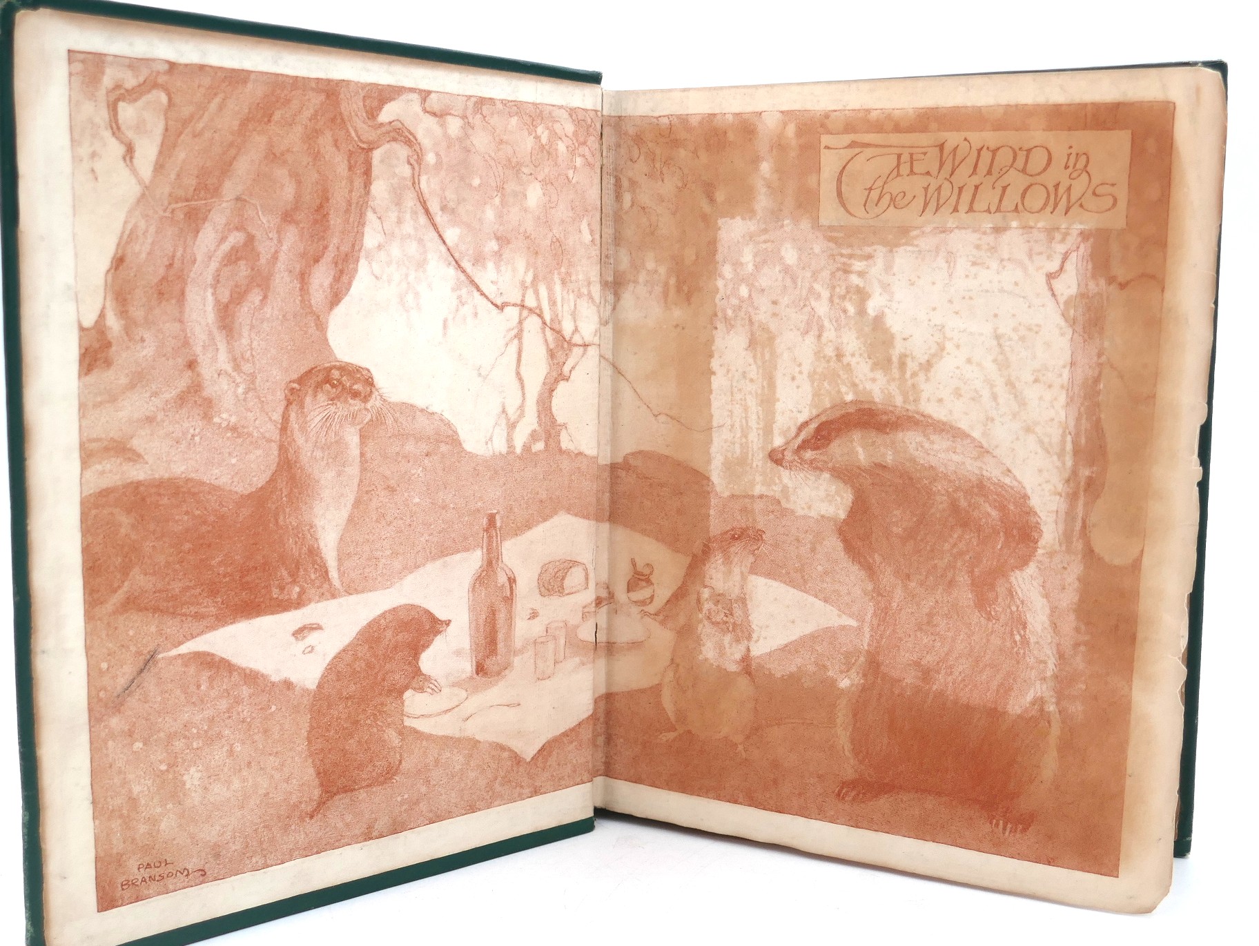 The Wind in the Willows. Illustrated by Paul Bransom. London: Methuen & Co., 1913. First Edition Thus. Pp 301, uncut. Ten plates in colour one in black & white. Publisher’s smooth green buckram, title in black with illustration blocked on upper cover, lettered in gilt to spine, pictorial endpapers.. Light foxing to contents, otherwise a very good copy.