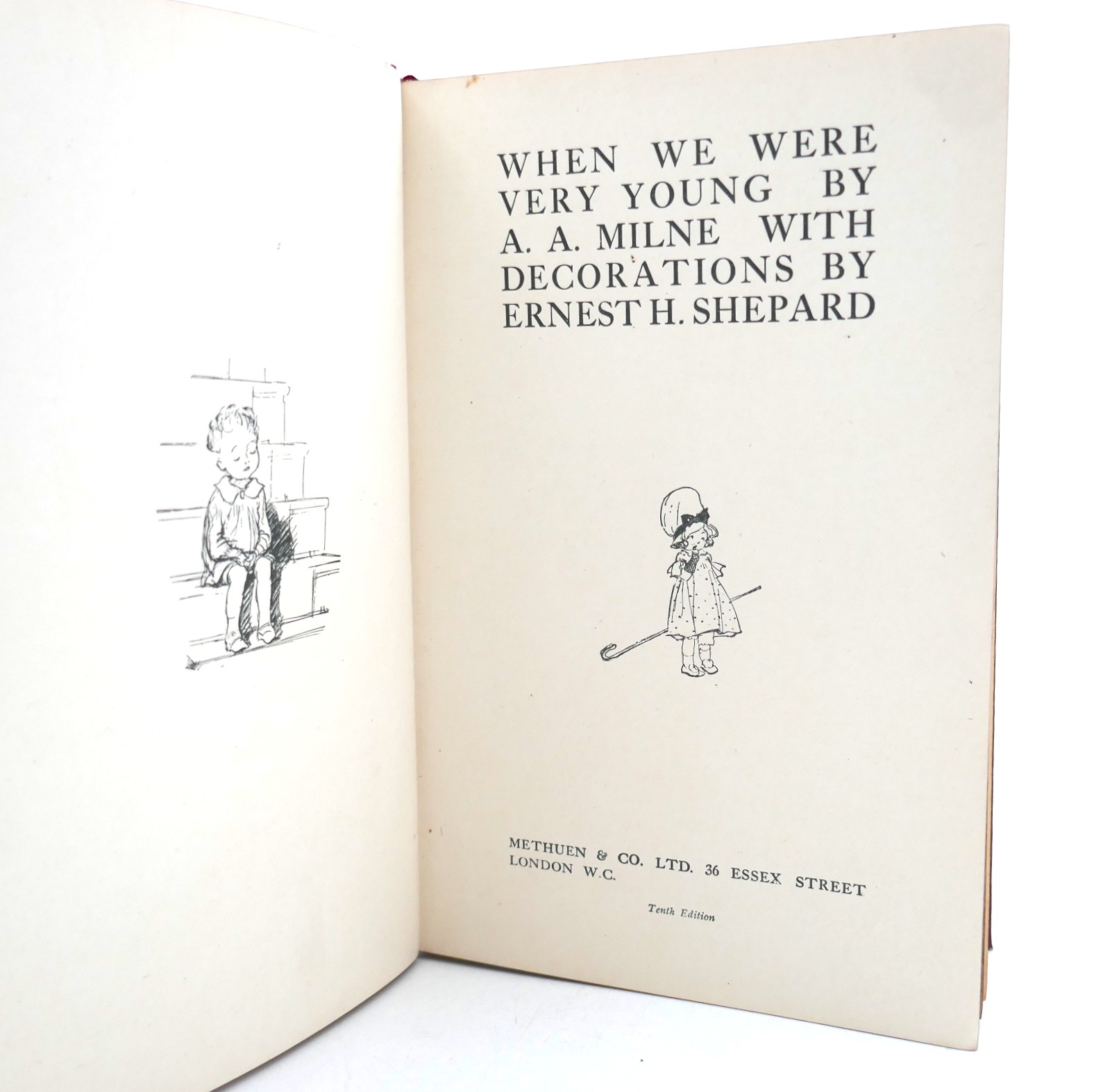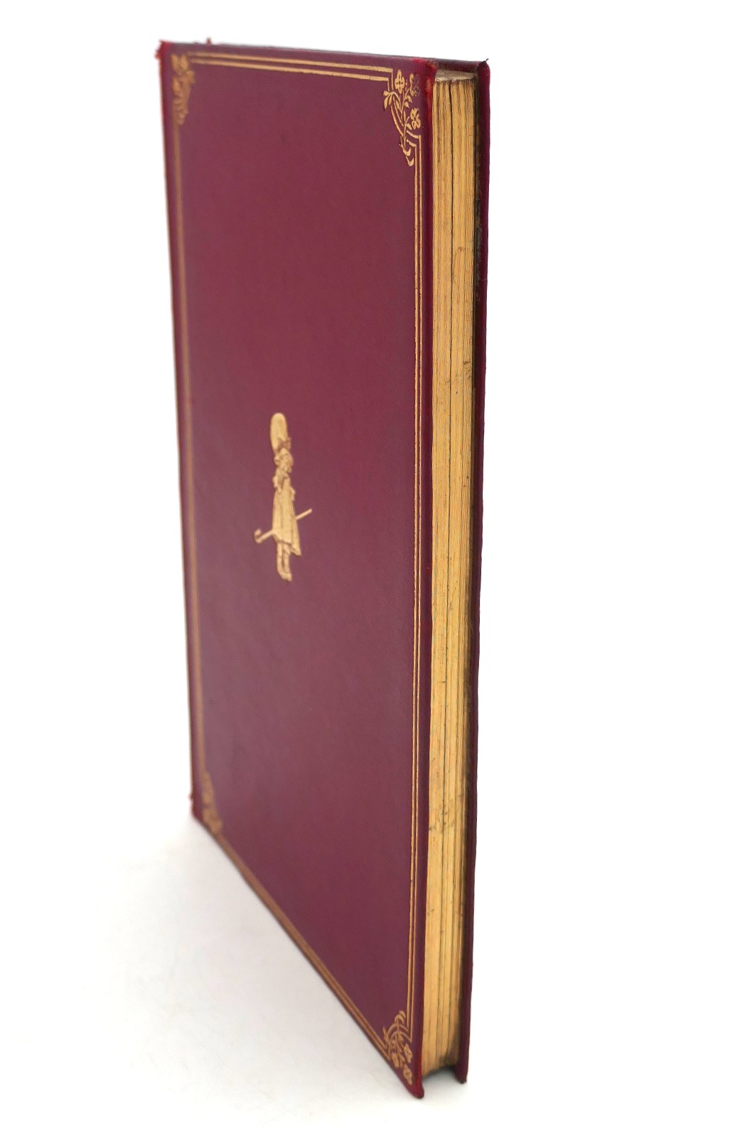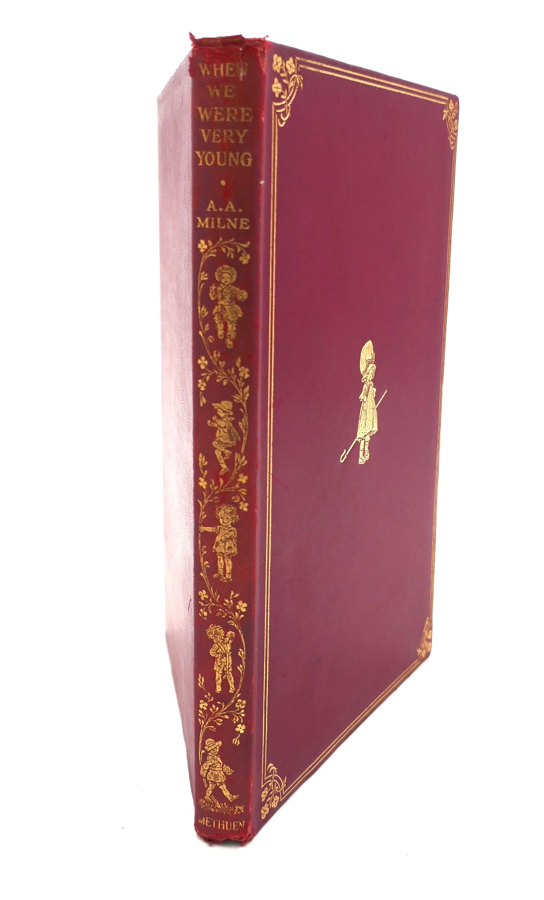 When We Were Very Young. Decorations by Ernest H. Shepard. London: Methuen, 1925. Tenth Edition. Pp, 99. De Luxe binding issue in full red flexible leather boards; upper cover ruled in gilt with gilt silhouettes of the child to centre, spine richly decorated in gilt. Pictorial endpapers, all edges in gilt. Light fraying to head & tail of spine, otherwise a nice bright copy.