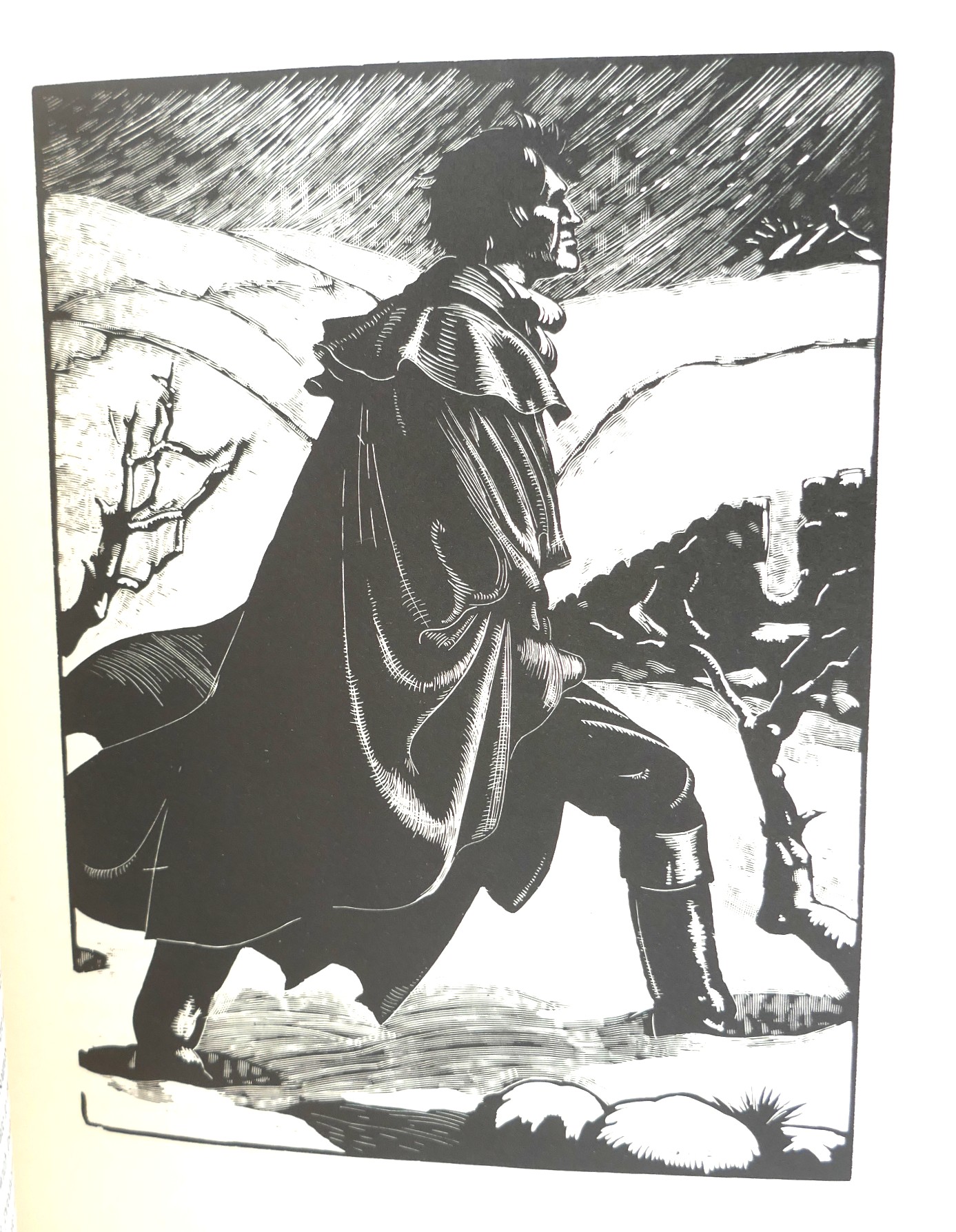 The twelve wood engravings are by the renowned Anglo-American artist Clare Leighton (1898-1989). Leighton’s powerful and dramatic compositions are praised for capturing the “brooding moors” and gothic atmosphere of the story. Notably, her illustrations for this edition directly inspired the set design for the acclaimed 1939 film adaptation of Wuthering Heights, starring Laurence Olivier and Merle Oberon.