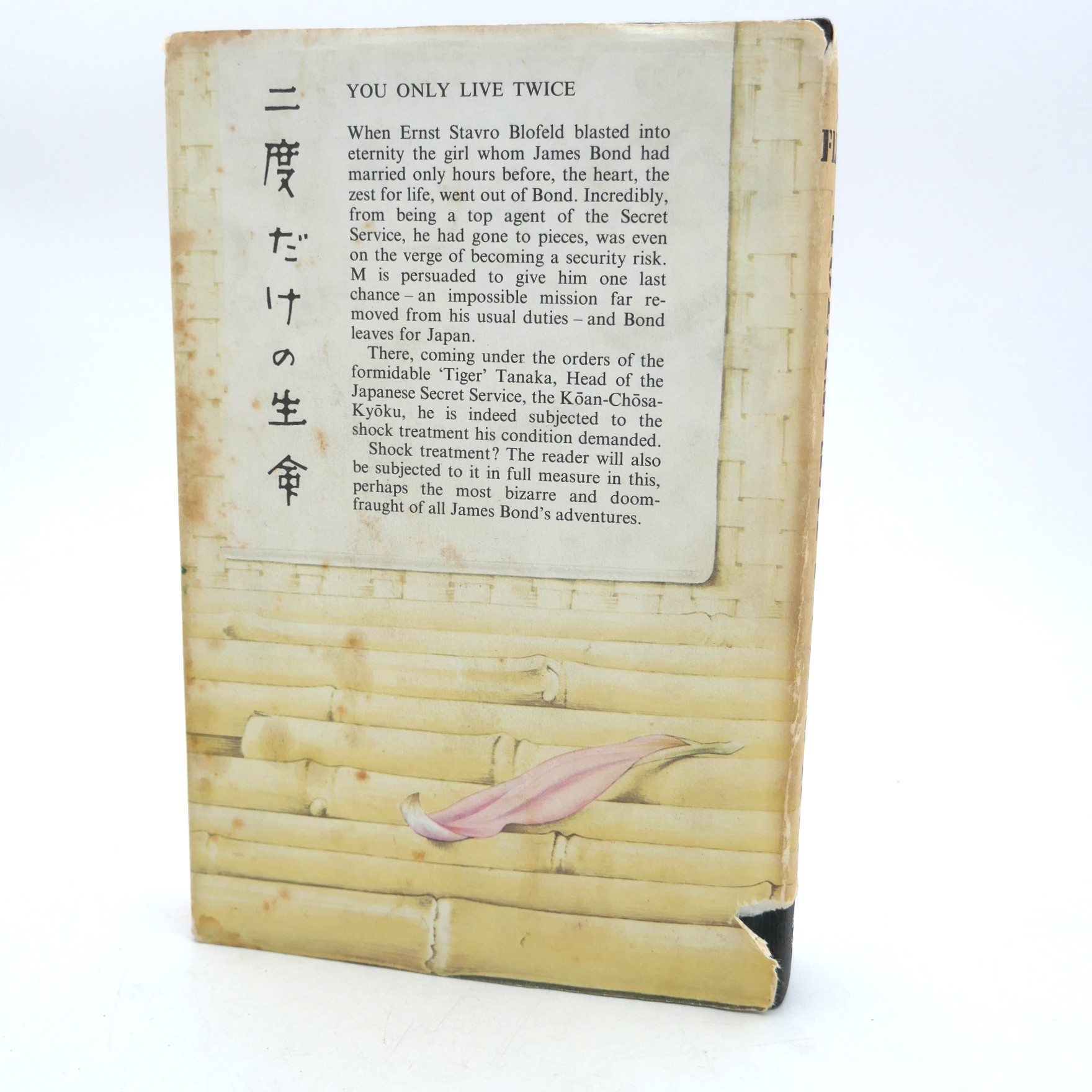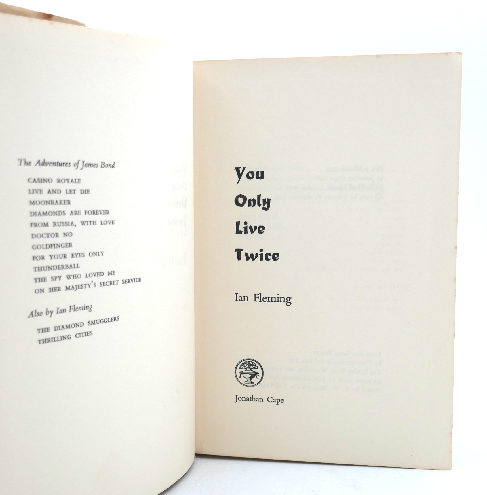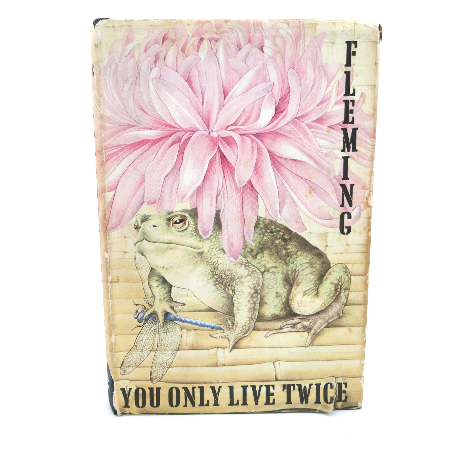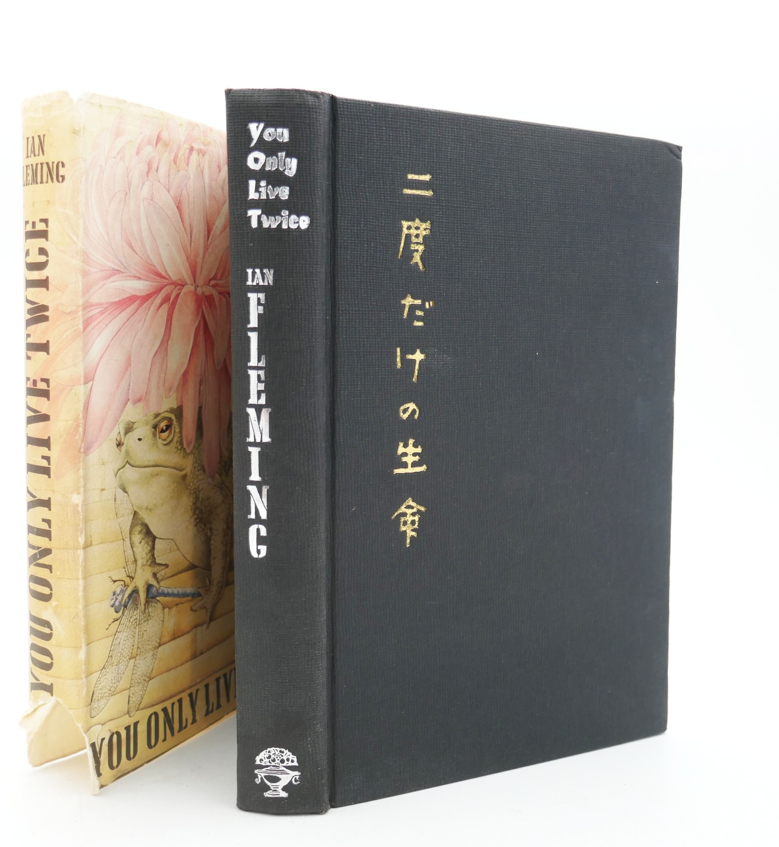 You Only Live Twice. London: Jonathan Cape, 1964. First Edition, First Issue. Black cloth boards with with Japanese lettering blocked in gilt on front cover & silver gilt title on spine in publisher’s pictorial dust jacket designed by Richard Chopping. UK Price (16s net) present on front flap of wrapper which has all corners clipped by the publisher. Loss to tail of jacket spine, foxing to fore-edges; ownership name to endpaper. Contents in nice bright condition.