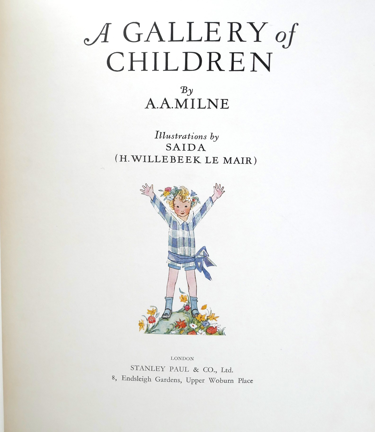 A Gallery of Children. With Twelve Full-Page Colour Illustrations by Saida (H. Willebeek Le Mair). London: Stanley Paul, 1925. First American Edition, Limited Issue. Folio. Blue ribbed cloth with ‘David McKay’ stamped at the base of the spine, denoting the American issue.