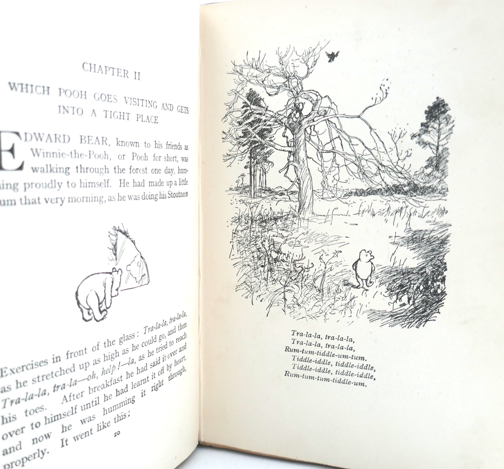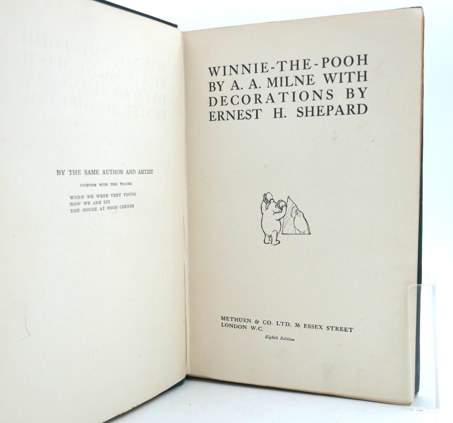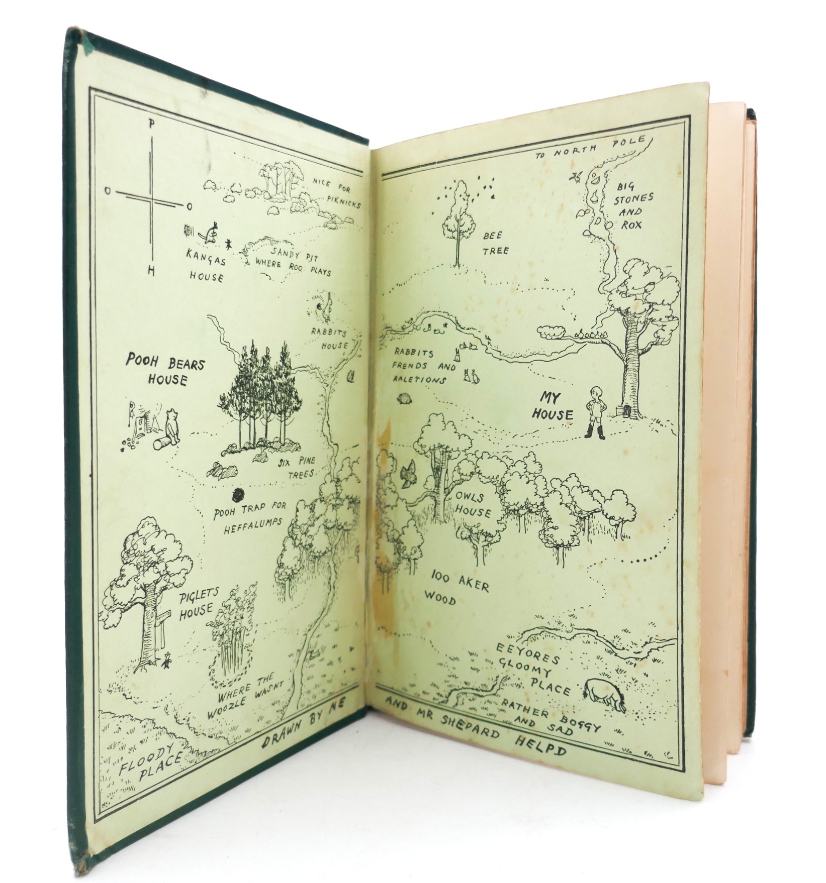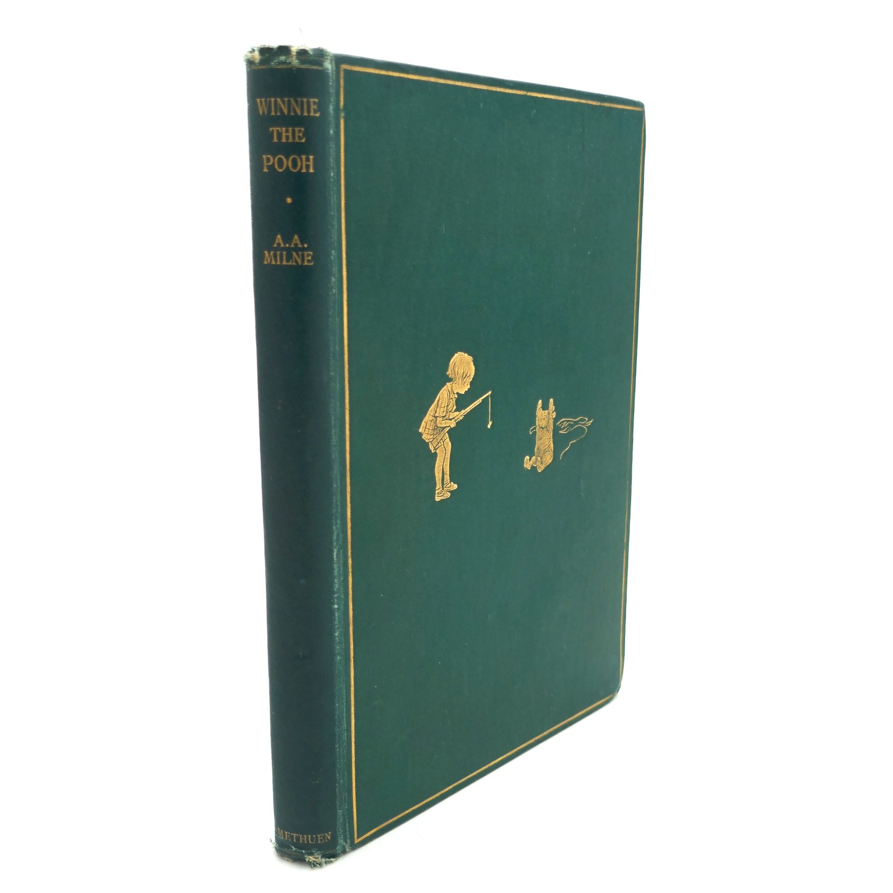Winnie-the-Pooh. With Decorations by Ernest H. Shepard. London: Methuen & Co. Ltd., 1927. Fifth Edition. Original green cloth, titles and pictorial decoration to spine and upper board gilt, map endpapers, top edge gilt. A nice bright copy.