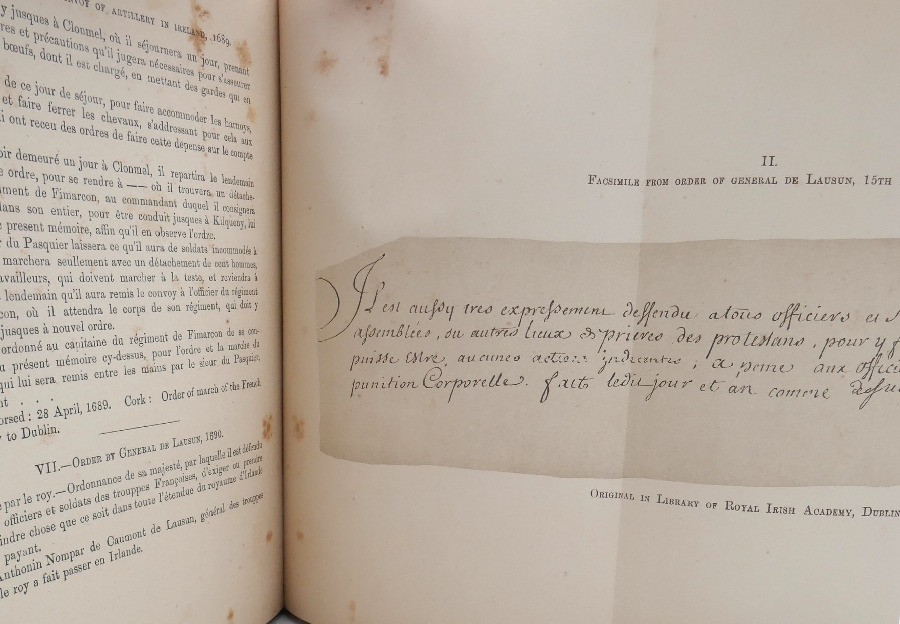 A Jacobite Narrative of The War in Ireland 1688-1691. With contemporary letters and papers, now for the First Time Published. Illustrated with Facsimiles. Dublin: Joseph Dollard, 1892. First Edition. Pp xvi, 327. Small folio. Rebound in plain green buckram, title in gilt to spine. Scattered foxing to contents pages, neat library stamp to title, overall a good copy.