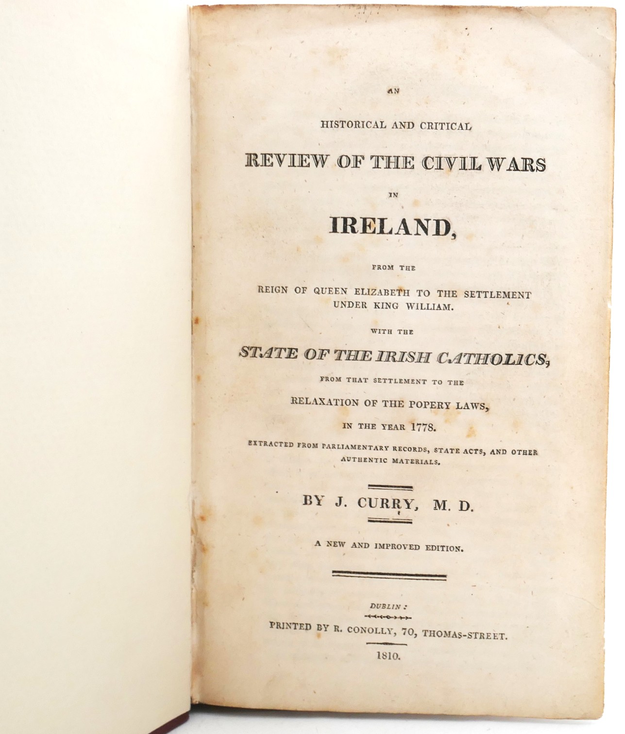 An Historical and Critical Review of the Civil Wars in Ireland. From the Reign of Queen Elizabeth to the Settlement under King William. With the State of the Irish Catholics, from that settlement to the Relaxation of the Popery Laws, in the Year 1778. Extracted from Parliamentary Records, State Acts, and other Authentic Materials. Dublin: Conolly, 1810. A New and improved Edition. Pp xxvii, 660, + index. Recent quarter cloth over marbled boards. A nice bright copy.