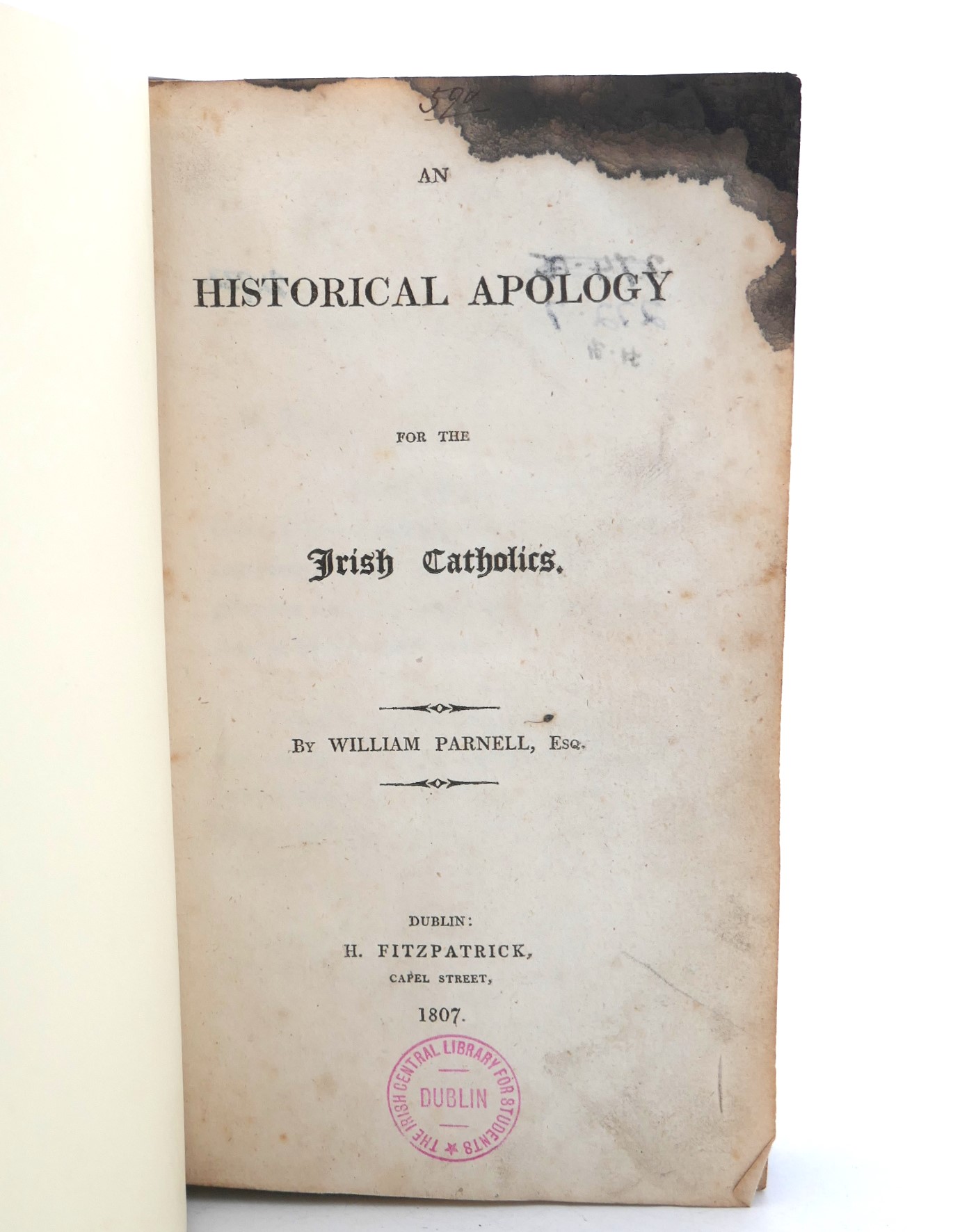 An Historical Apology for the Irish Catholics. Dublin: Fitzpatrick. 1807. First Edition. Pp 147. Early calf binding, rebacked. Ex library copy, with stamps. Top right corners of pages 1-10 heavily stained, otherwise a good copy.