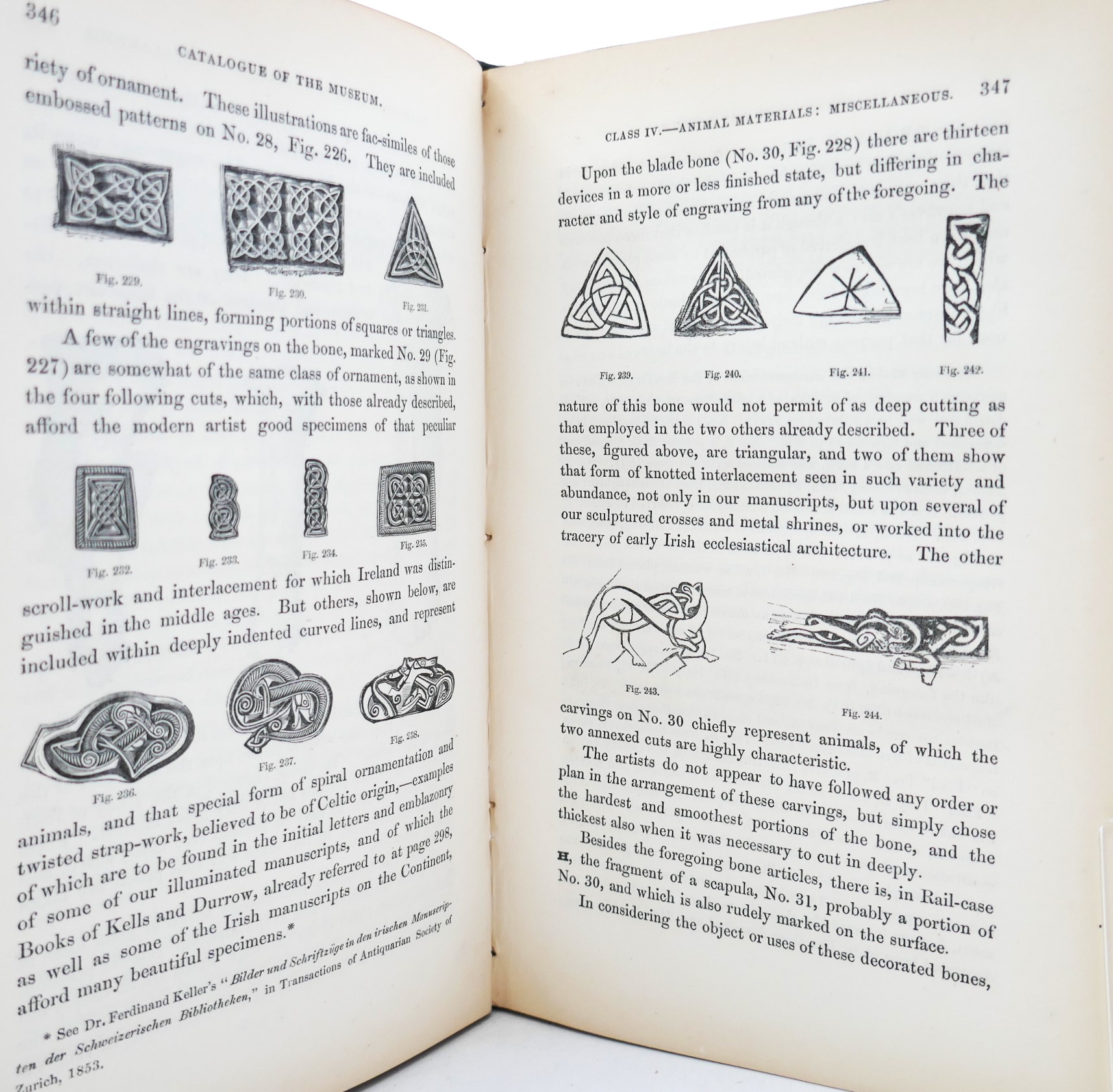 A Descriptive Catalogue of The Antiquities of Animal Materials and Bronze. Illustrated with Three Hundred & Seventy-Seven Wood Engravings. Dublin: Hodges, 1861. First Edition. Pp iv, 247-642. Publisher’s green diced cloth boards, with title label to spine. Ex library copy, with ink stamps & with occasional label residue to endpapers; otherwise a nice copy.