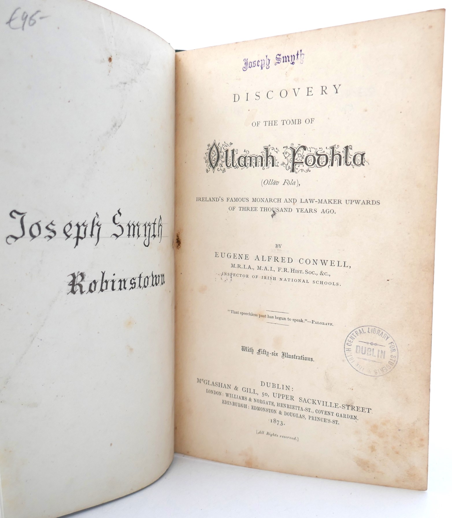 Discovery of the Tomb of Ollamh Fodhla. (Ollav Fola), Ireland’s Famous Monarch and Law-Maker Upwards of Three Thousand Years Ago. Dublin: Gill, 1873. First Edition. Pp, 69. Publisher’s green cloth boards, title in gilt to centre of upper cover & spine. Covers rubbed, ex library copy with stamps, otherwise in good condition.