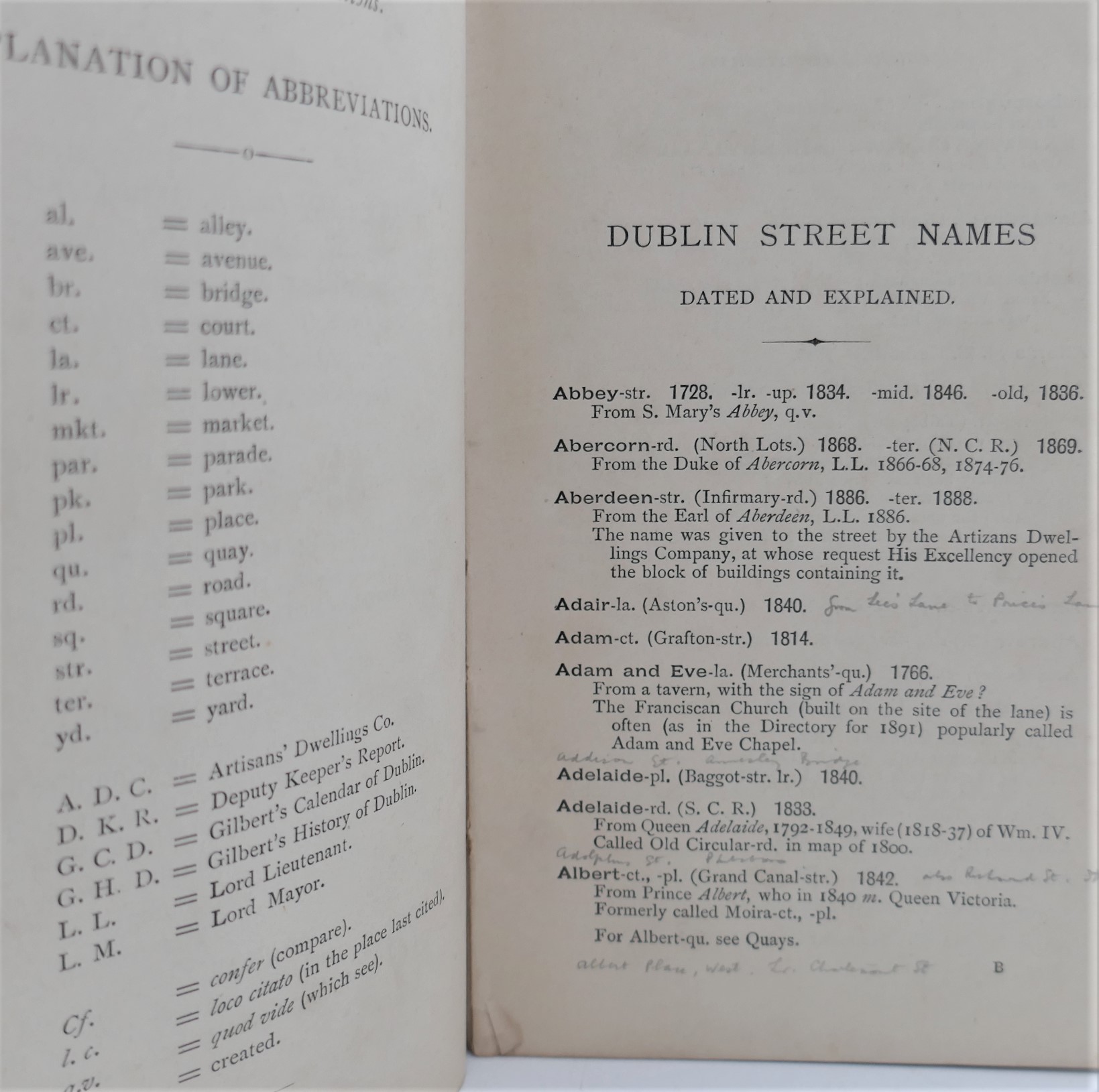 Dublin Street Names, Dated and Explained. Dublin: Hodges, Figgis, 1892. First Edition. Pp xxiv, 160. Sm 8vo. Green cloth titled in gilt on upper cover. Covers scuffed & soiled, new endpapers, contents in good condition.