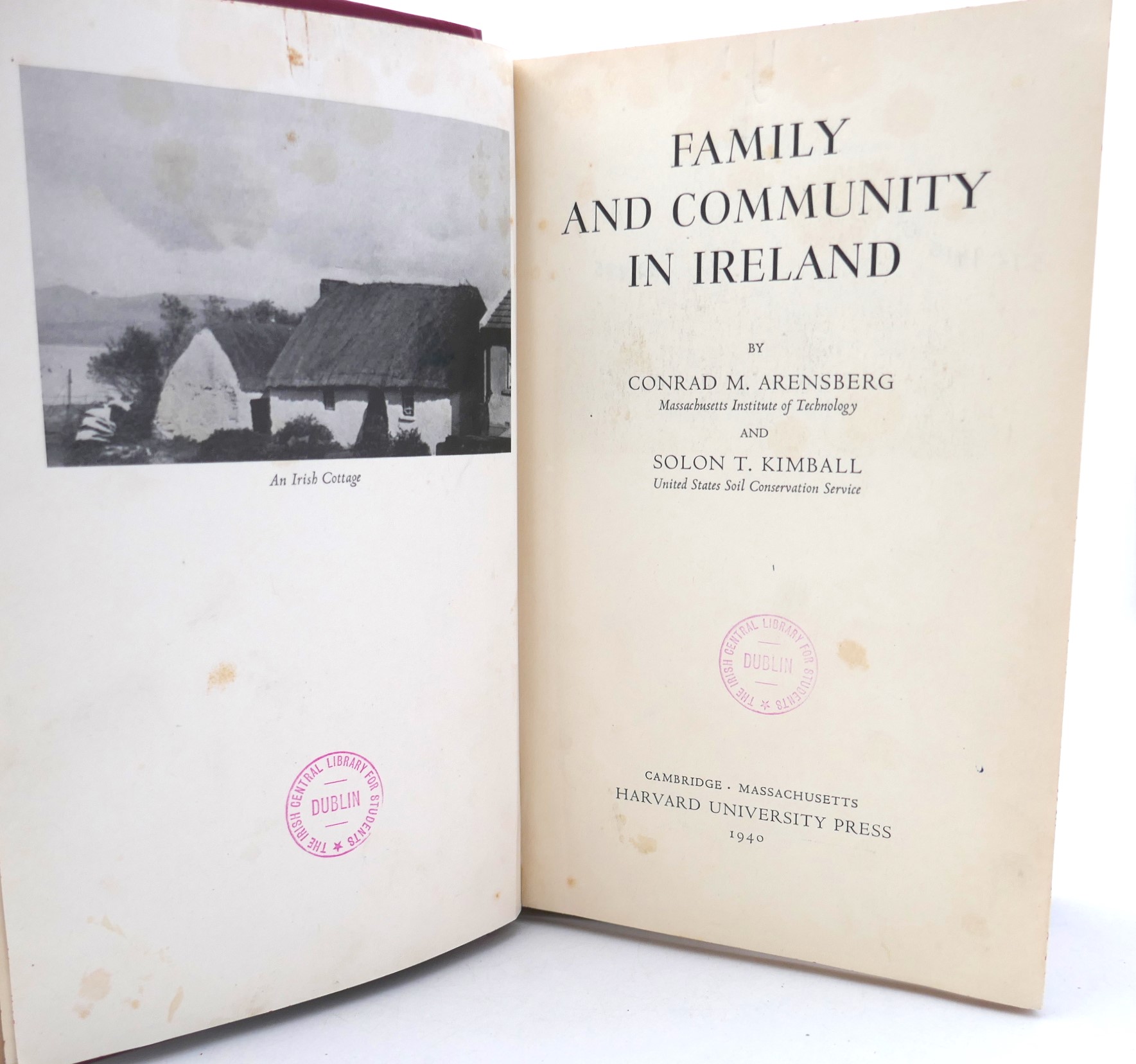 Family and Community in Ireland. Cambridge Mass : Harvard University Press, 1940. First Edition. Pp xxix, 322. Ex library copy with stamps in a library cloth binding. Contents in nice bright condition.