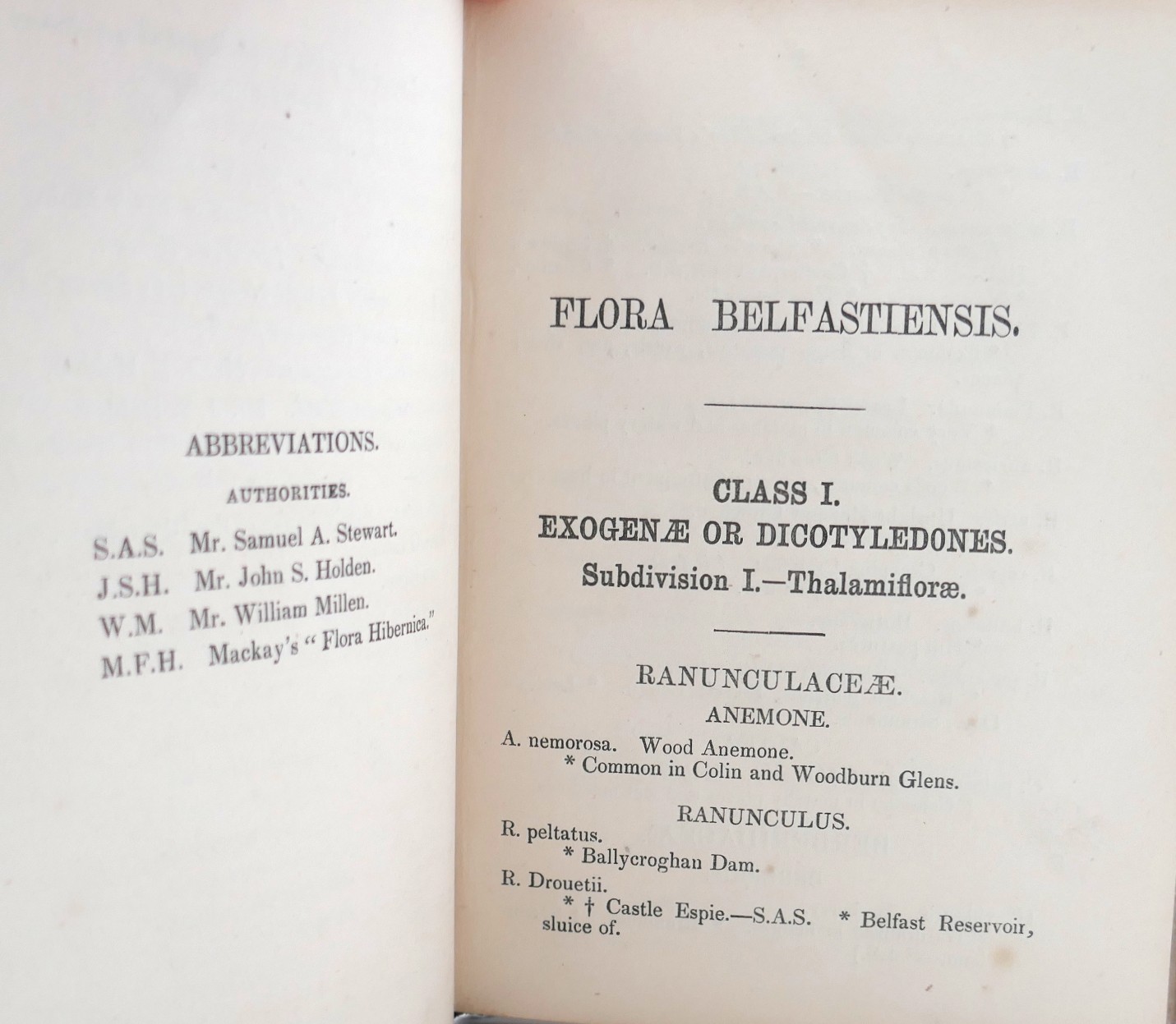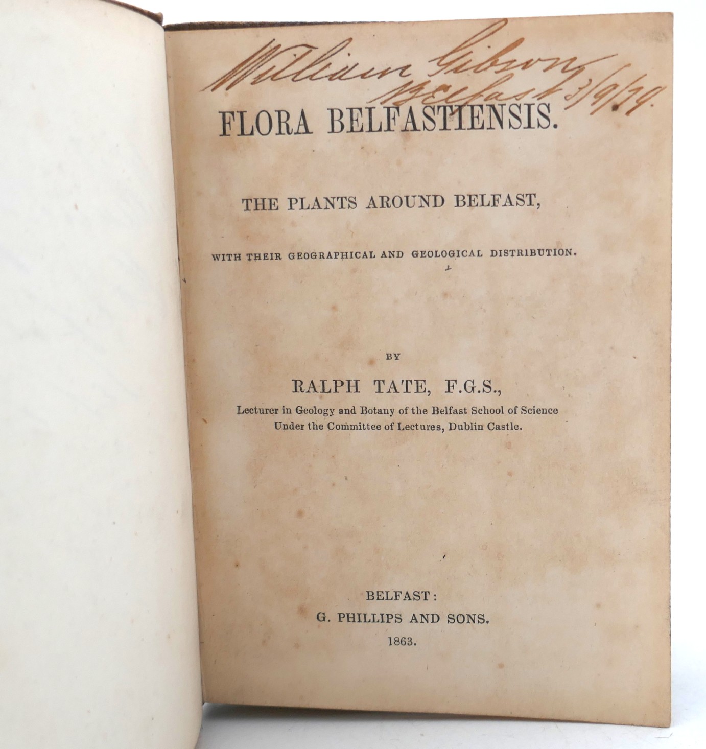 Flora Belfastiensis: The Plants Around Belfast. Belfast: G. Phillips & Sons, 1863. First Edition. Pp xx, 92. Publisher’s brown cloth boards, blindstamped decoration to corners, titl in gilt to upper cover. Neat ownership name to front endpaper & title page. A nice bright copy.