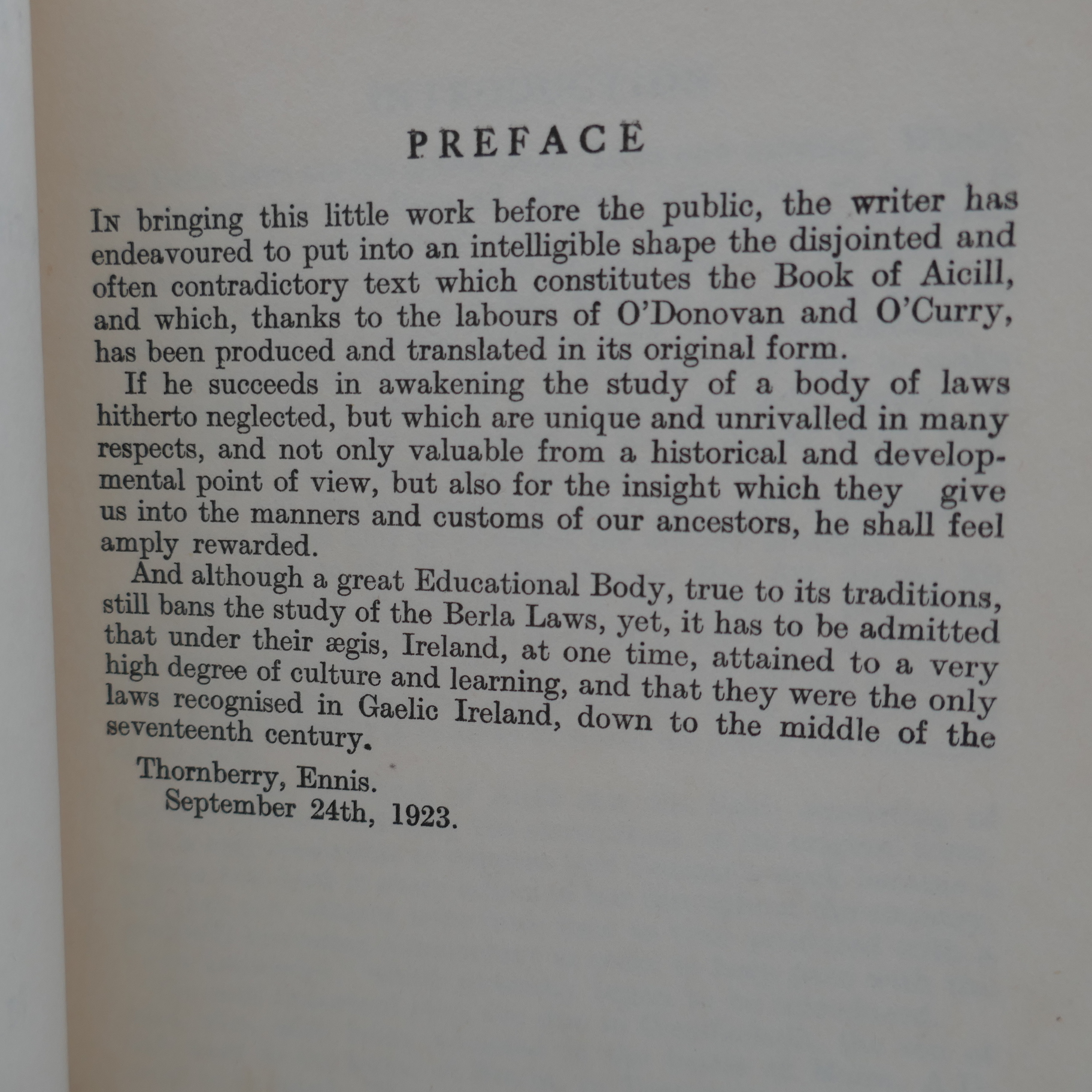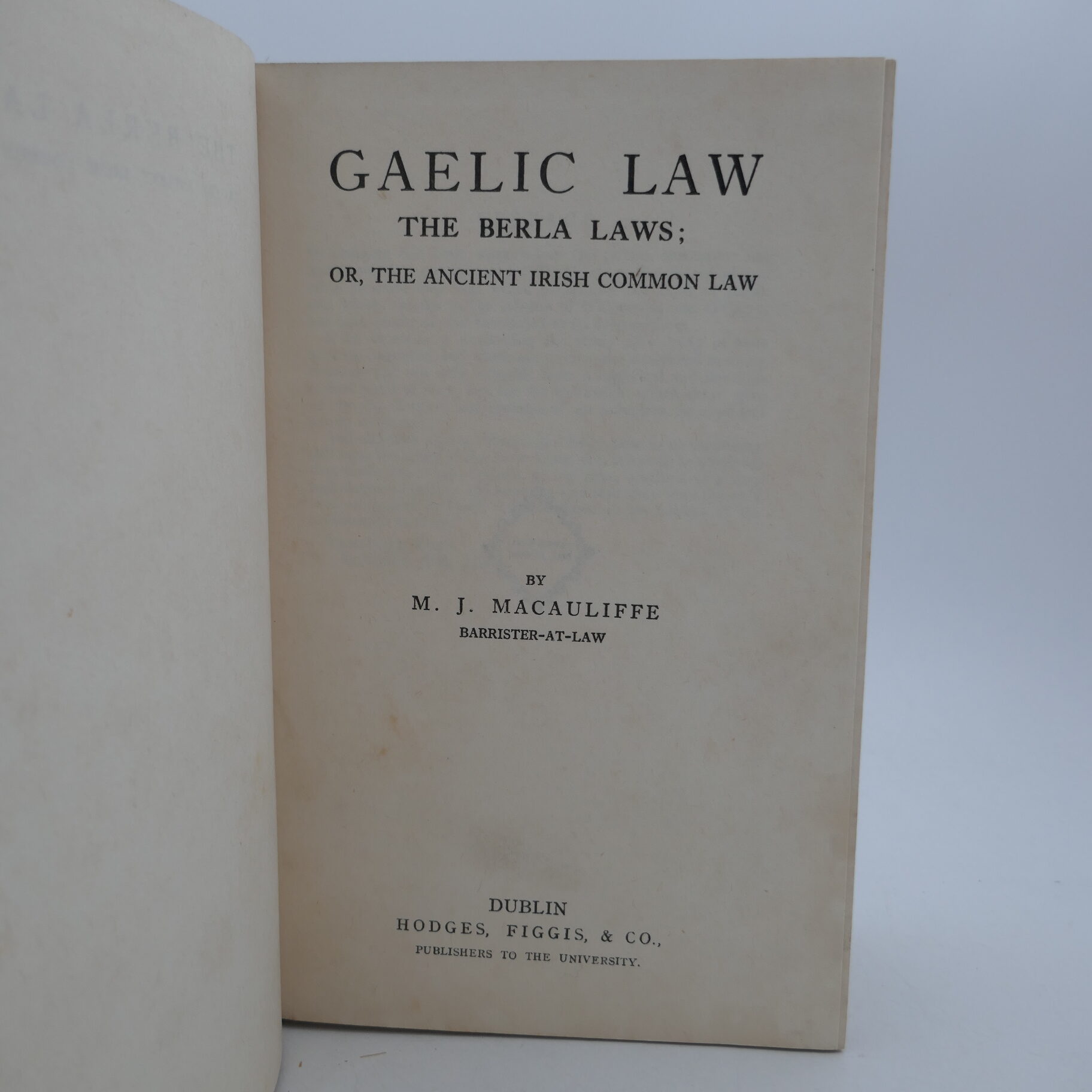 Gaelic Law The Berla Laws or The Ancient Irish Common Law. Dublin: Hodges Figgis, 1923. First Edition. Pp 117, [2] Index. Plublisher’s cloth boards, title lettered to upper cover. Covers mottled and faded, contents in good condition.