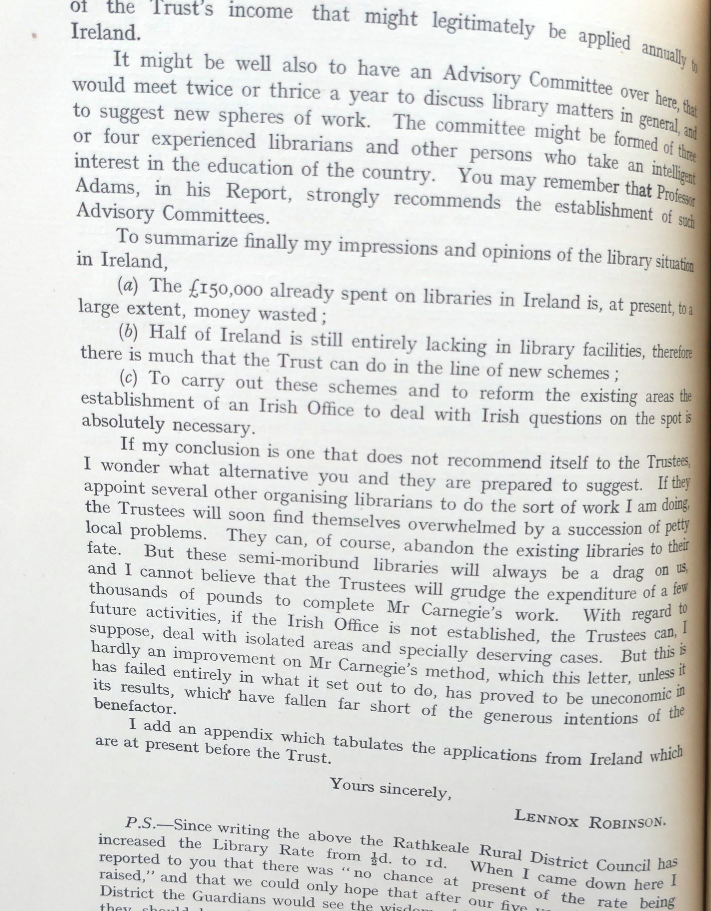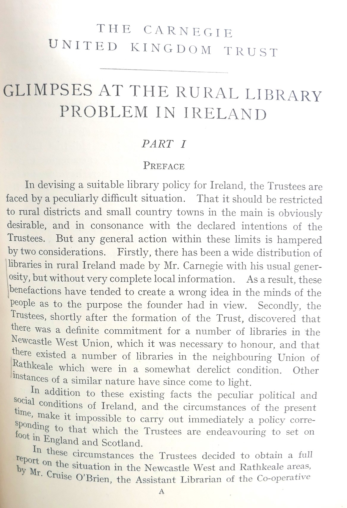 In Ireland between the years 1915 and 1917 the Carnegie United Kingdom Trust commissioned two reports into the situation of rural libraries. The reports found that the rural district schemes instigated by the Trust had, for the most part, been a failure. These reports were written by two men who worked tirelessly for the promotion of the library ideal, the (Abbey) playwright Lennox Robinson and a librarian from the Co-operative Reference Library, Cruise O’Brien, father of the political commentator Conor Cruise O’Brien.