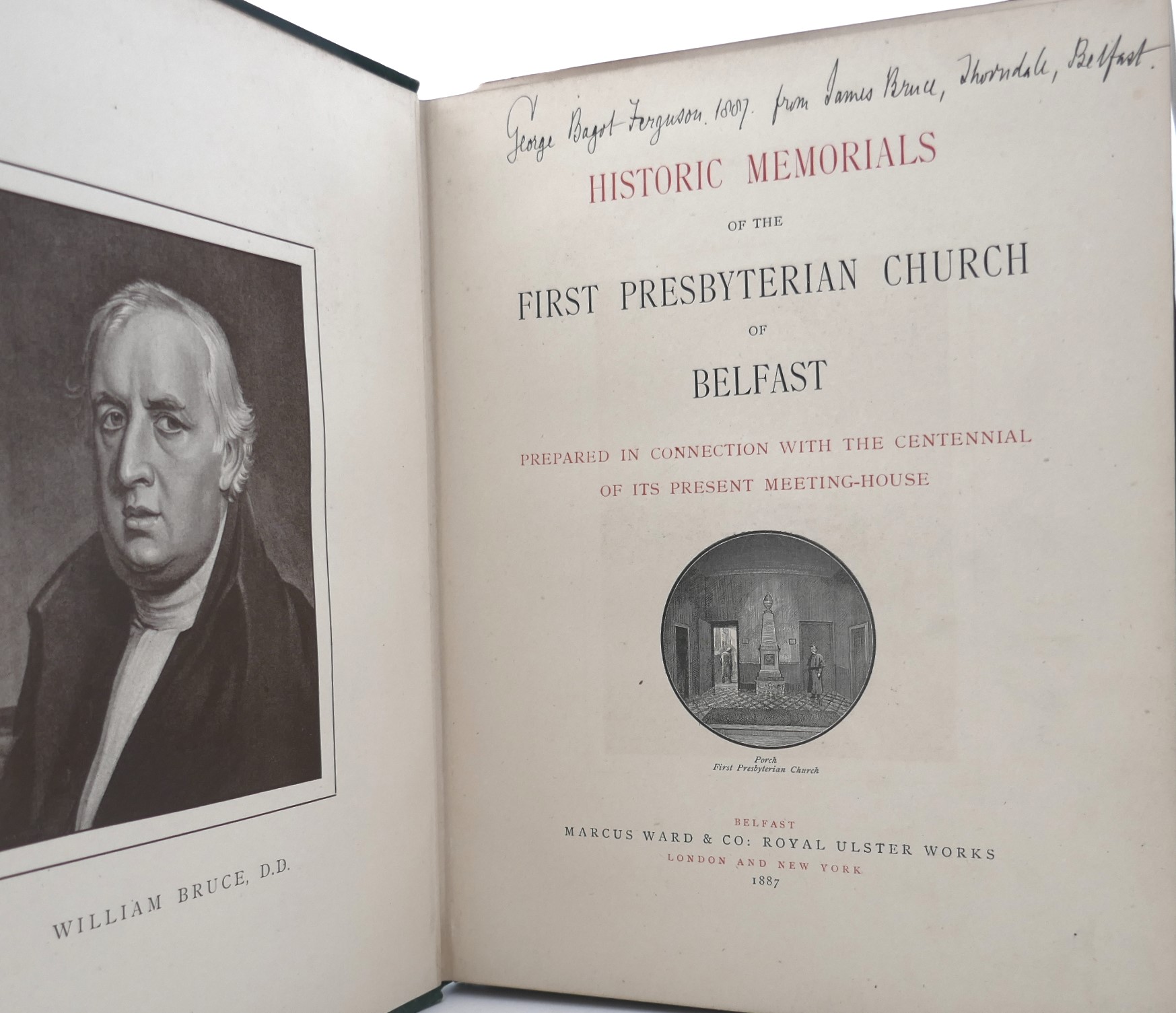Historic Memorials of the First Presbyterian Church of Belfast. Prepared in Connection with the Centennial of its Present Meeting-House. Belfast: Marcus Ward, 1887. First Edition. Pp 128. Publisher’s green cloth boards, title in gilt to upper cover. Covers lightly faded, contents in fine bright condition.