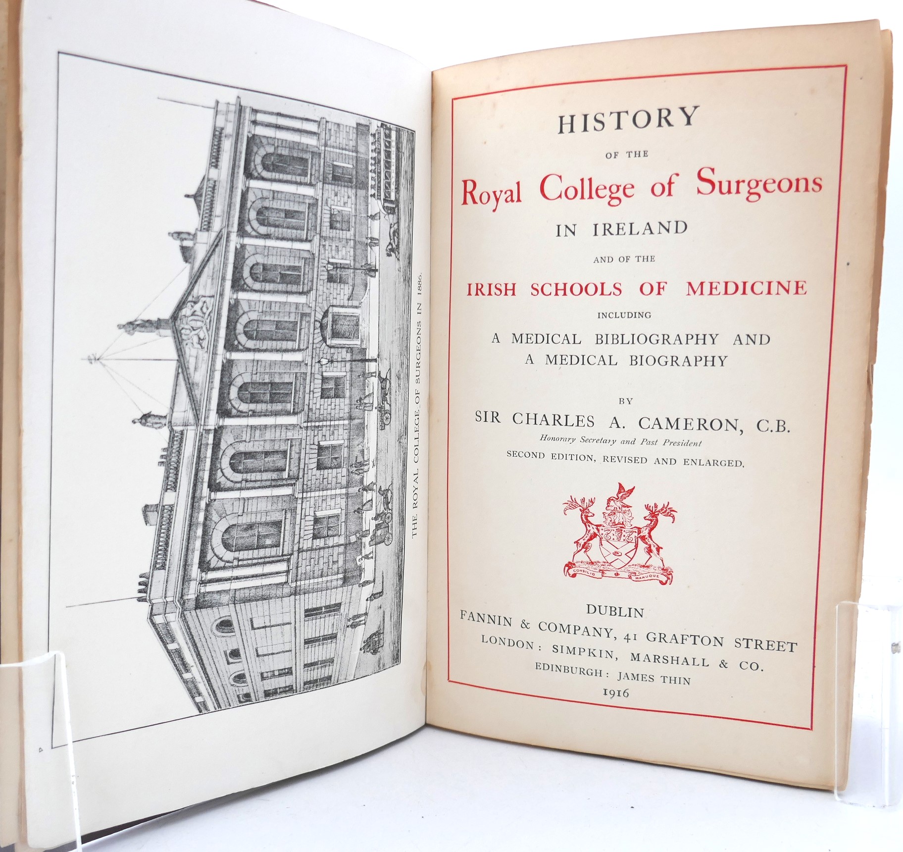 History of the Royal College of Surgeons in Ireland. Also of the Irish Schools of Medicine. Including a Medical Bibliography and a Medical Biography. Dublin: Fannin, 1916. Second Edition, Revised & Enlarged. Pp xii, 882. Title page printed in red and black. Publisher’s maroon buckram boards, title in gilt to spine, coat of arms to upper cover. Light shelf-wear to covers, age-toning to preliminary leaves otherwise text generally clean and bright. Housed in collectors’ solander box.