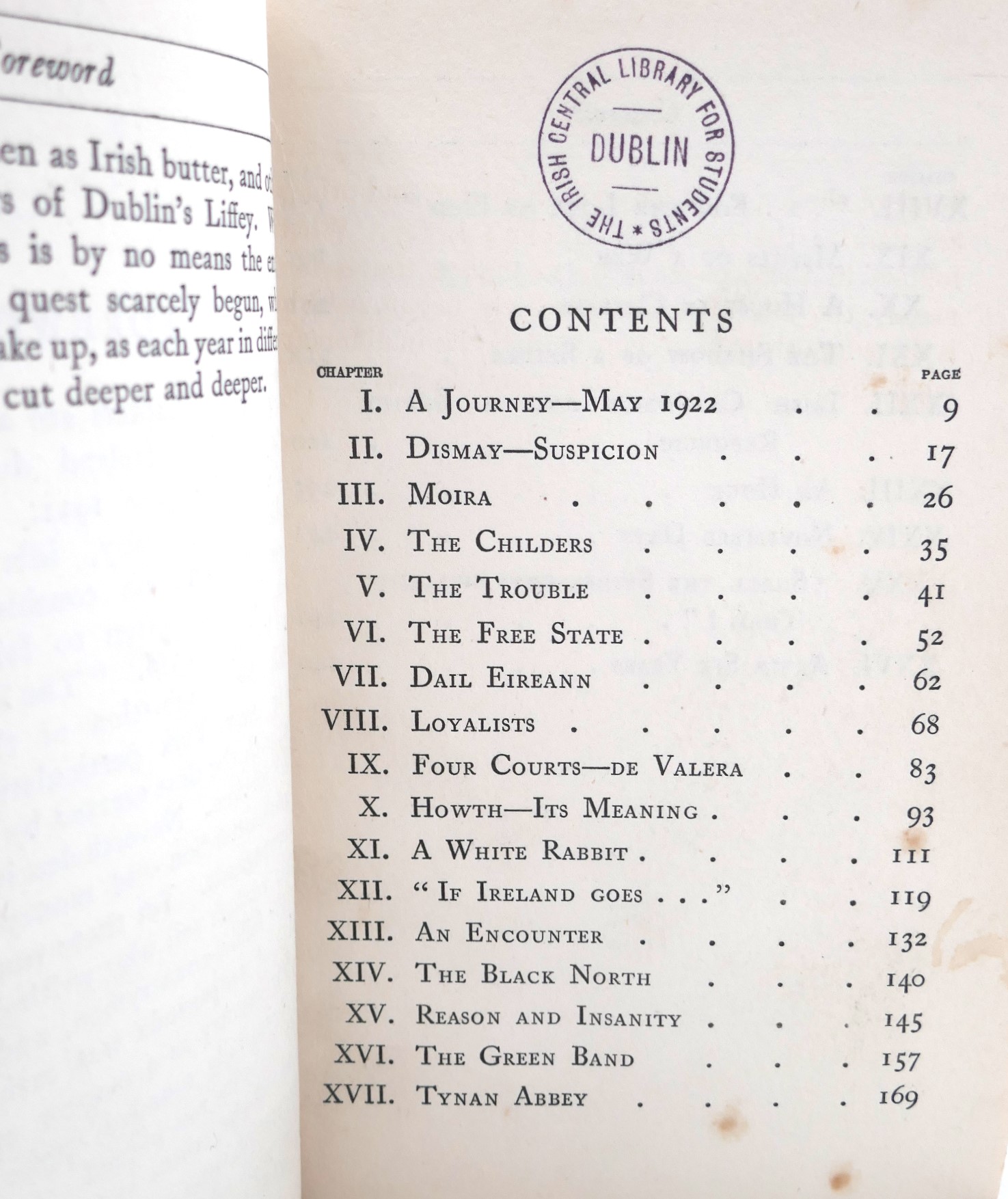 The author’s record of a journey through north and south of Ireland in 1922 to obtain the view of both sides during the war of Independence. She spent time staying with Mrs. Erskine Childers.