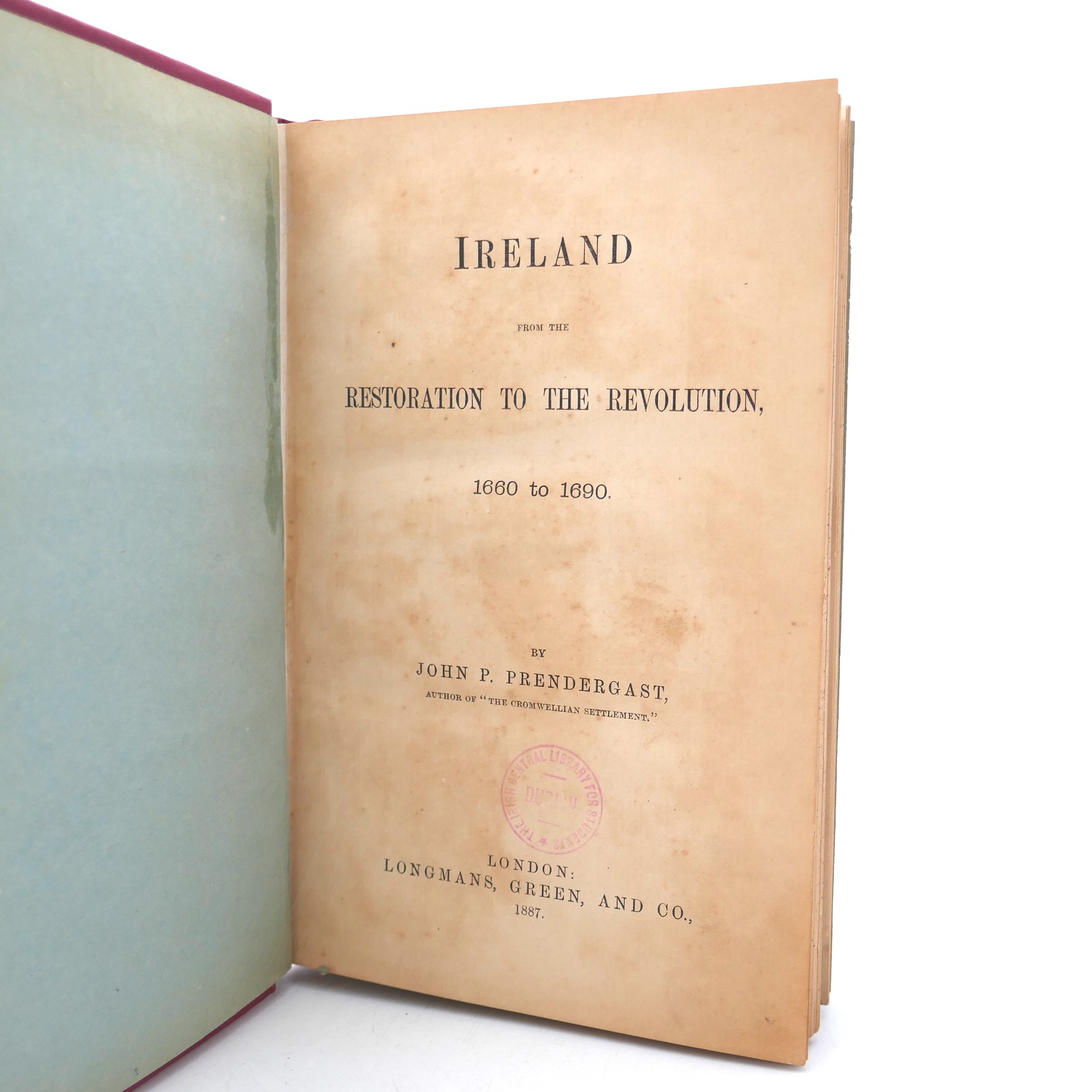 Ireland from the Restoration to the Revolution, 1660-1690. Longmans Green, London, 1887. First Edition. Ex library copy, with ink stamps & with occasional label residue to endpapers. Rebound in rexene boards, title in gilt to spine. A very good copy.