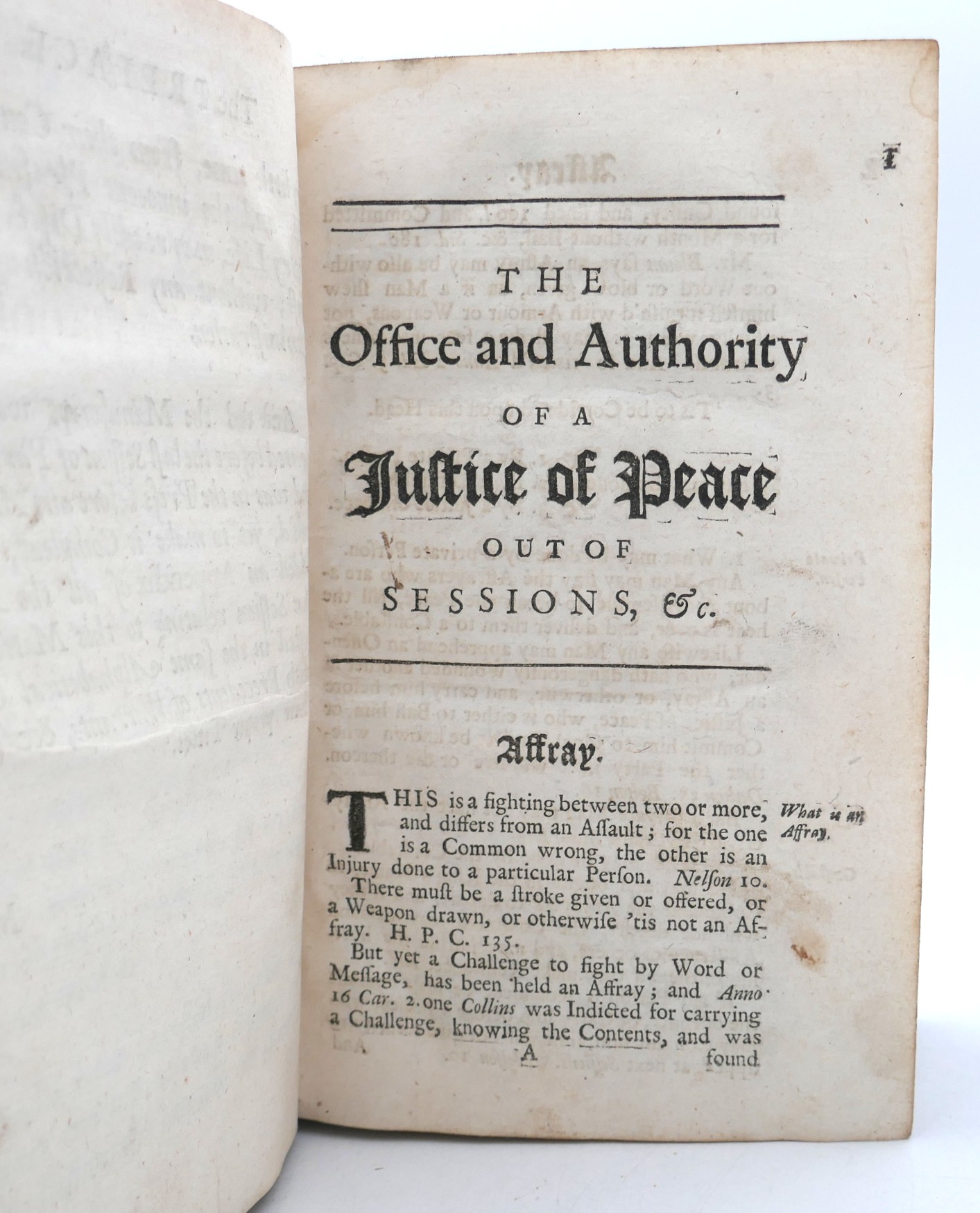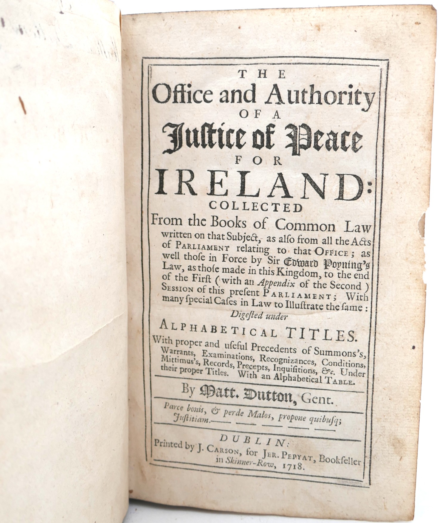 The Office and Authority of a Justice of Peace for Ireland. From the Books of Common law Written on That Subject, as Also From all the Acts of Parliament as Well Those in Force by Sir Edward Poyning’s law, as Those Made in This Kingdom, etc. Dublin: J. Carson, 1718. First Edition. Pp 457; with Table & Appendix to rear. Full contemporary calf boards, raised bands ruled in gilt, with russet title label to spine. Front free endpaper frayed along edges, otherwise a fine bright copy.