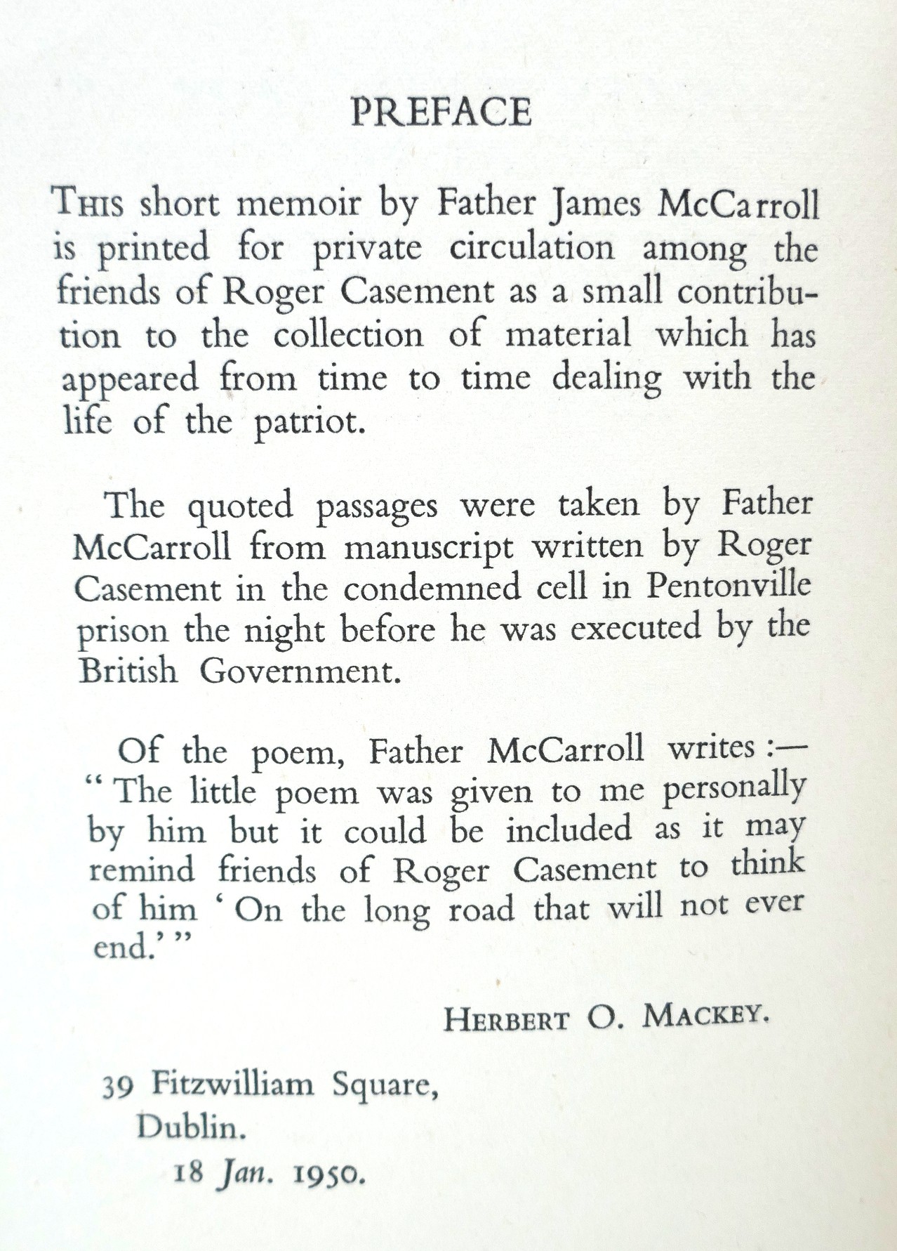 This short memoir by Father James McCarroll contains passages from the manuscript written by Casement the night before he was executed. Preface by Herbert O’ Mackey.