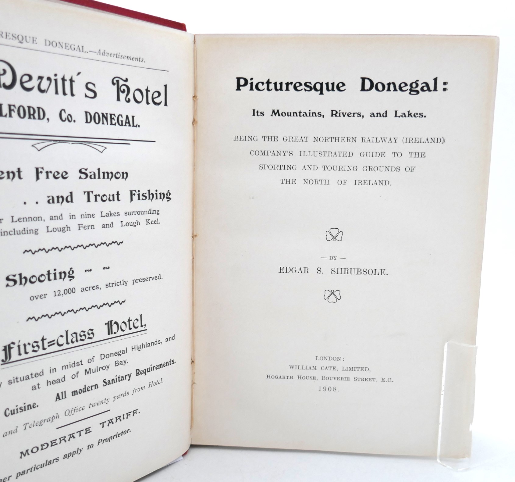 Picturesque Donegal. Its Mountains, Rivers, and Lakes. Being the Great Northern Railway (Ireland) Company’s Illustrated Guide to the Sporting and Touring Grounds of the North of Ireland. London: W. Gate, 1908. First Edition. Pp, 159 + adverts. Red buckram boards, title lettered in gilt to upper cover and in black to spine. Light shelf-wear to covers, otherwise a nice bright copy.