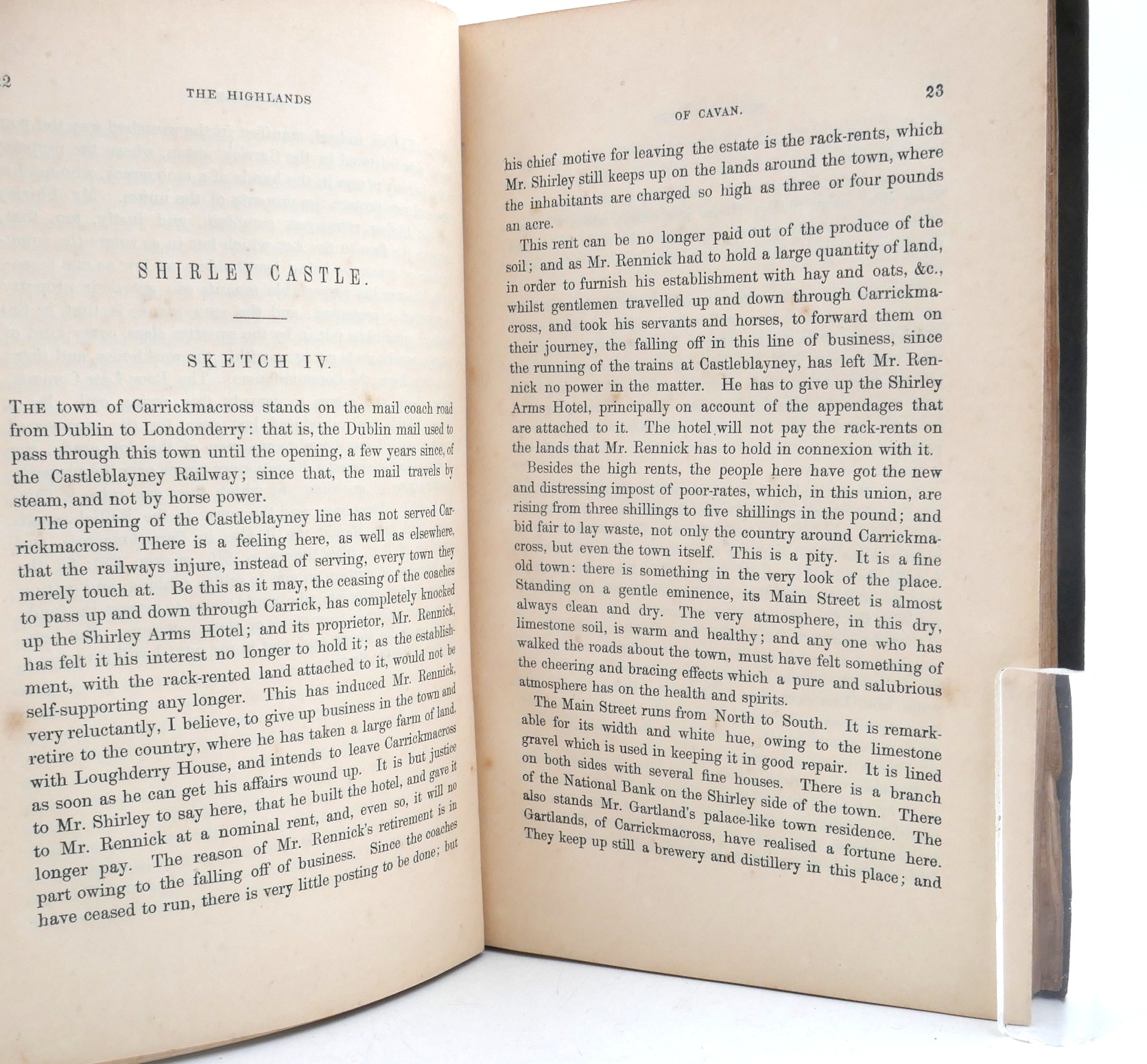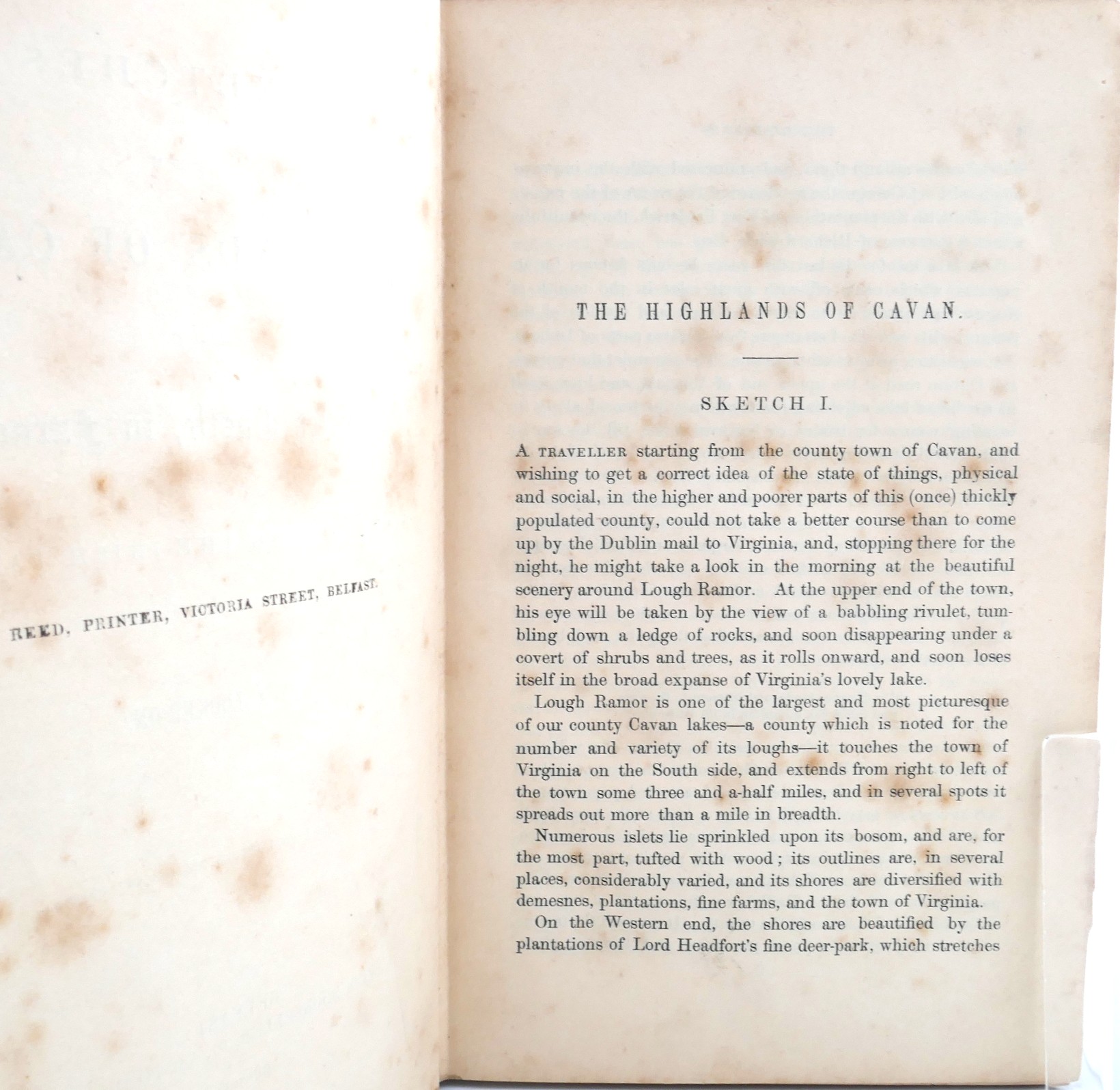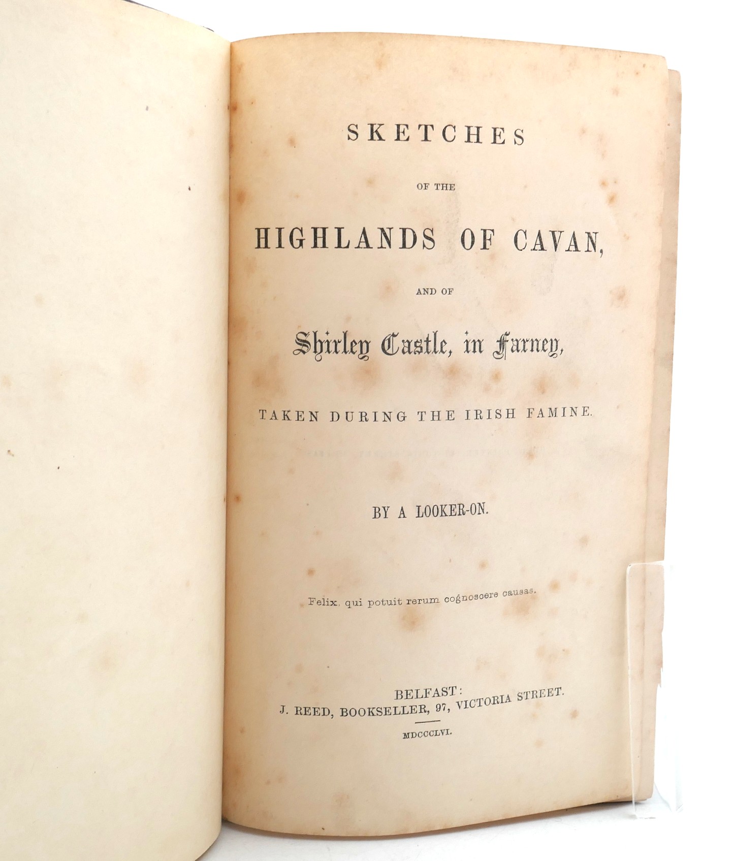 Sketches of the Highlands of Cavan and of Shirley Castle, in Farney. Taken During the Irish Famine. By A Looker-On. Belfast: Reed, 1856. First and only Edition. Pp, 316. Publisher’s cloth boards decorated in blind, title stamped in gilt to spine, yellow endpapers. Light fading to covers, contents pages in very good condition throughout.