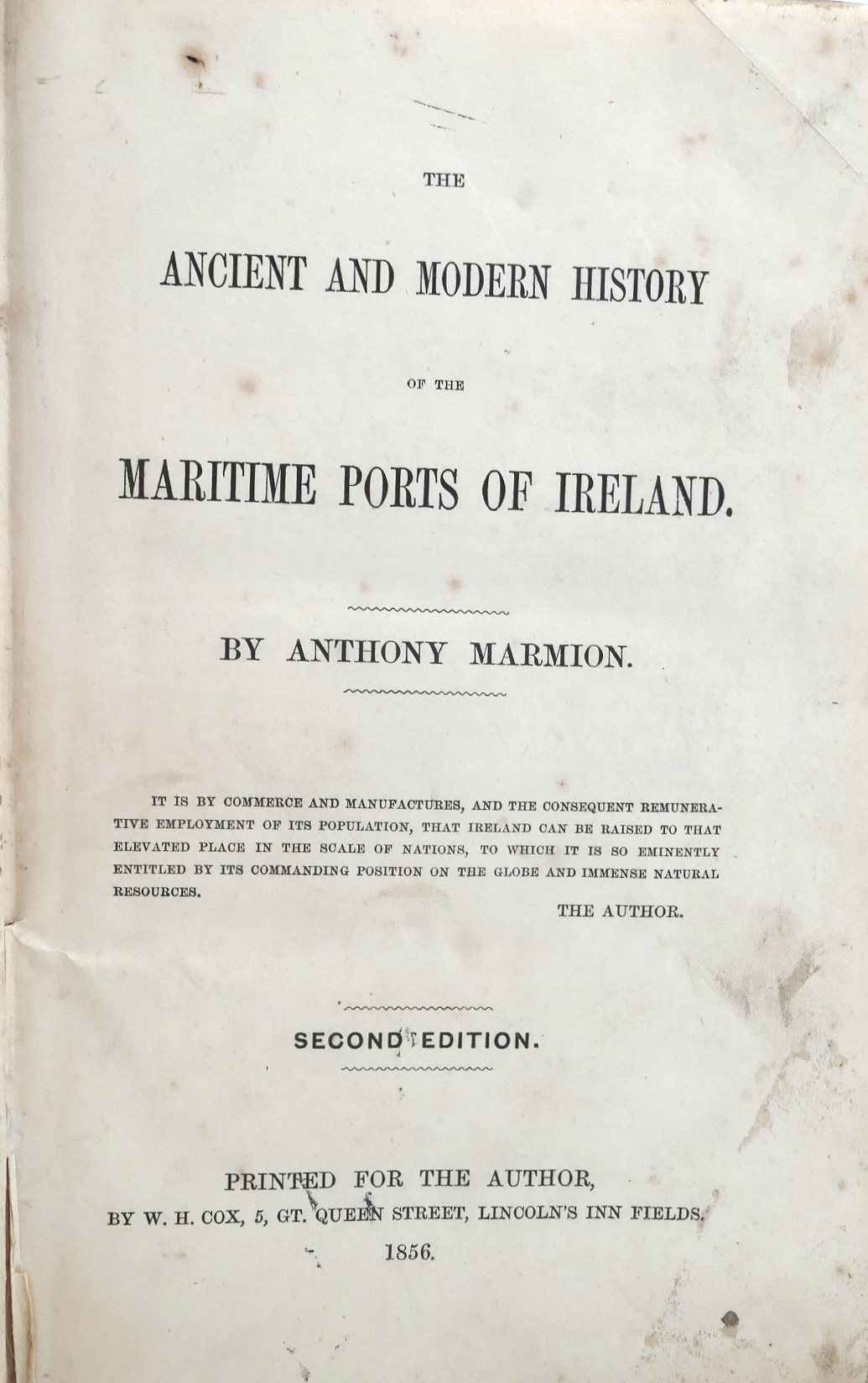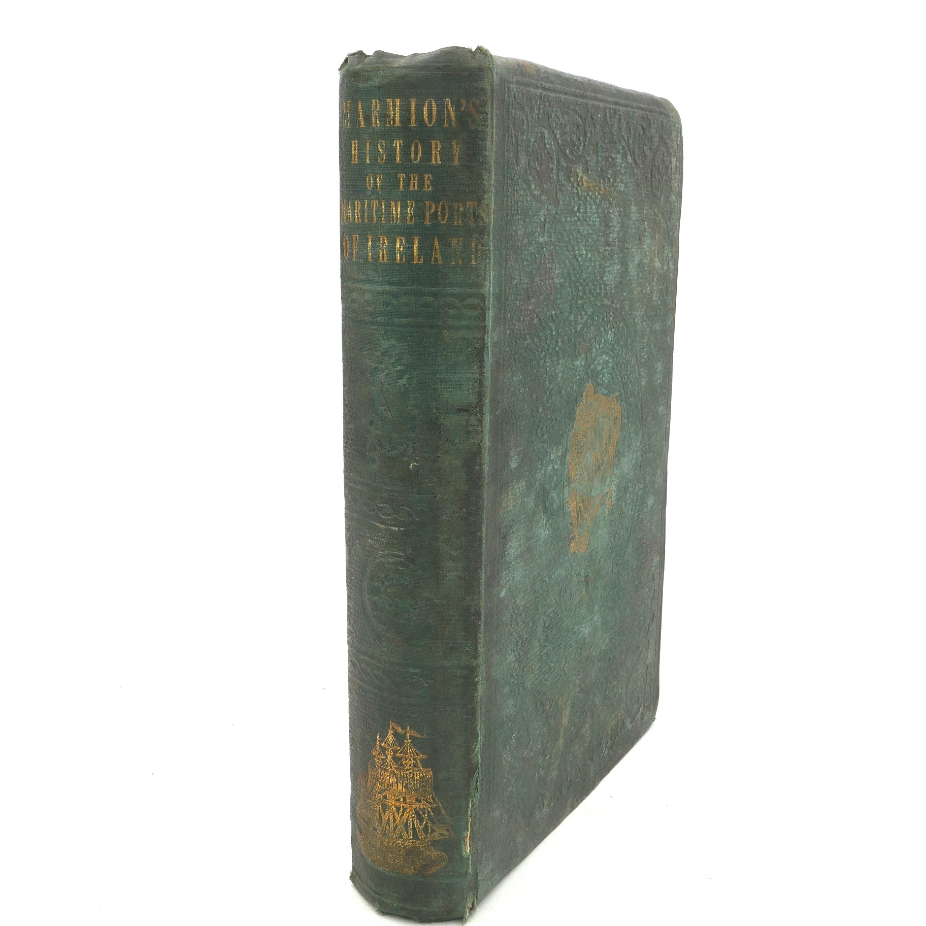 The Ancient and Modern History of The Maritime Ports of Ireland. London: For the Author by W.H. Cox, 1856. Second Edition. Pp iv, 633,[1]. 665. Publisher’s cloth boards, decorated in blind with an attractive Irish harp gilt block to centre of upper board and a ship in full sail illustrated in gilt to lower spine. Covers lightly soiled and faded, lacks front free endpaper, contents pages in good condition.