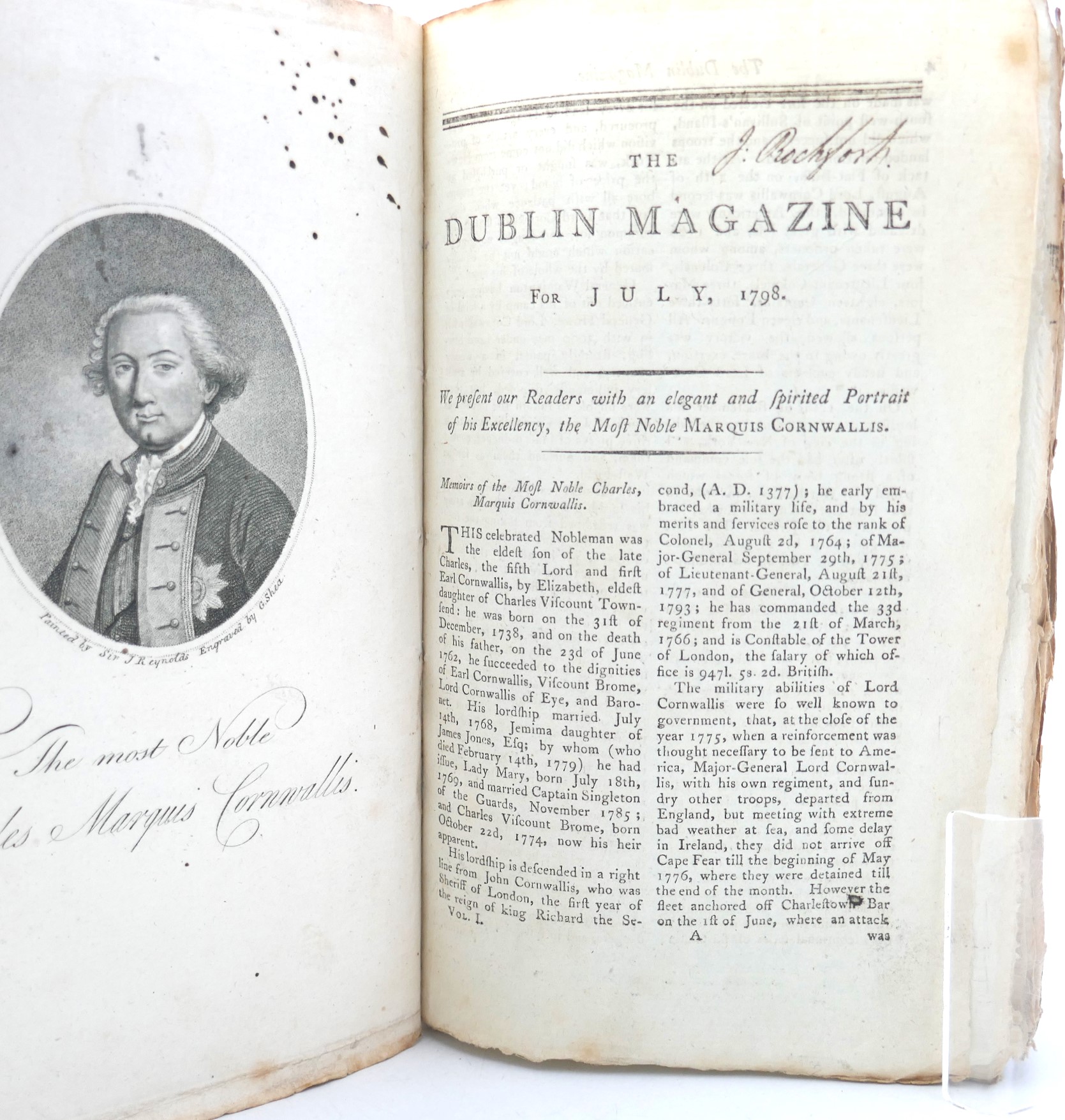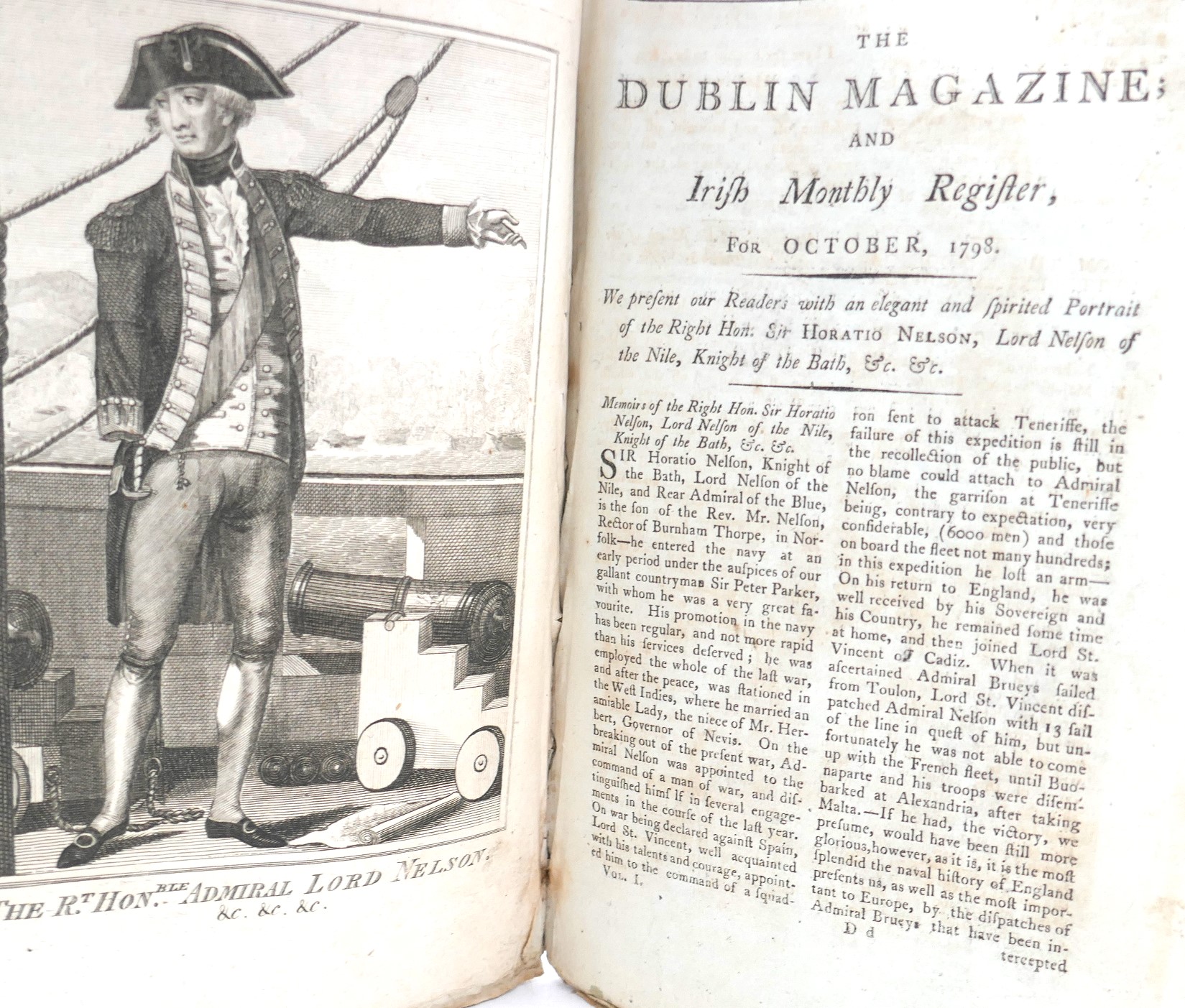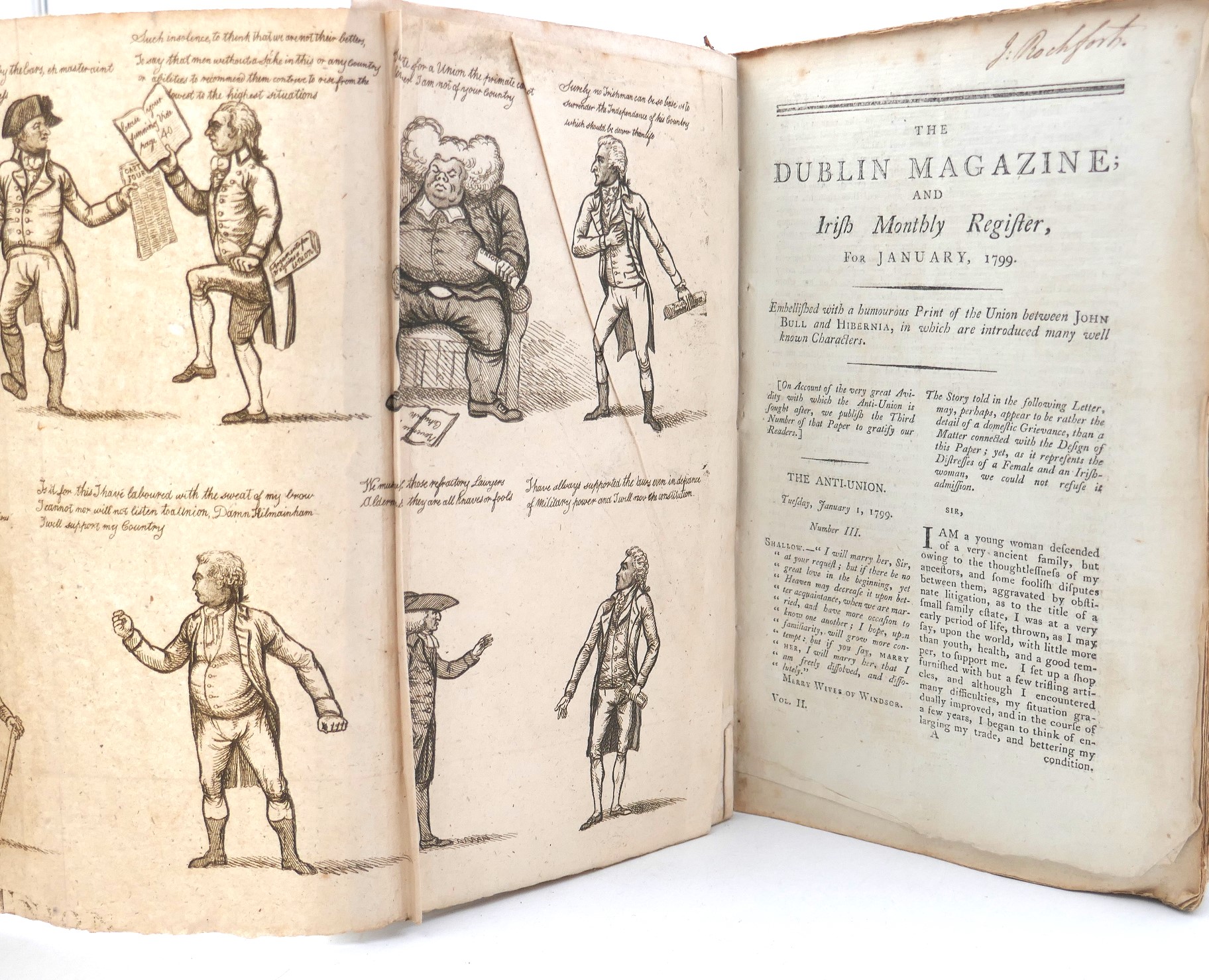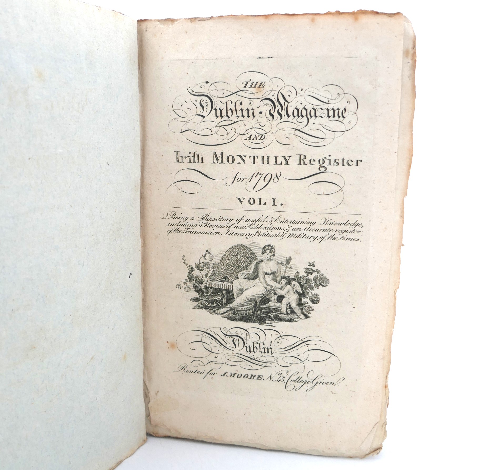 The Dublin Magazine and Irish Monthly Register for 1798 & 1799. Being a Repository of useful & Entertaining Knowledge, including a Review of new Publications & an Accurate register of the Transformations Literary, Political & Military of the Times. Dublin: Printed for J. Moore, 45 College Green. Original quarter calf over marbled boards. Covers lightly scuffed, contents pages in nice bright condition throughout.