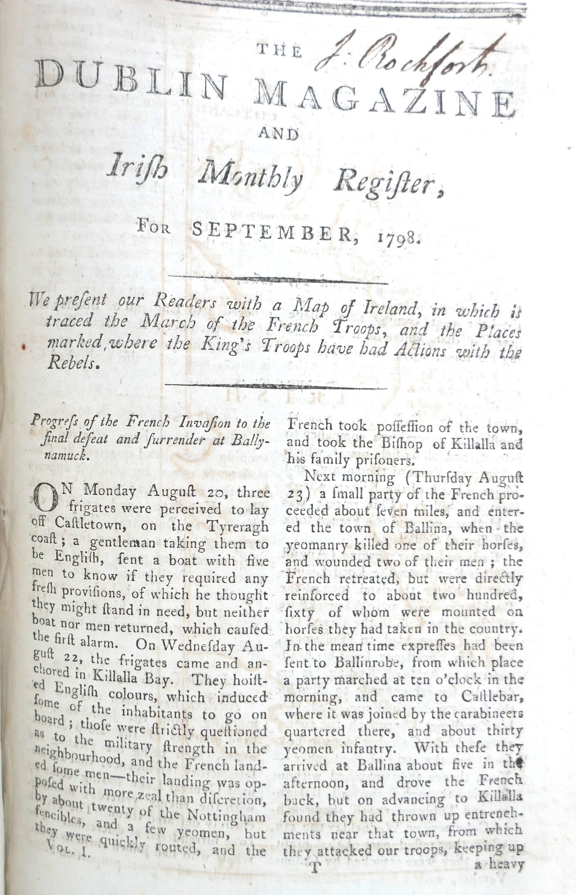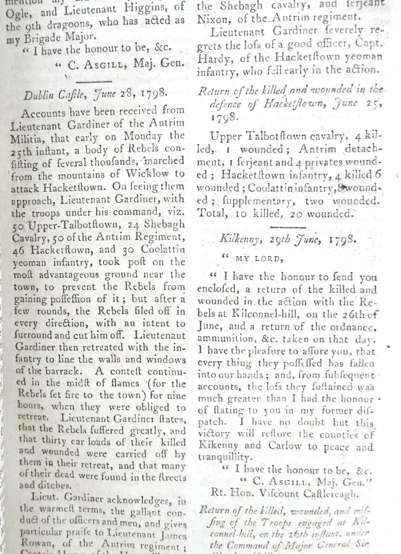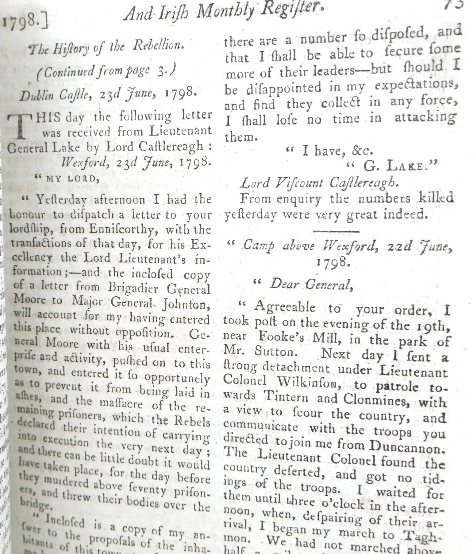 Containing detail reports on the Irish Rebellion of 1798 (24th May – 12th October).