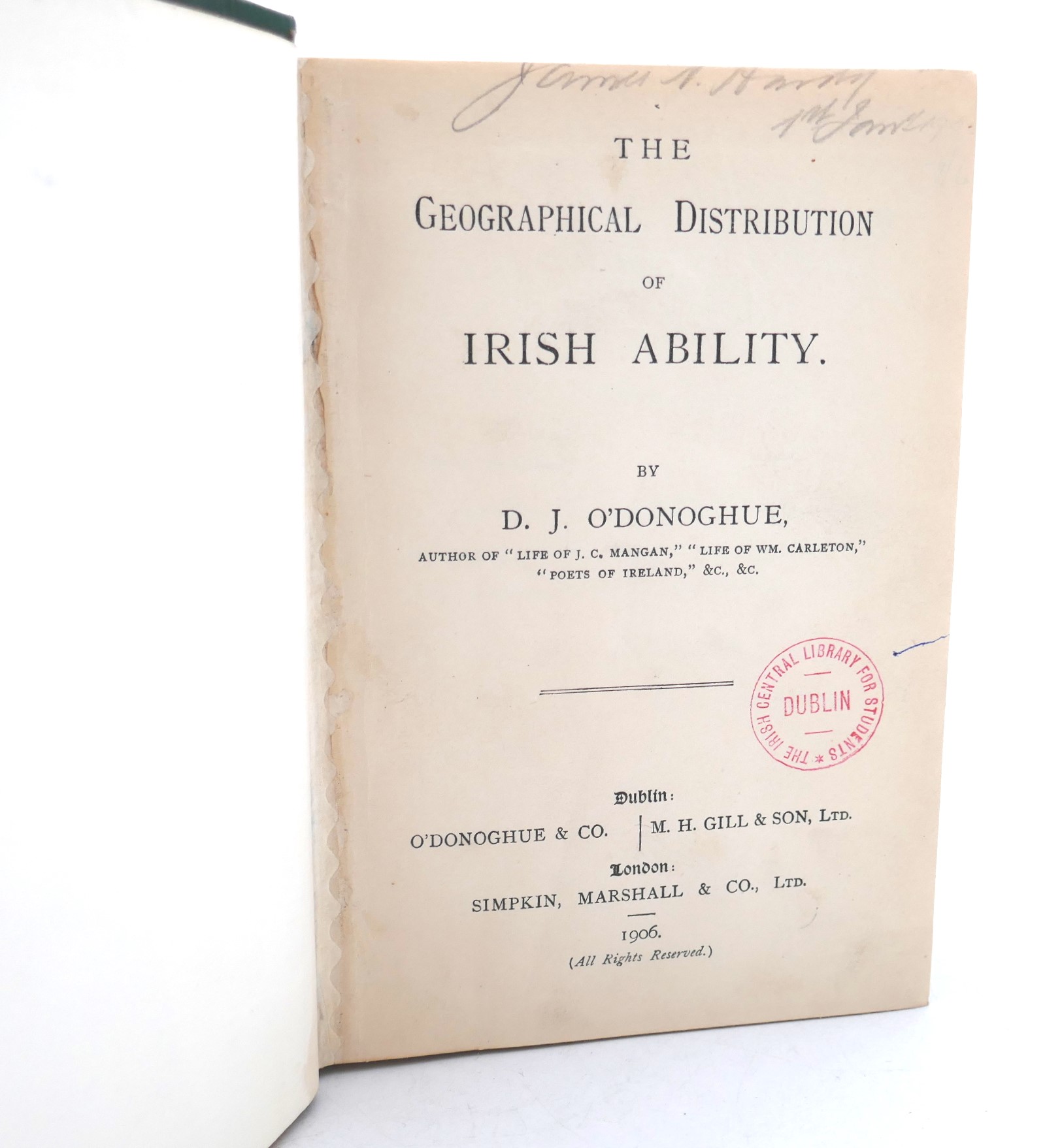 The Geographical Distribution of Irish Ability. Dublin: Gill, 1906. First Edition. Pp xvii, 333. Ex library copy with stamps in a library cloth binding, otherwise in very good condition.